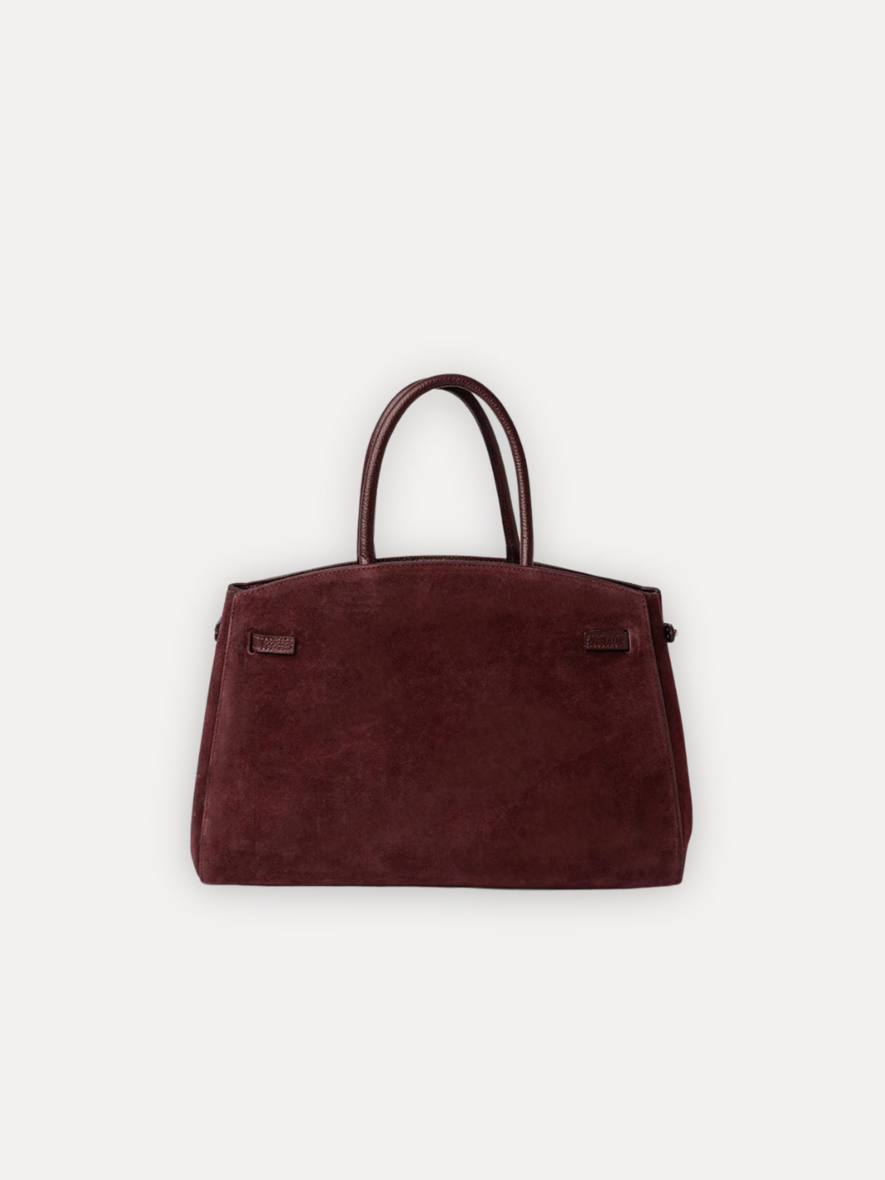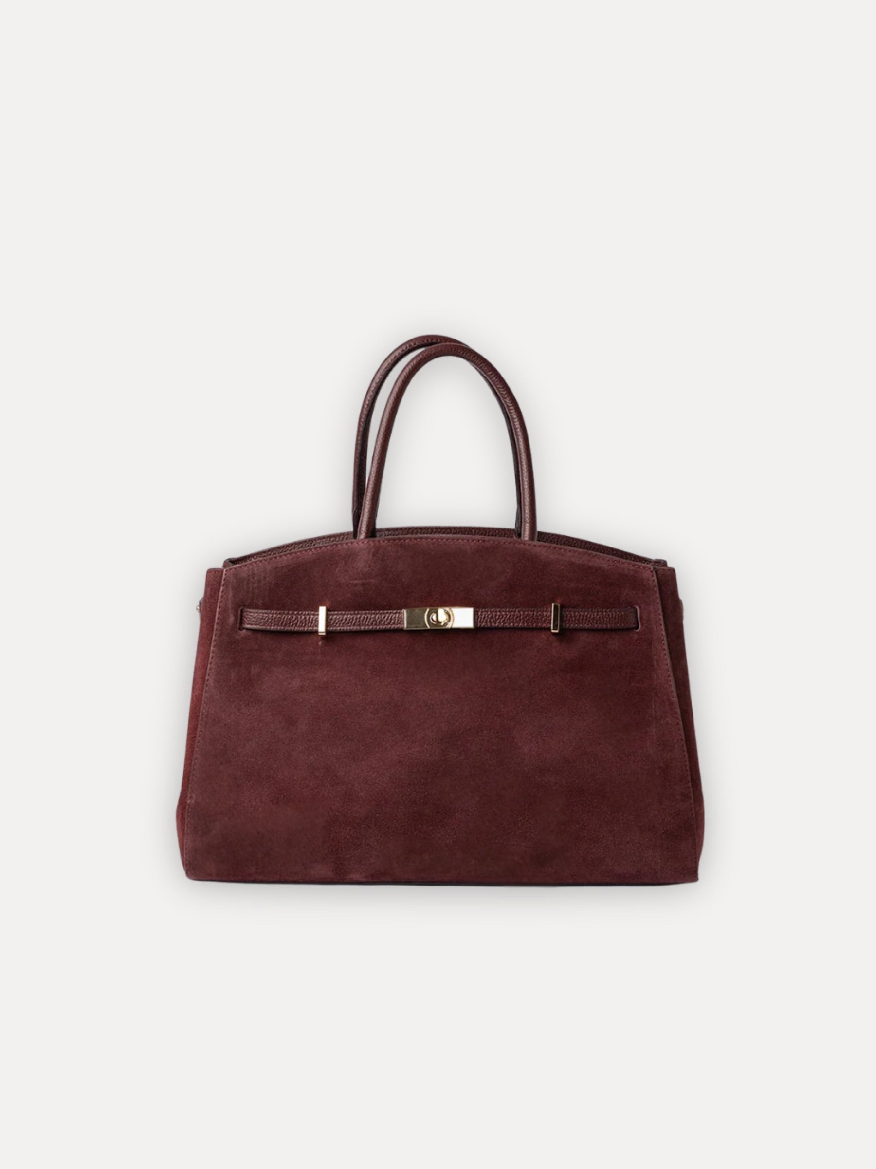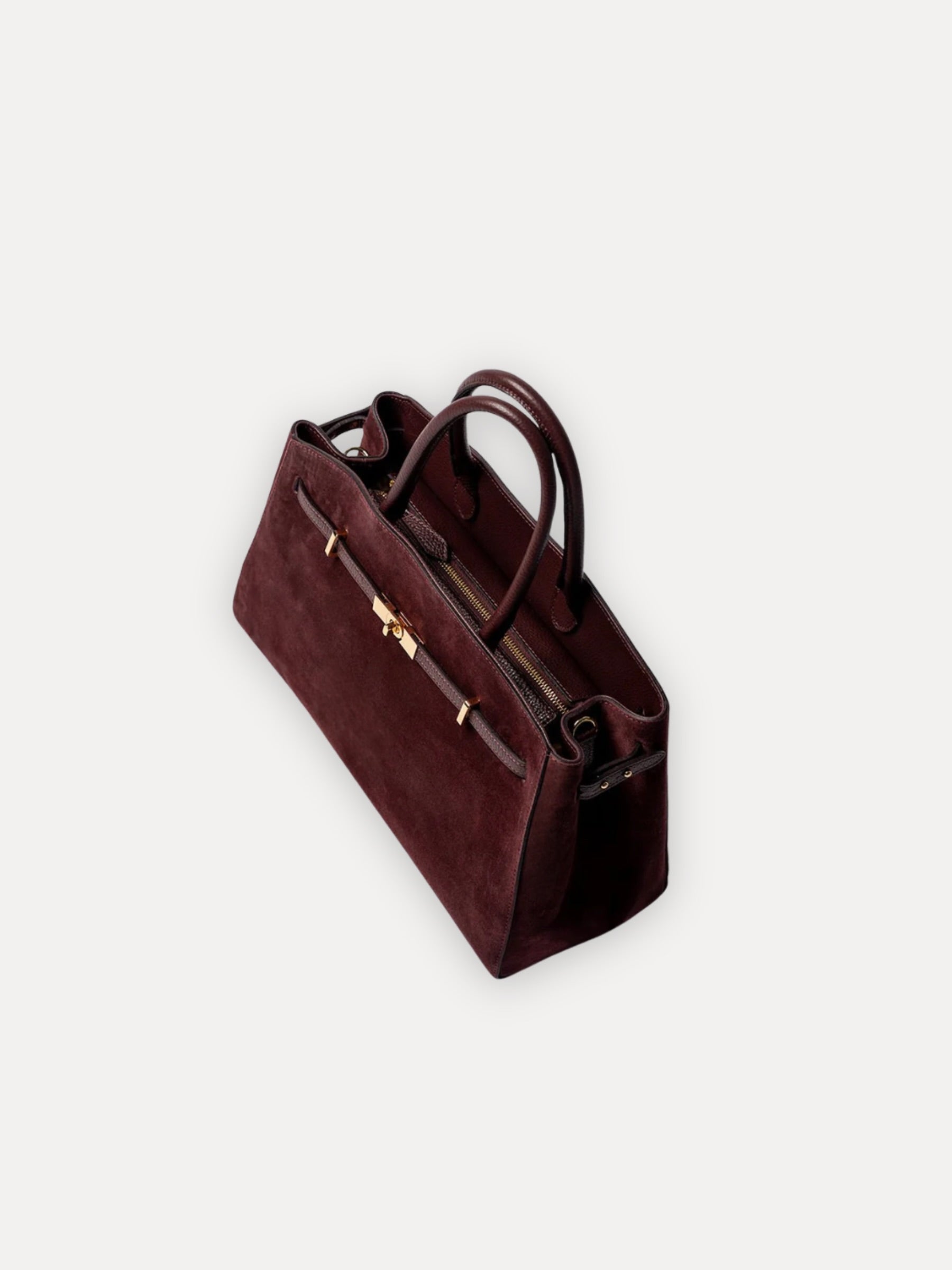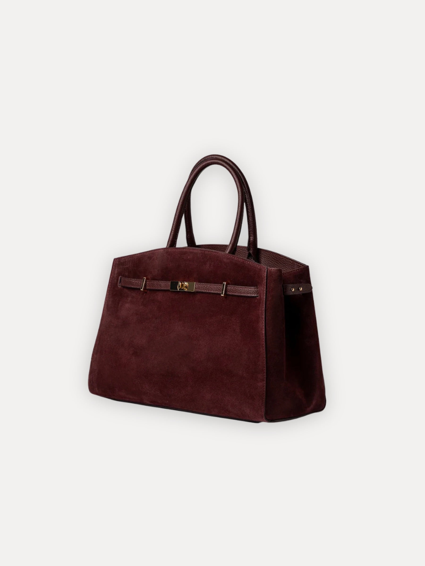 Elevated and versatile, the Velvet Espresso suede tote balances sophistication with everyday function. Crafted in Italy, it features a supple suede body framed with grained leather at the upper panel, handles, and detailing — adding refinement and durability.