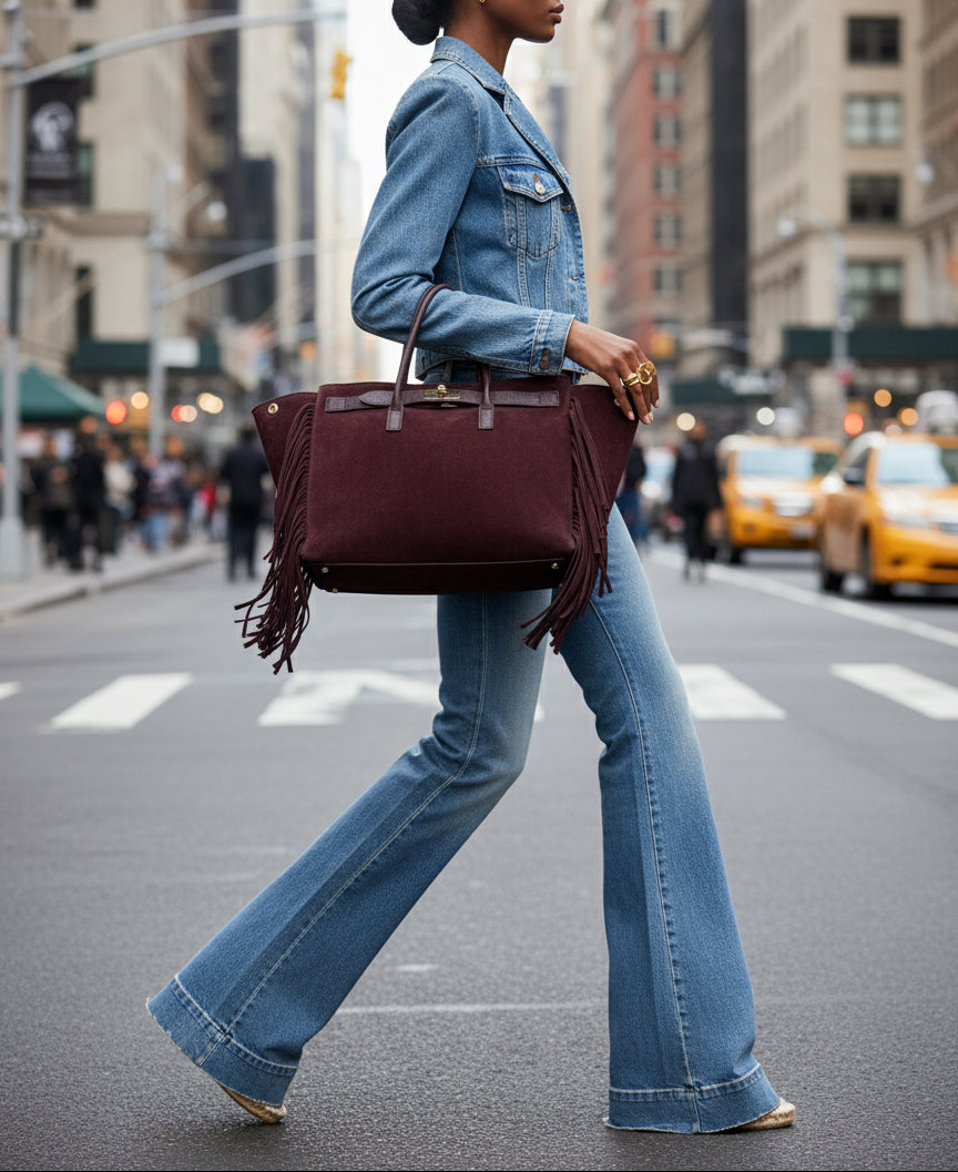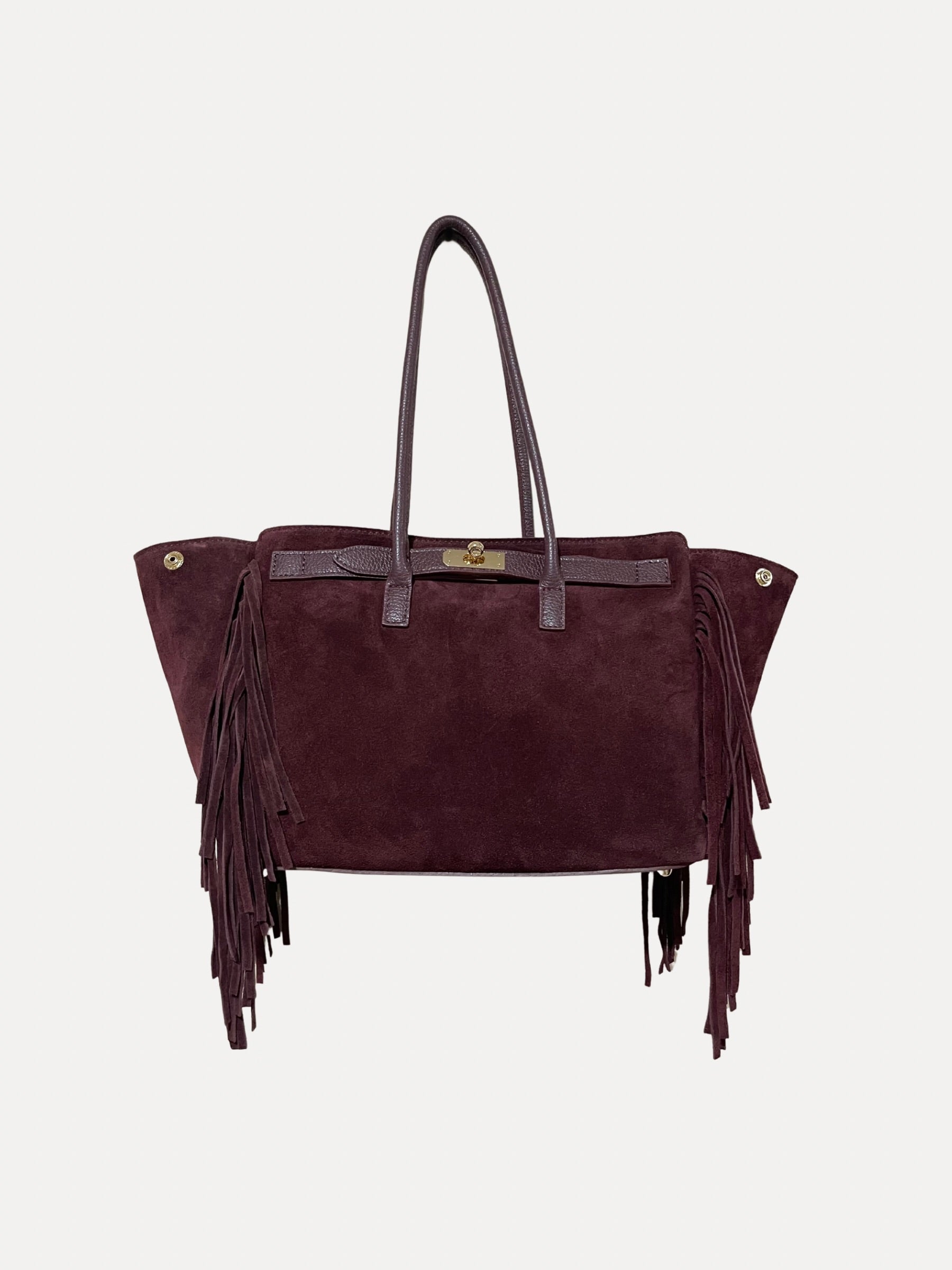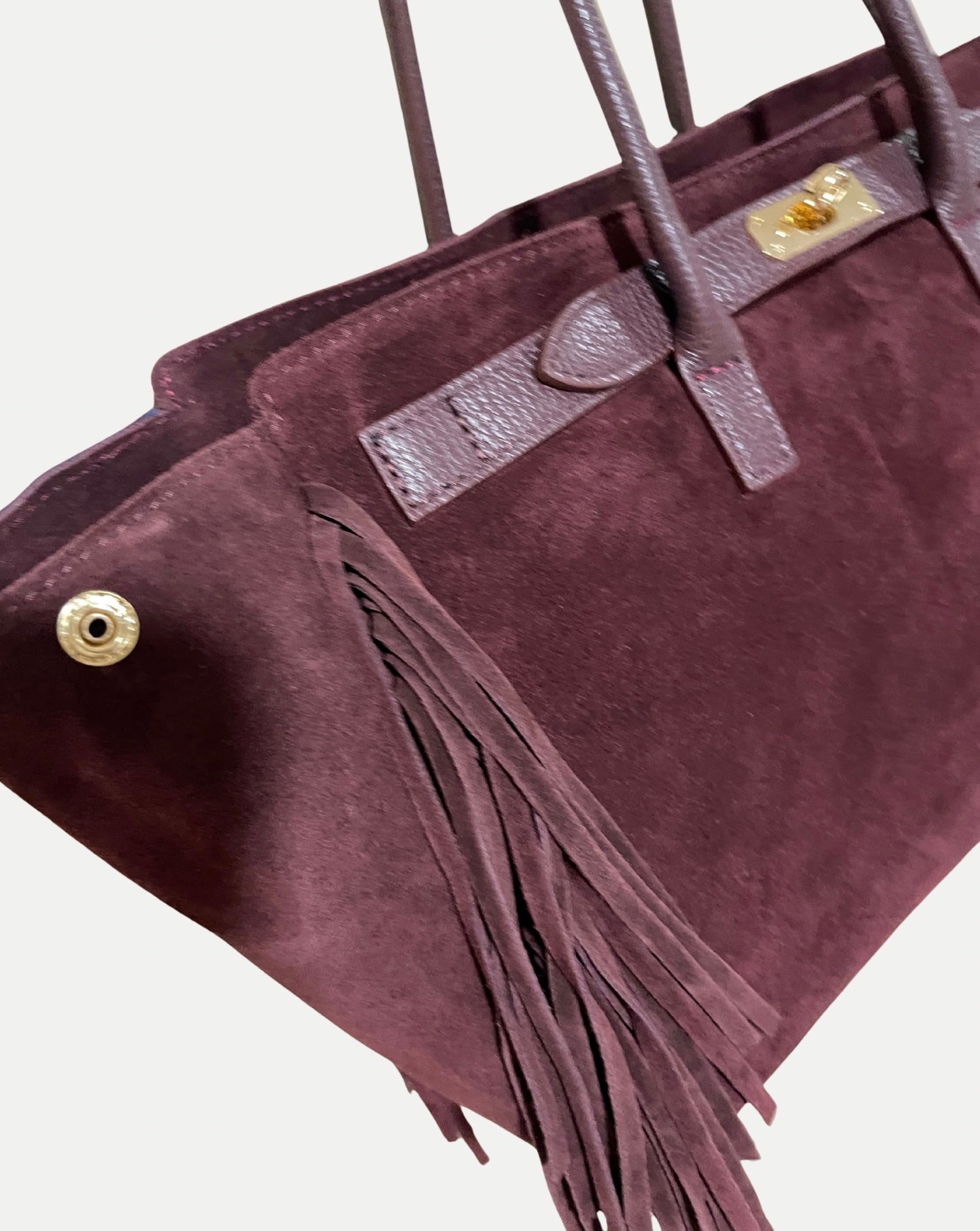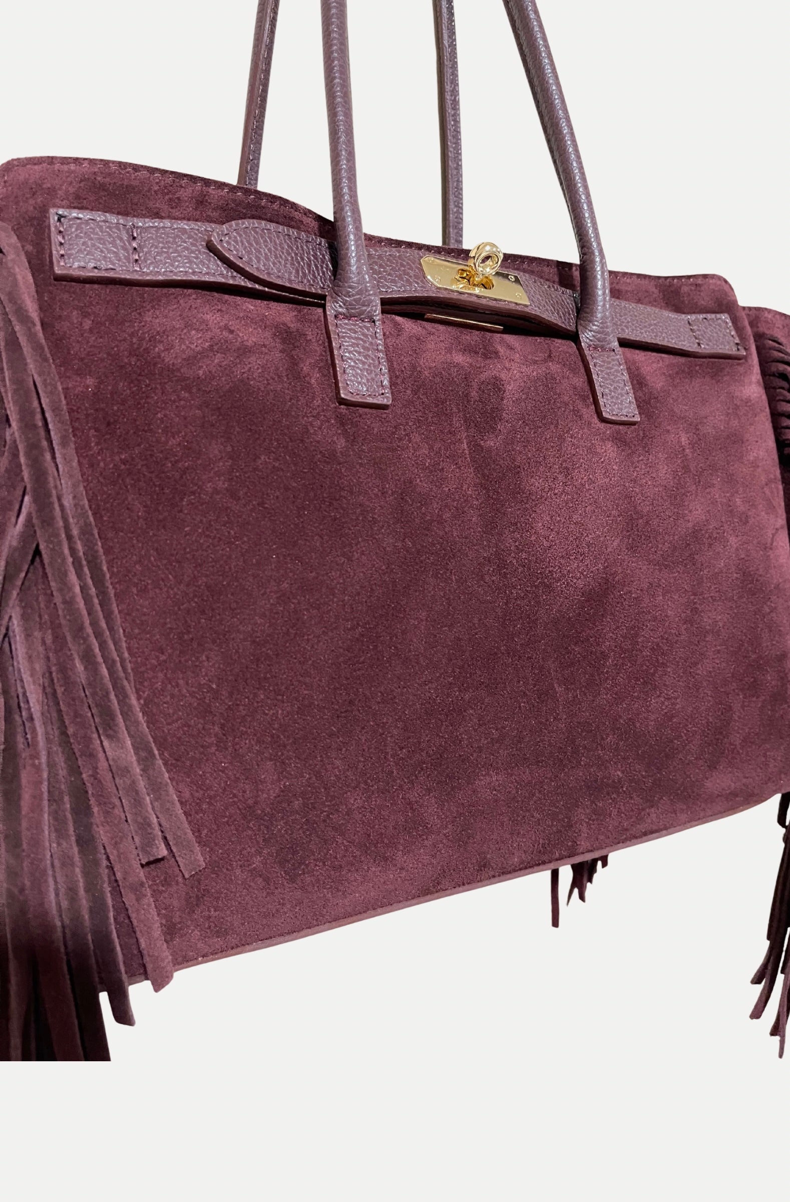 A modern icon with a touch of edge — this genuine suede tote redefines everyday luxury. Designed for the woman who moves with purpose and style, it features bold fringe detailing that runs effortlessly along the front and back seams, creating dynamic texture and movement.