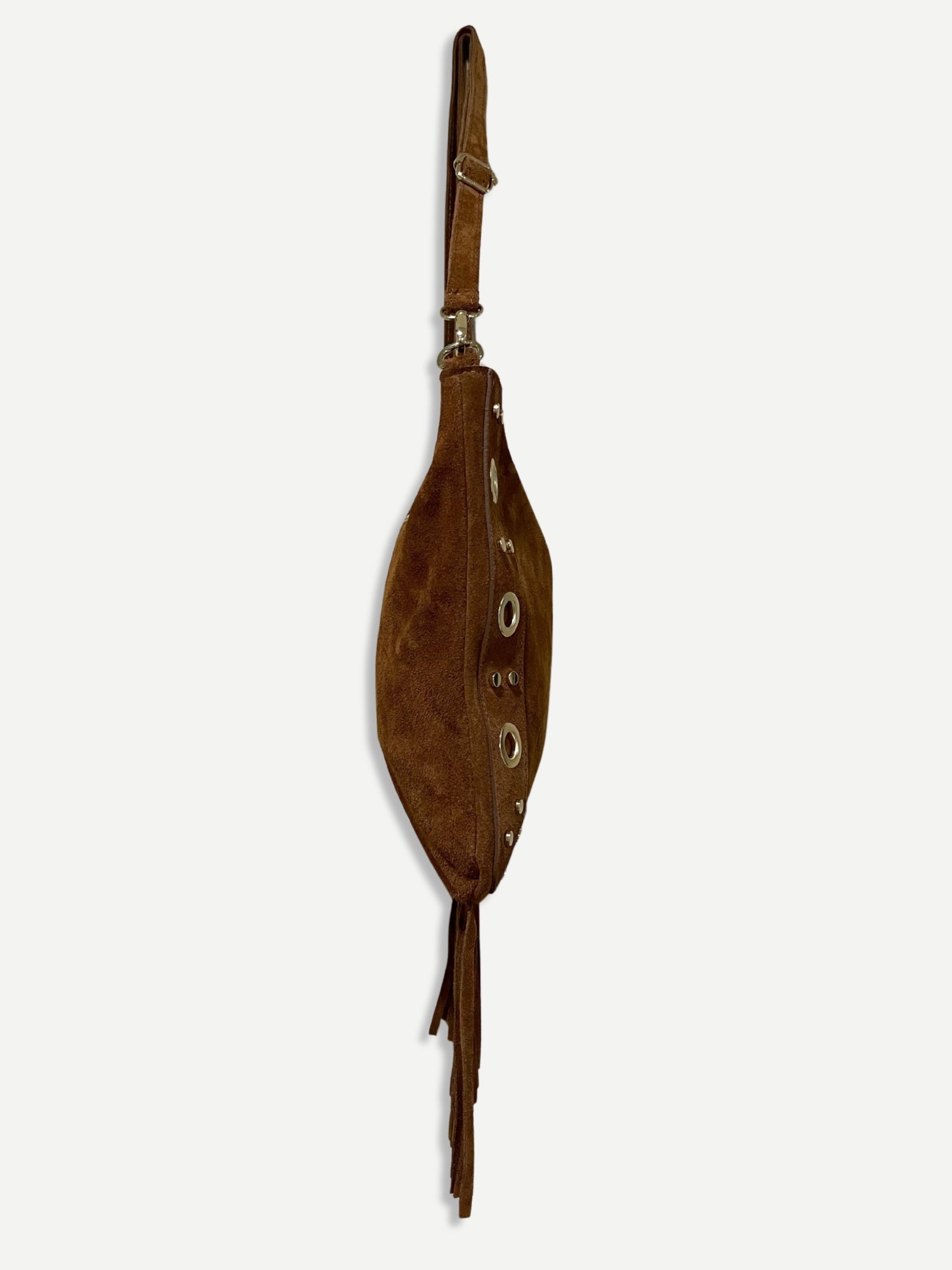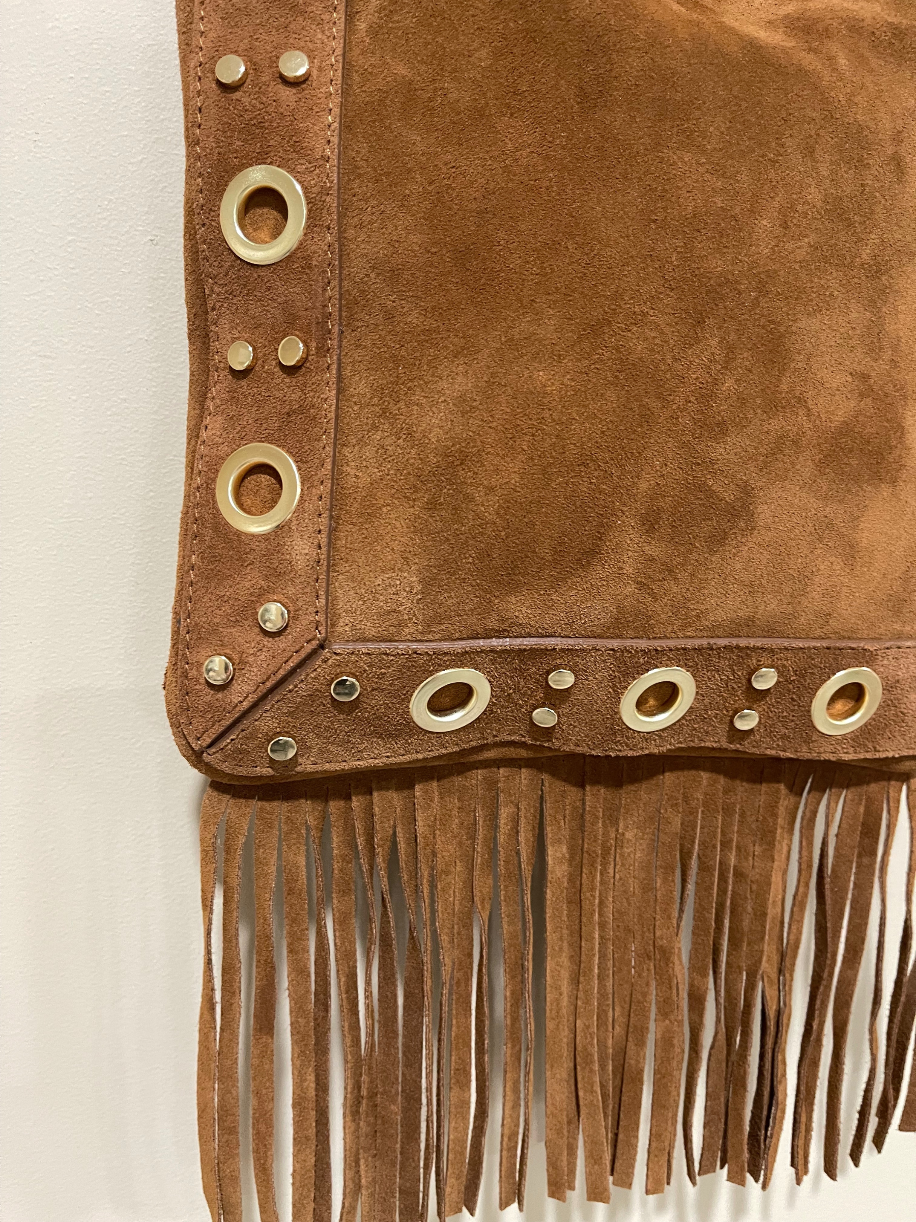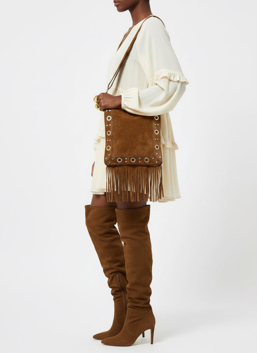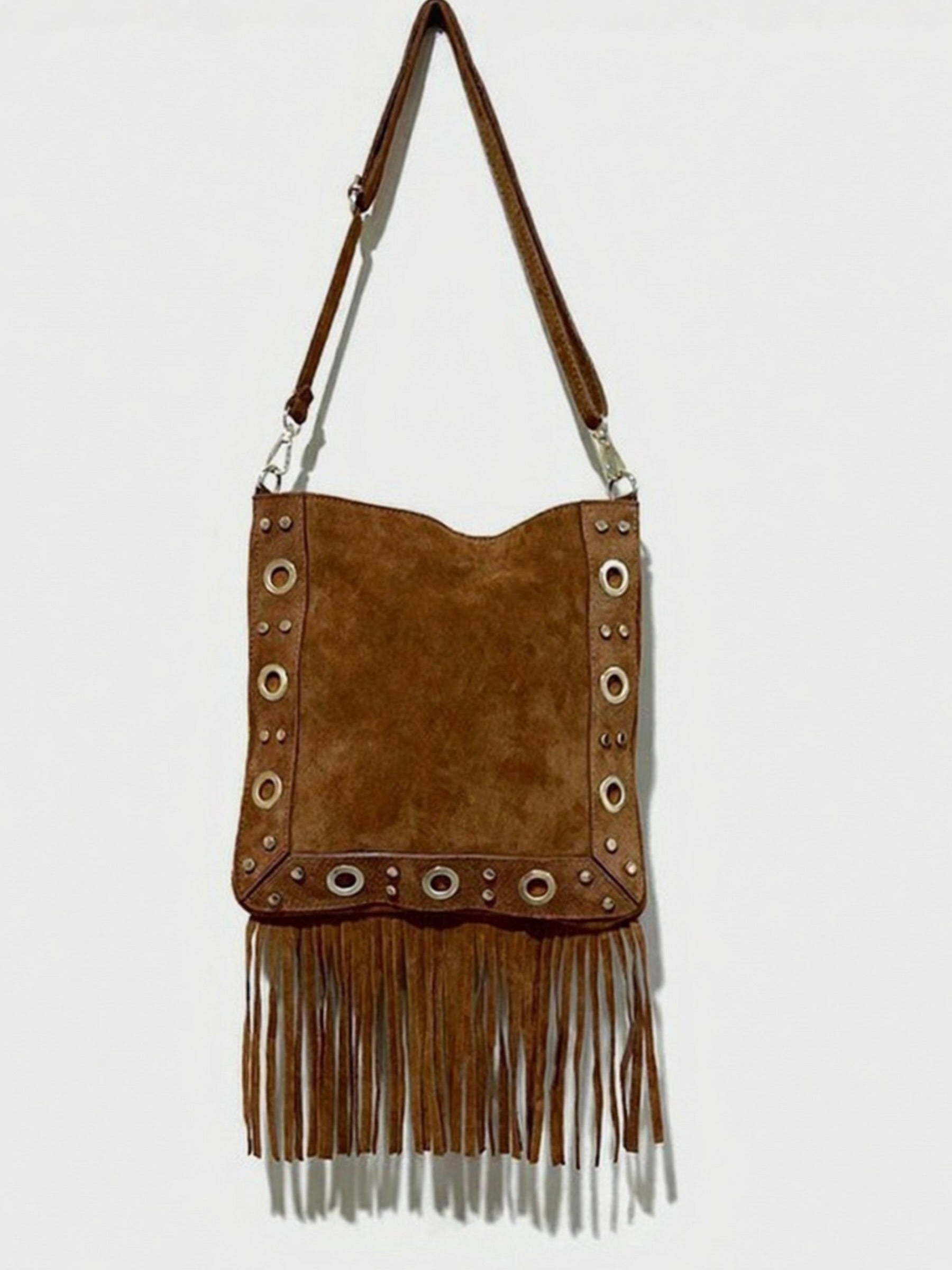 A statement in motion—this gorgeous suede fringe bag embodies effortless edge and bohemian sophistication. Crafted from supple suede, it features cascading fringe that sways with every step, accented by gold-tone rivets and ball-stud detailing for a touch of rock-chic glamour.