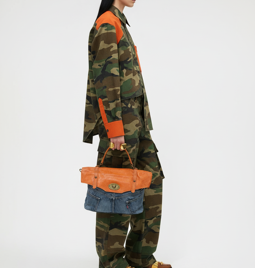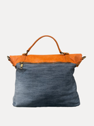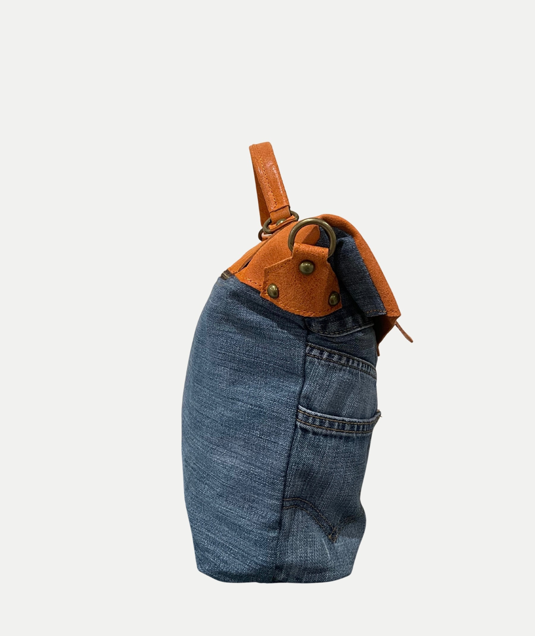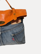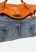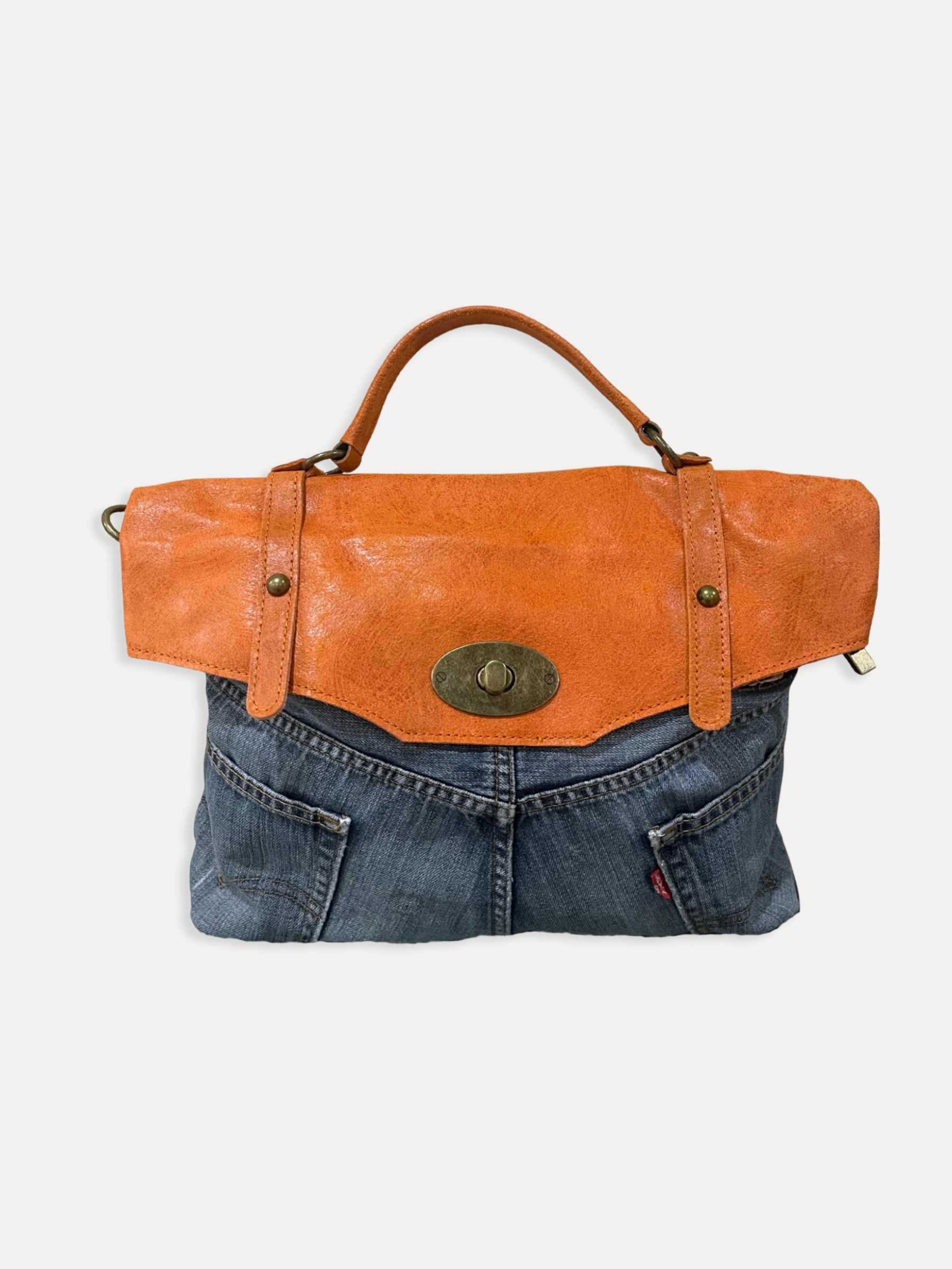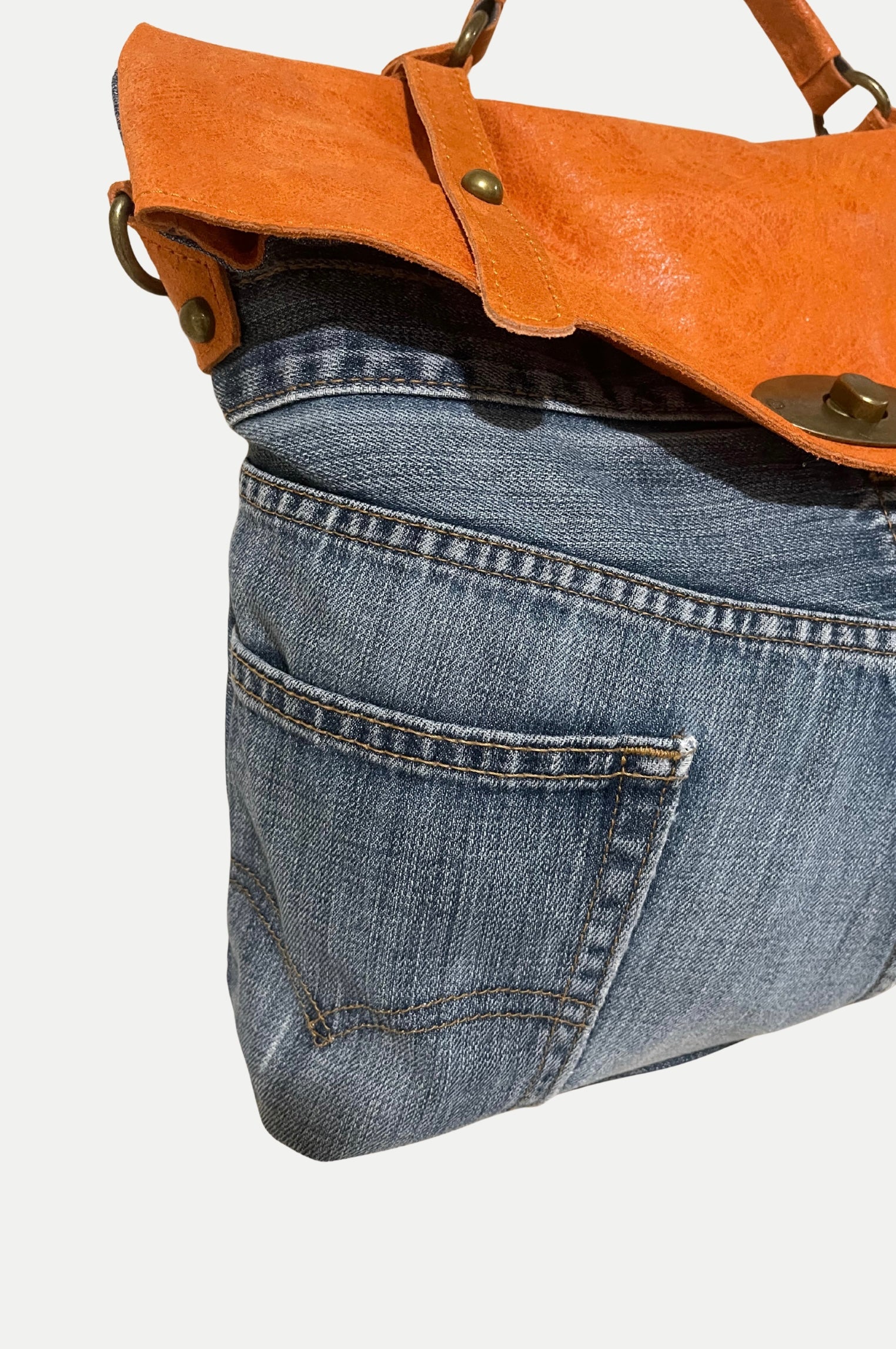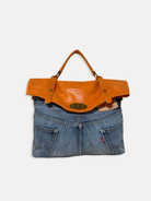Introducing our Orange Leather & Denim Satchel Bag, a beautifully crafted accessory that blends vintage charm with contemporary style. Made from vintage denim, each bag is truly unique, with no two designs ever being the same. The bag features antique bronzed hardware that adds a sophisticated, timeless touch to its look.