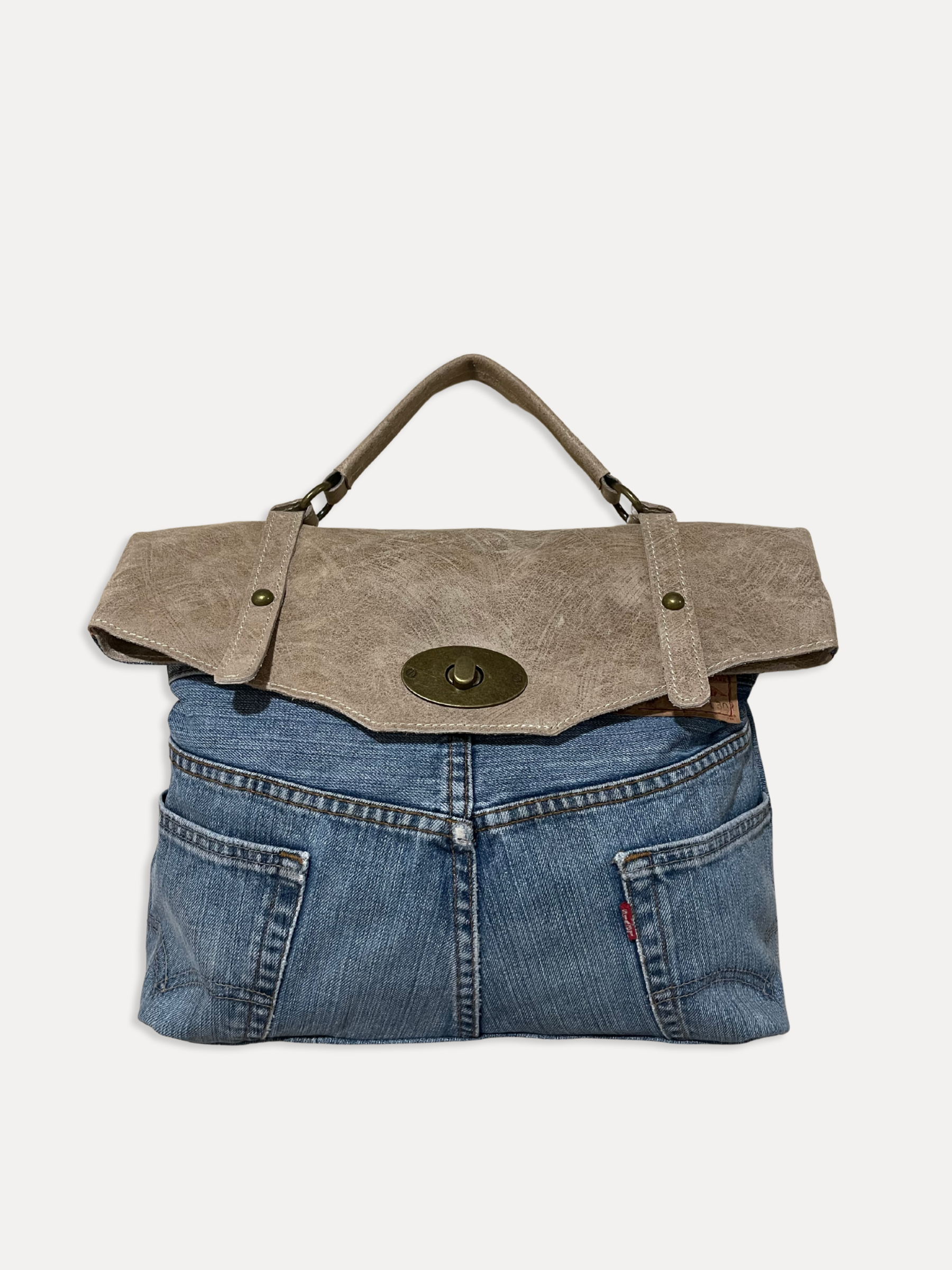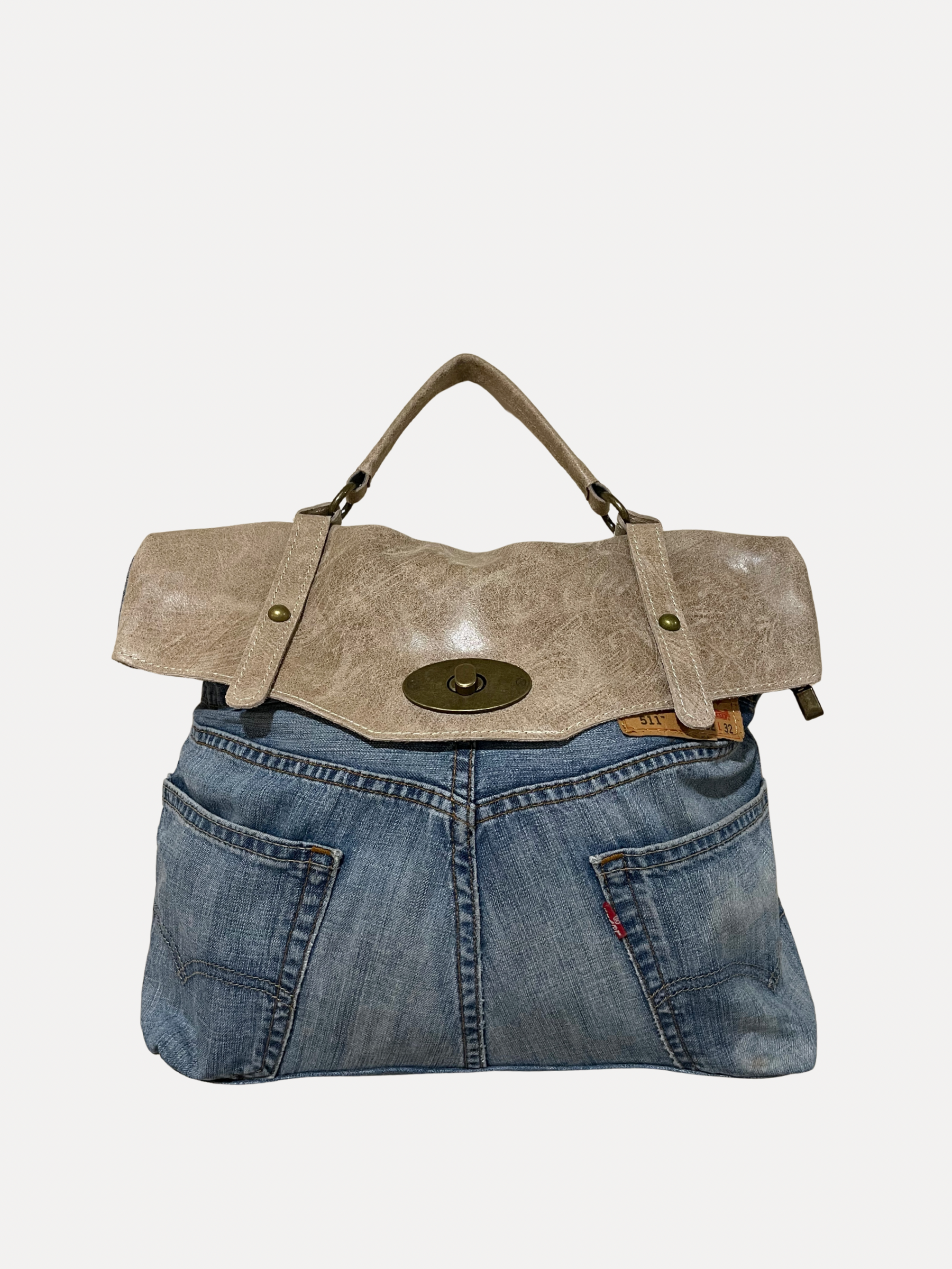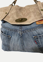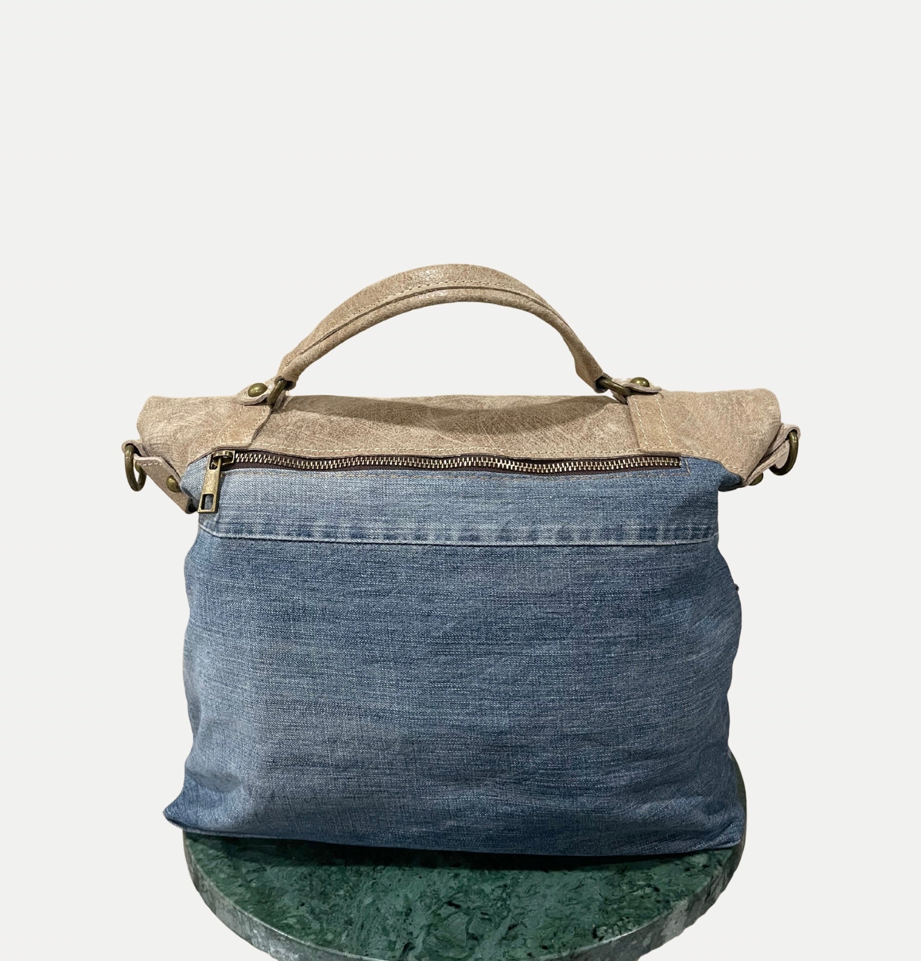 Introducing the handcrafted Taupe Denim Handbag—where artisanal craftsmanship meets timeless luxury with a bit of an edge. Expertly handcrafted from repurposed vintage denim and distressed taupe calf leather, each bag is a unique masterpiece. No two are alike; the variations in wash, texture, and hue reflect, denim pockets detailing reflect the individuality of the materials, making every bag truly one-of-a-kind. The sturdy bronze hardware adds a touch of timeless elegance, ensuring durability and style for years to come.