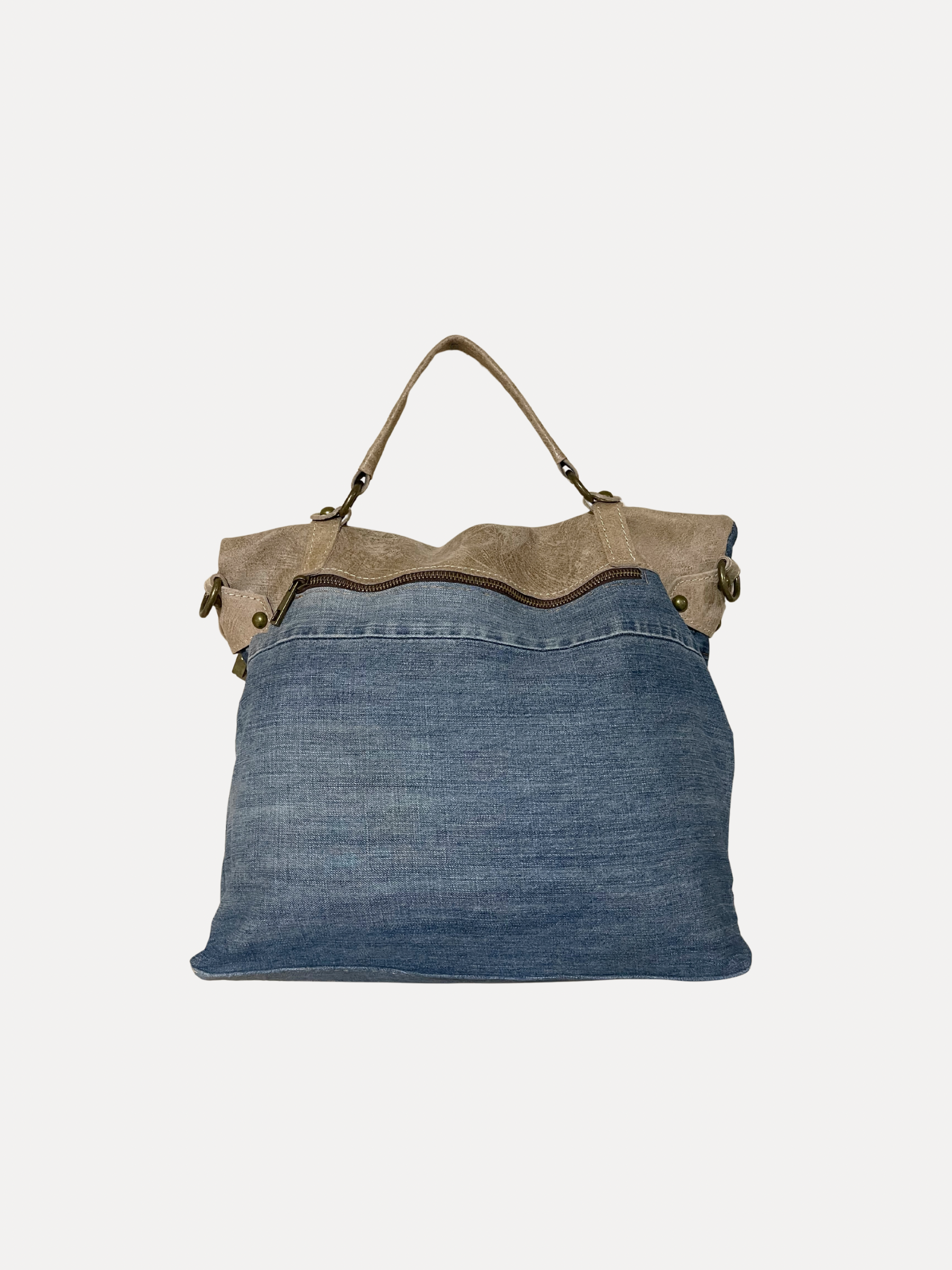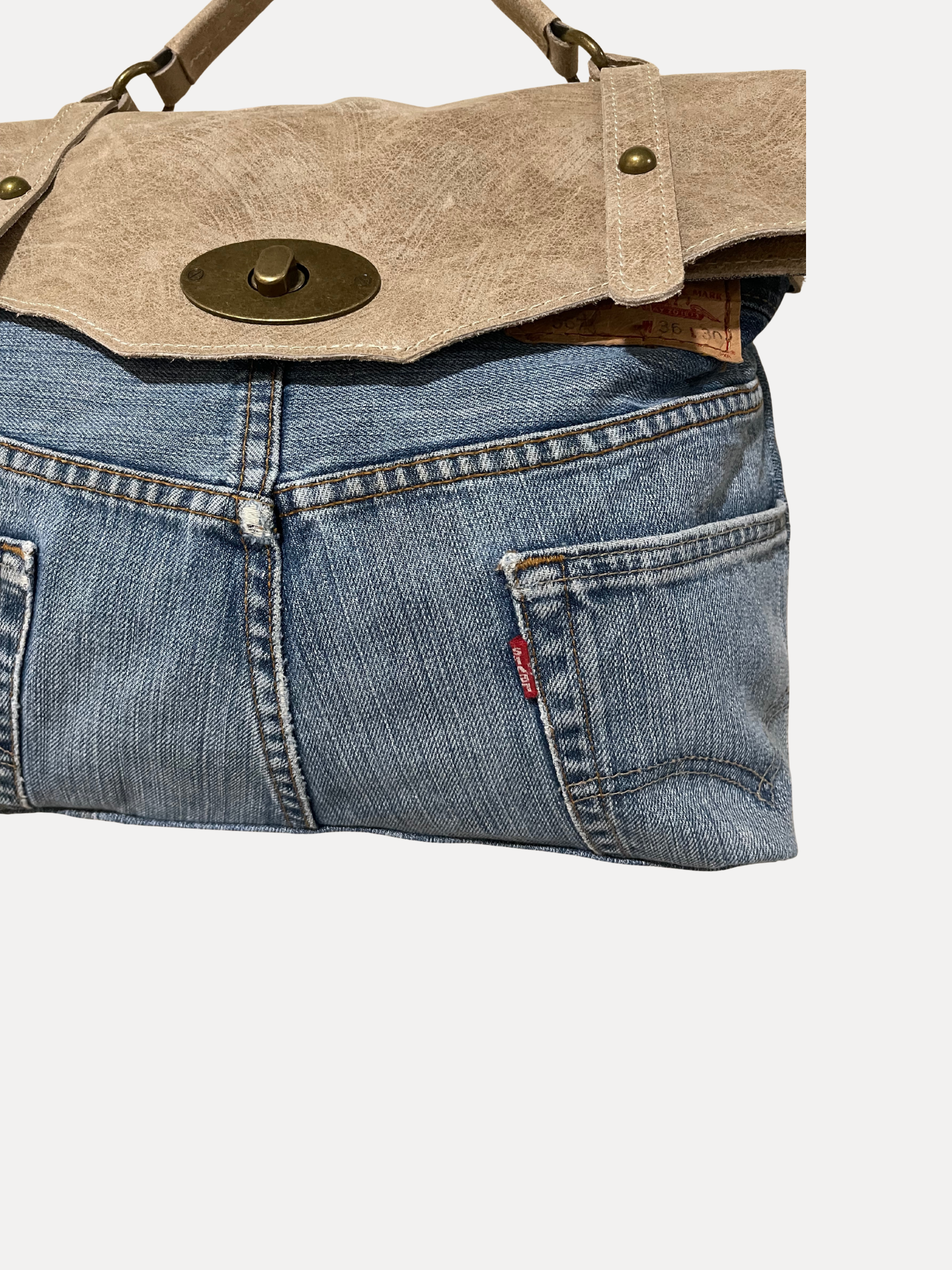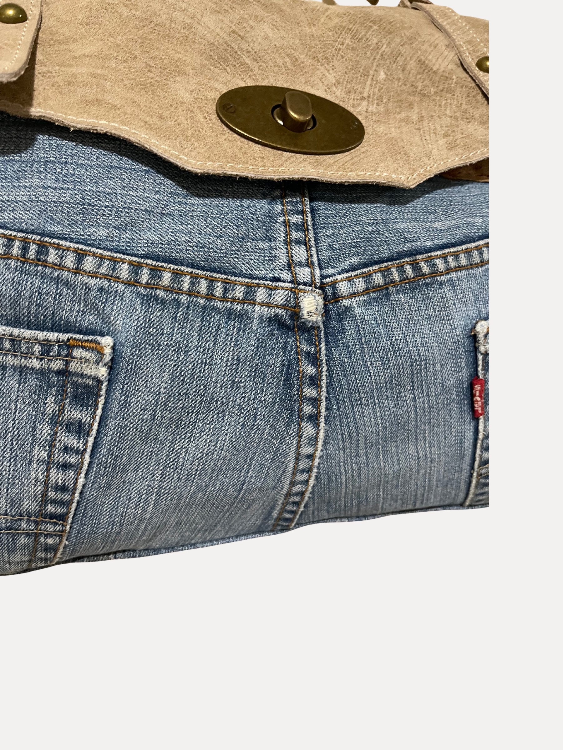 Introducing the handcrafted Taupe Denim Handbag—where artisanal craftsmanship meets timeless luxury with a bit of an edge. Expertly handcrafted from repurposed vintage denim and distressed taupe calf leather, each bag is a unique masterpiece. No two are alike; the variations in wash, texture, and hue reflect, denim pockets detailing reflect the individuality of the materials, making every bag truly one-of-a-kind. The sturdy bronze hardware adds a touch of timeless elegance, ensuring durability and style for years to come.