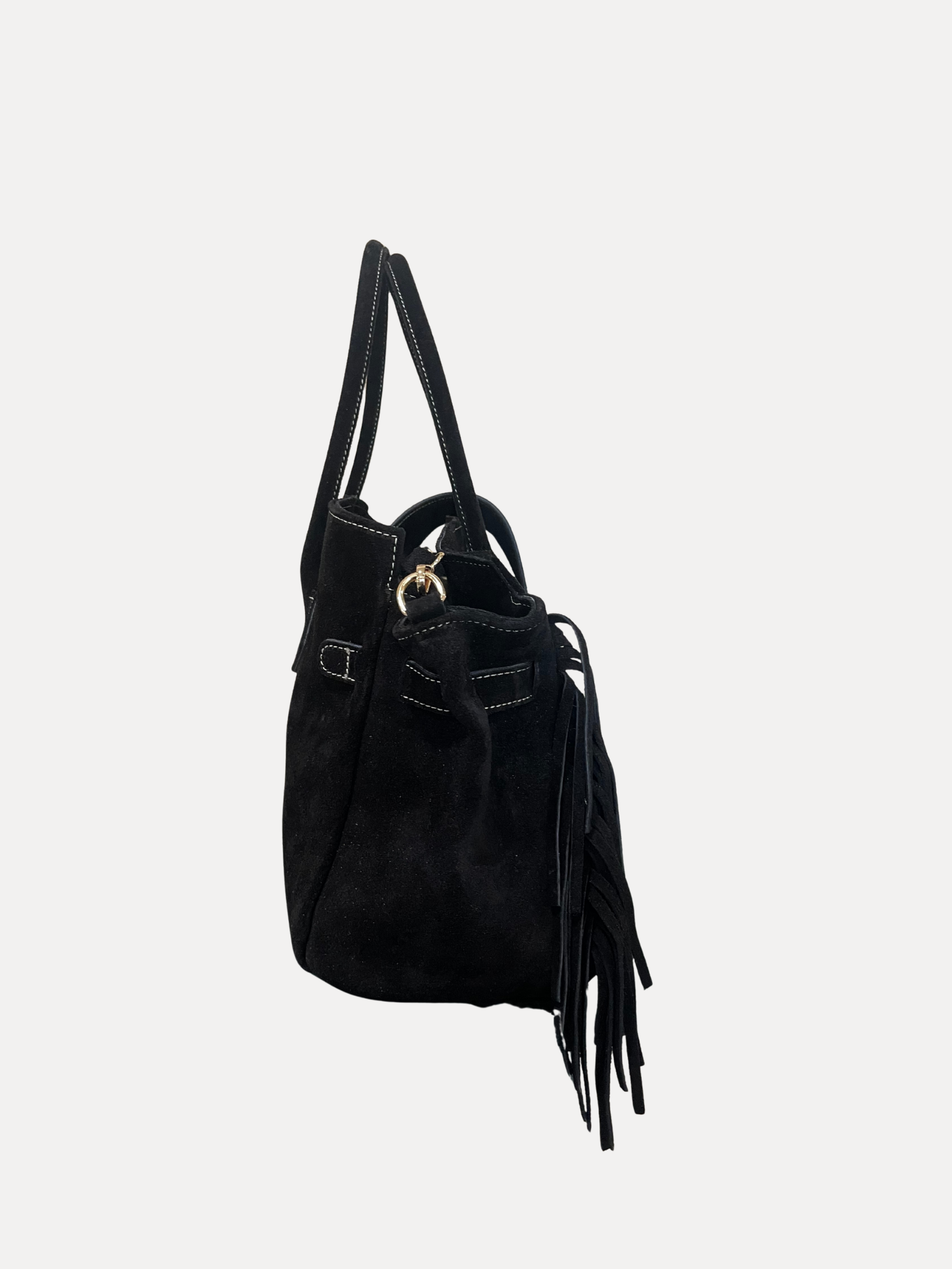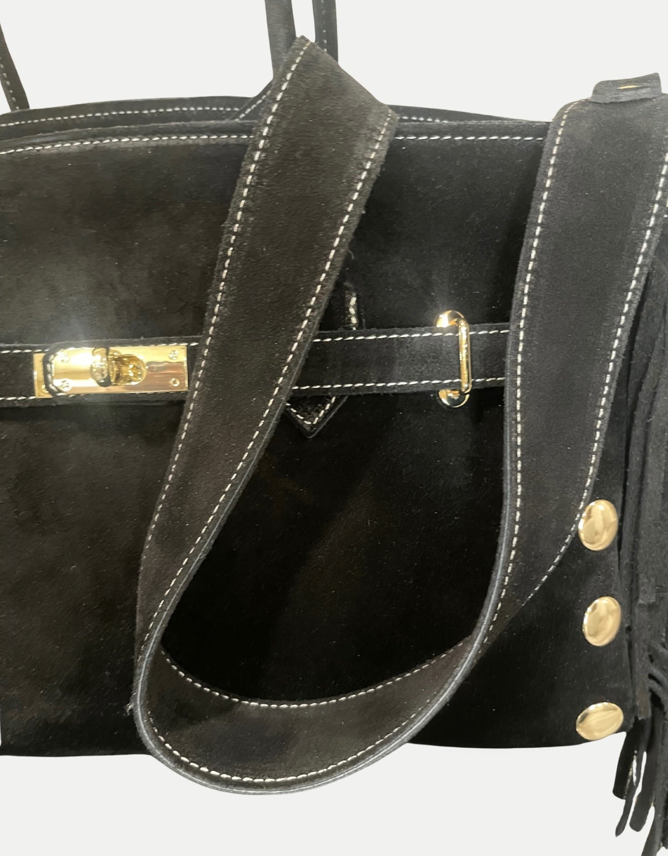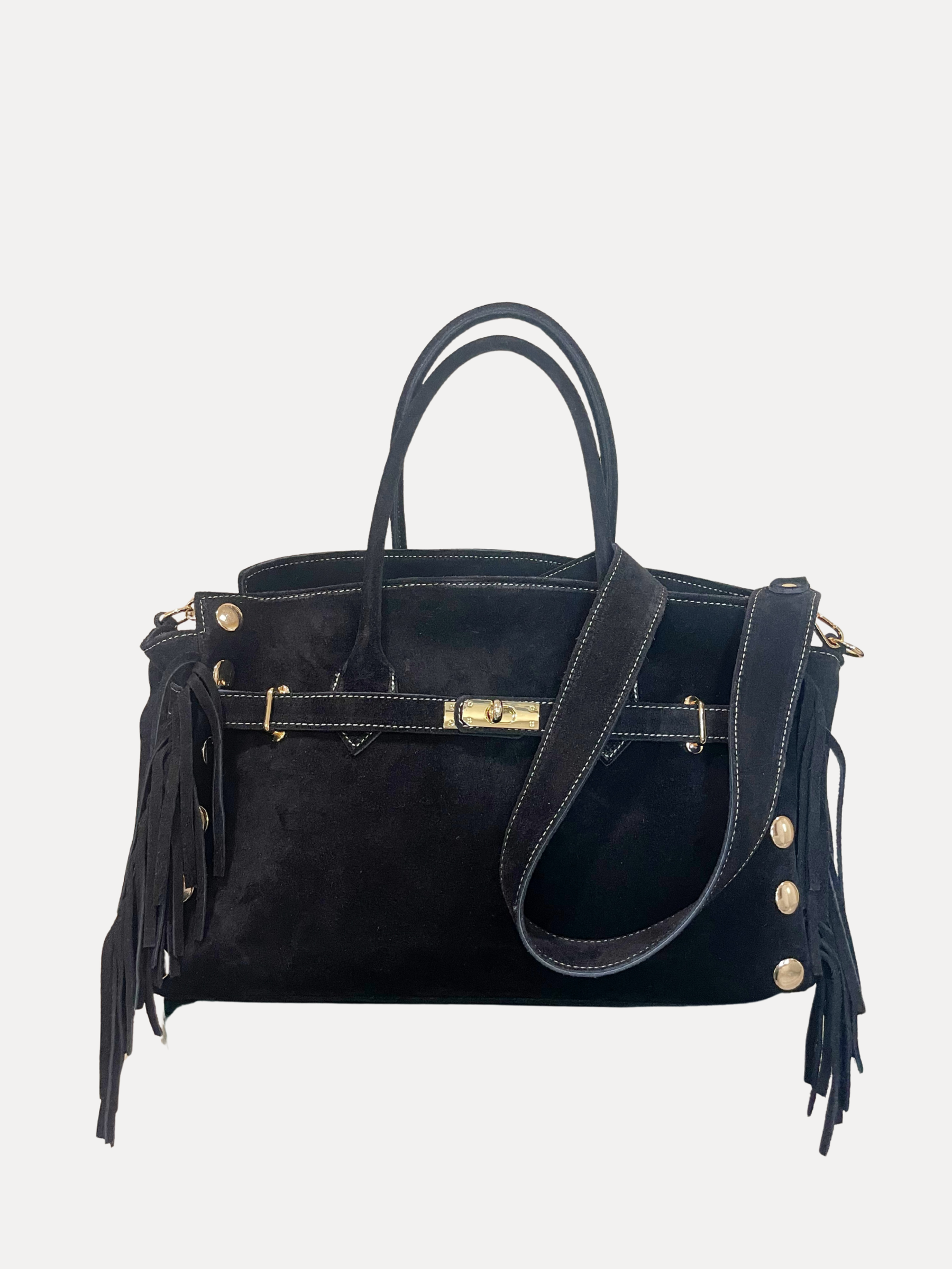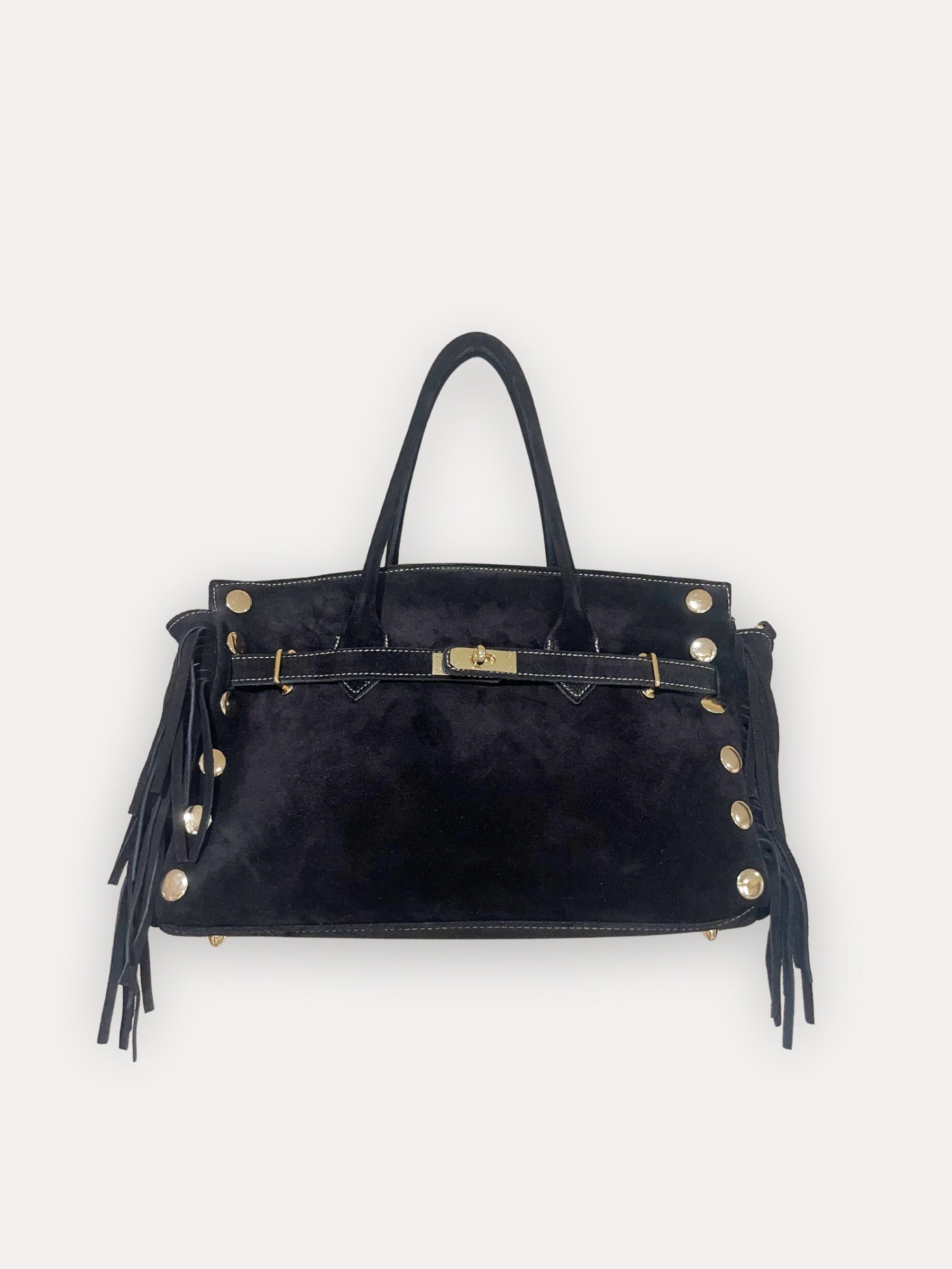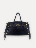 A statement piece designed to turn heads. Crafted in genuine black suede, this handbag redefines classic chic with a modern edge.This handbag takes the classic silhouette to the next level with fringe trimming along the front, finished with a touch of gold-tone metal studs and a striking chunky twist-lock closure.