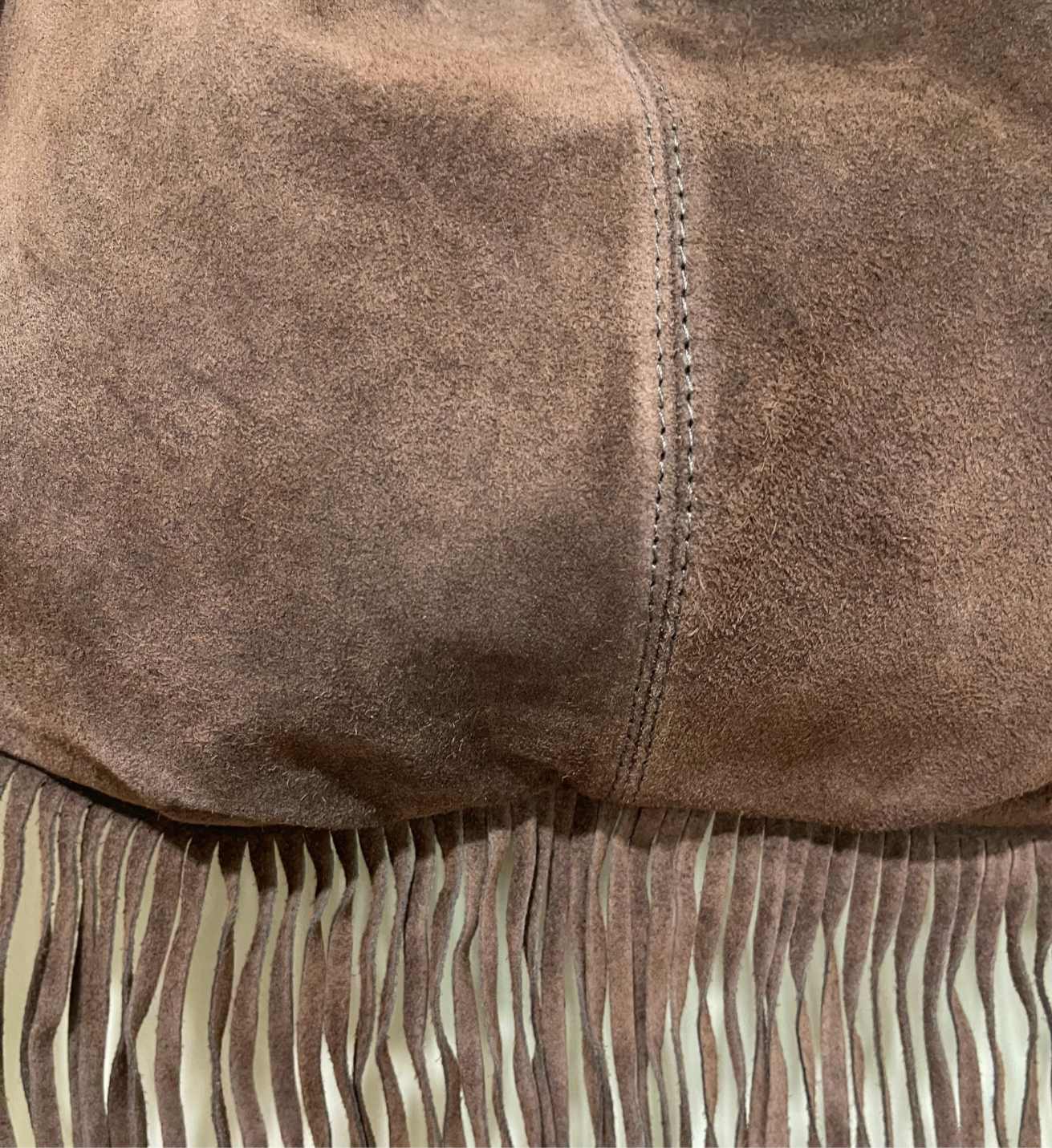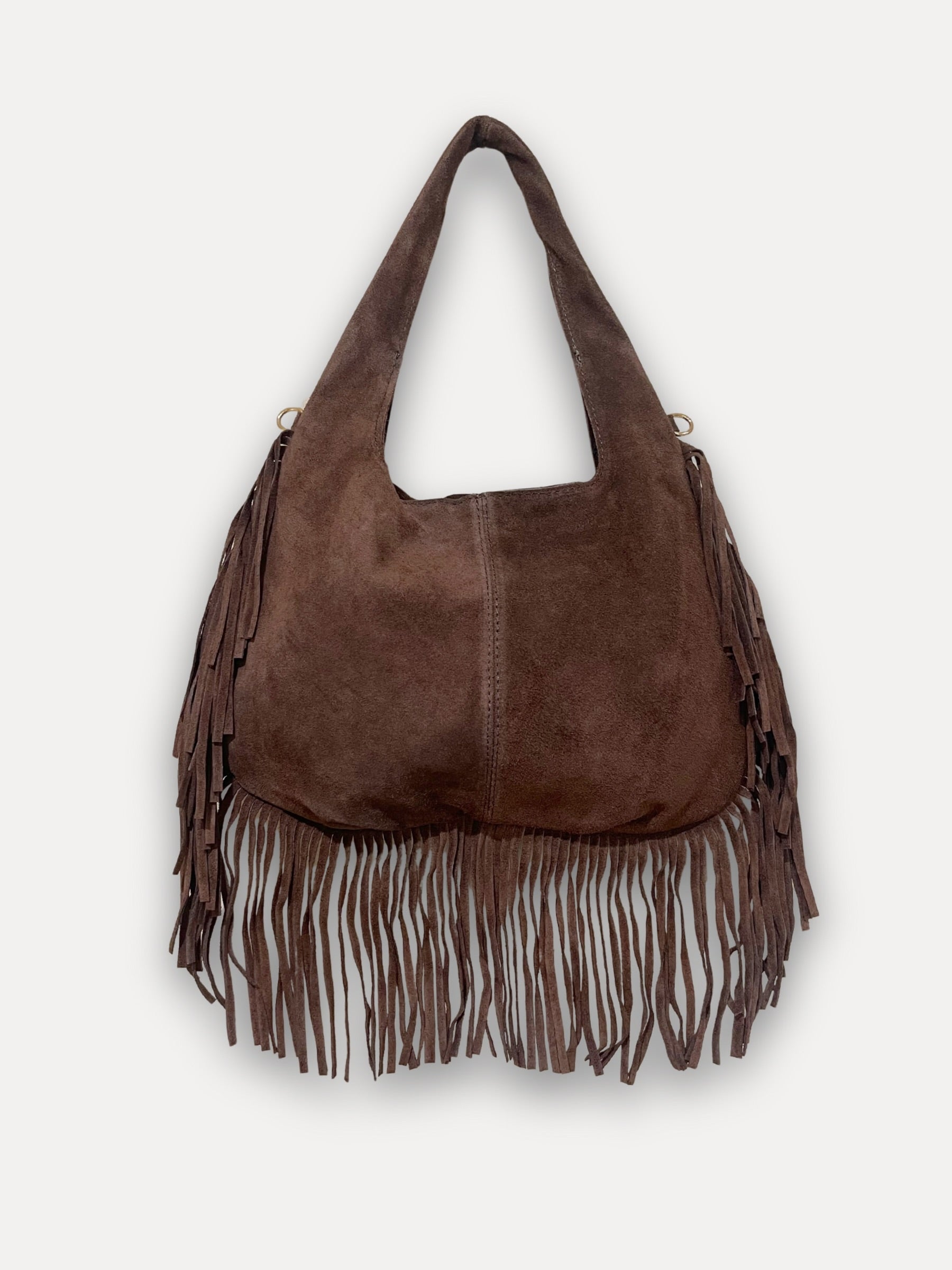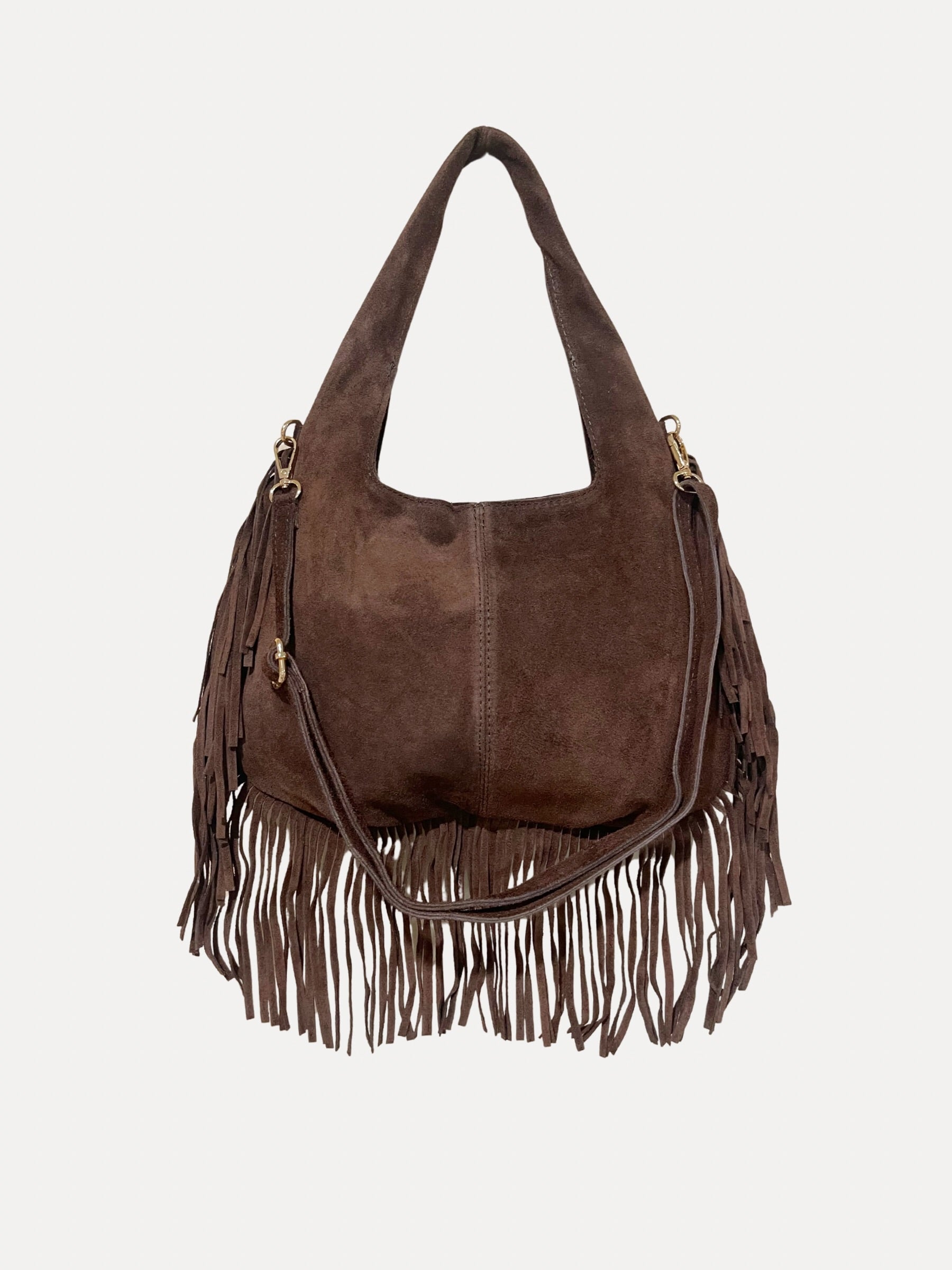 A timeless classic reimagined with a western-chic twist. Crafted in supple genuine suede leather in a rich chocolate hue, this hobo bag is lightweight yet luxurious, making it the perfect companion for fall.