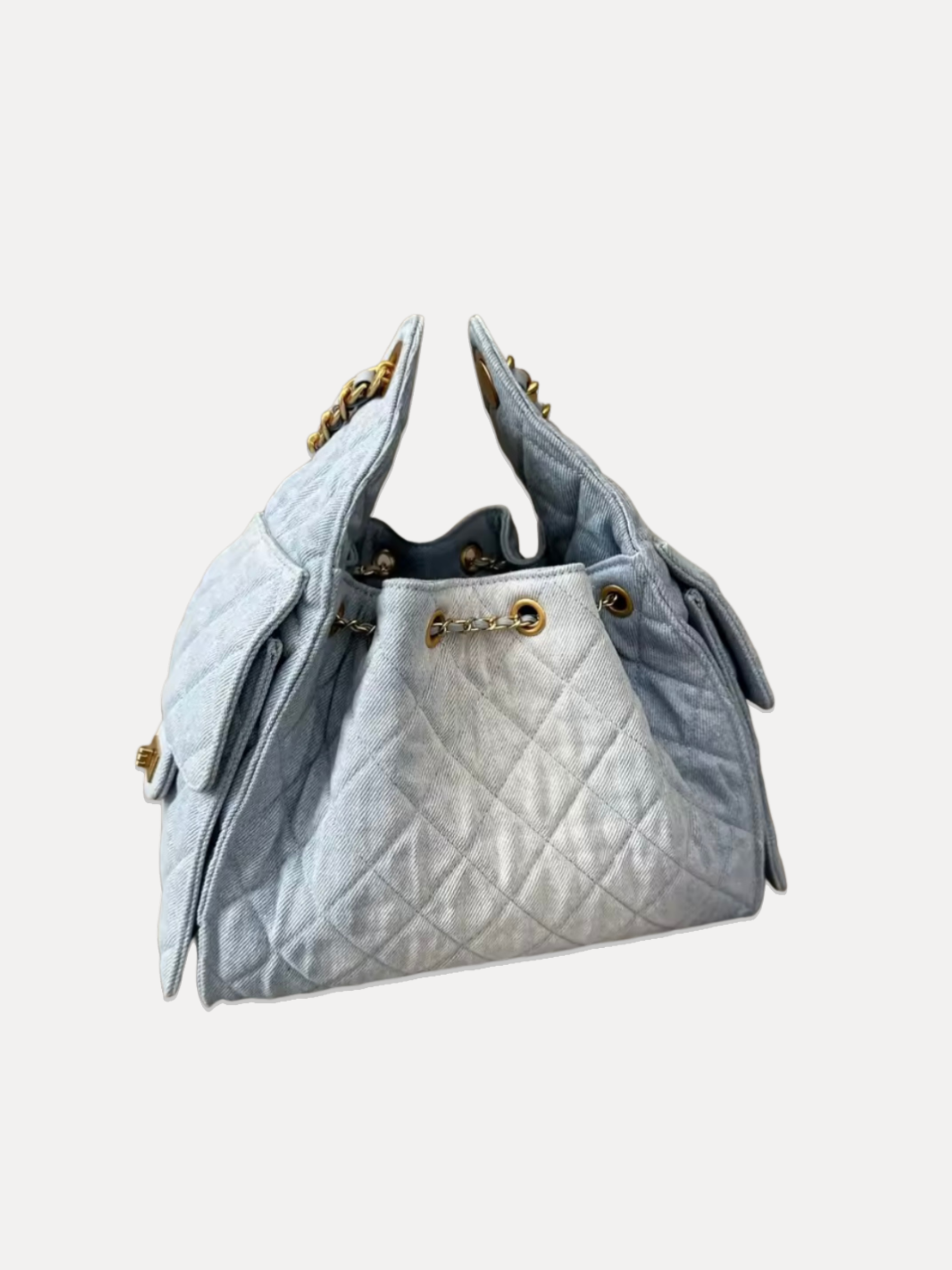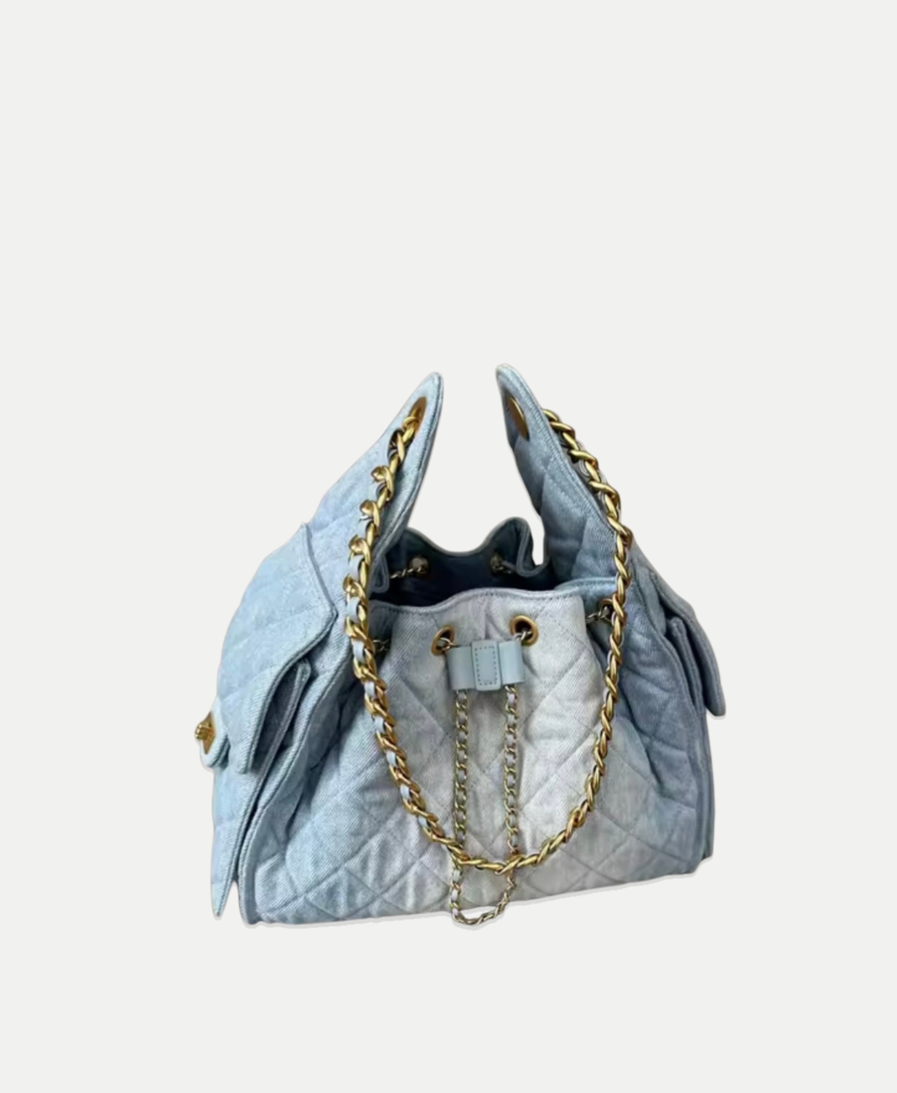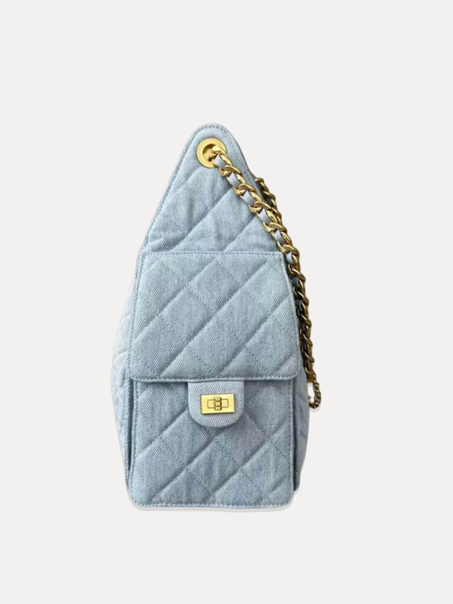 A timeless silhouette reimagined in washed denim with a modern edge. The Vera Quilted Denim Bag features plush quilted detailing, gold-tone chain straps, and versatile side flap pockets with twist-lock closures. Designed to be worn three ways — crossbody, on the shoulder, or as a mini tote — it adapts to every occasion.