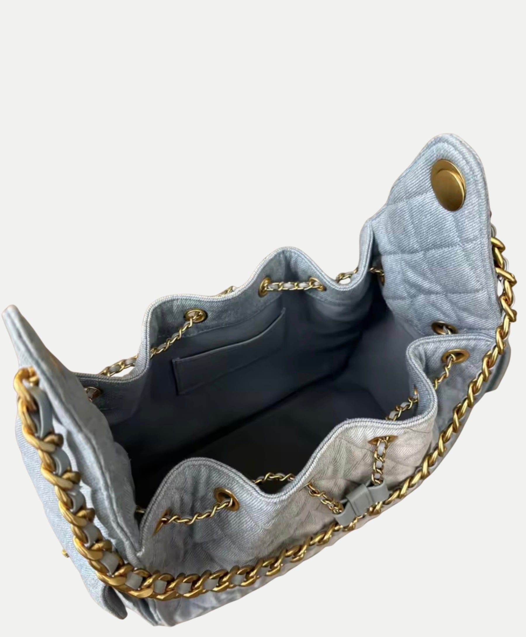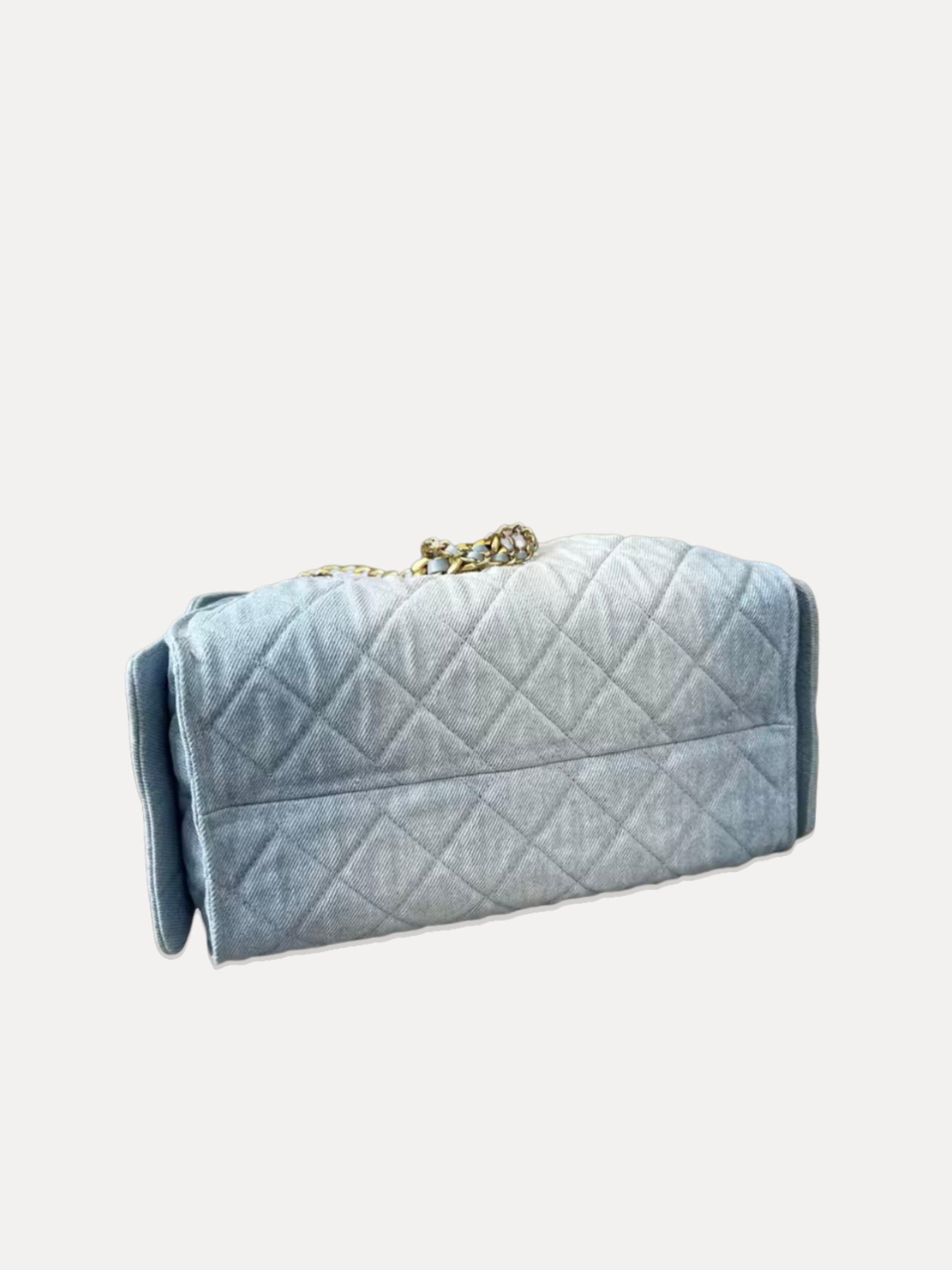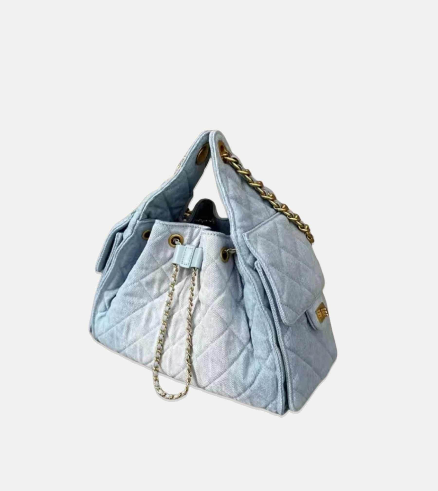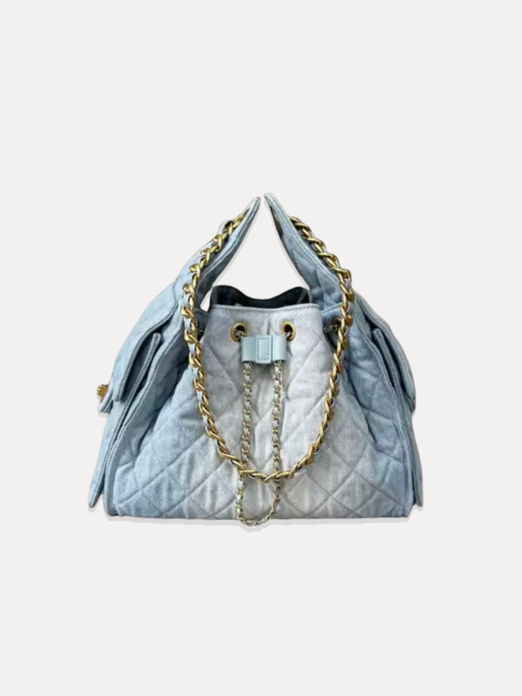 A timeless silhouette reimagined in washed denim with a modern edge. The Vera Quilted Denim Bag features plush quilted detailing, gold-tone chain straps, and versatile side flap pockets with twist-lock closures. Designed to be worn three ways — crossbody, on the shoulder, or as a mini tote — it adapts to every occasion.