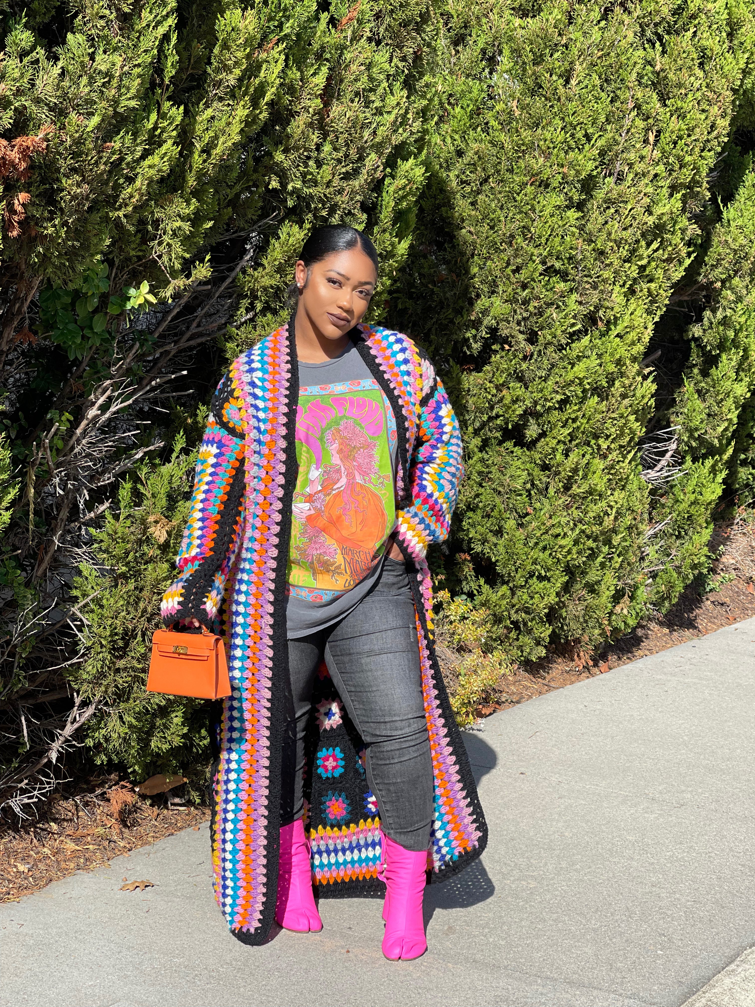 This handmade crochet cardigan is absolutely gorgeous. Beautiful vibrant colors are carefully arranged on this masterpiece. You can pair this with any outfit for a statement ensemble. Available in red, black and sand color. Please note, this item is handmade and no two cardigans are alike, each piece is unique to its wearer.