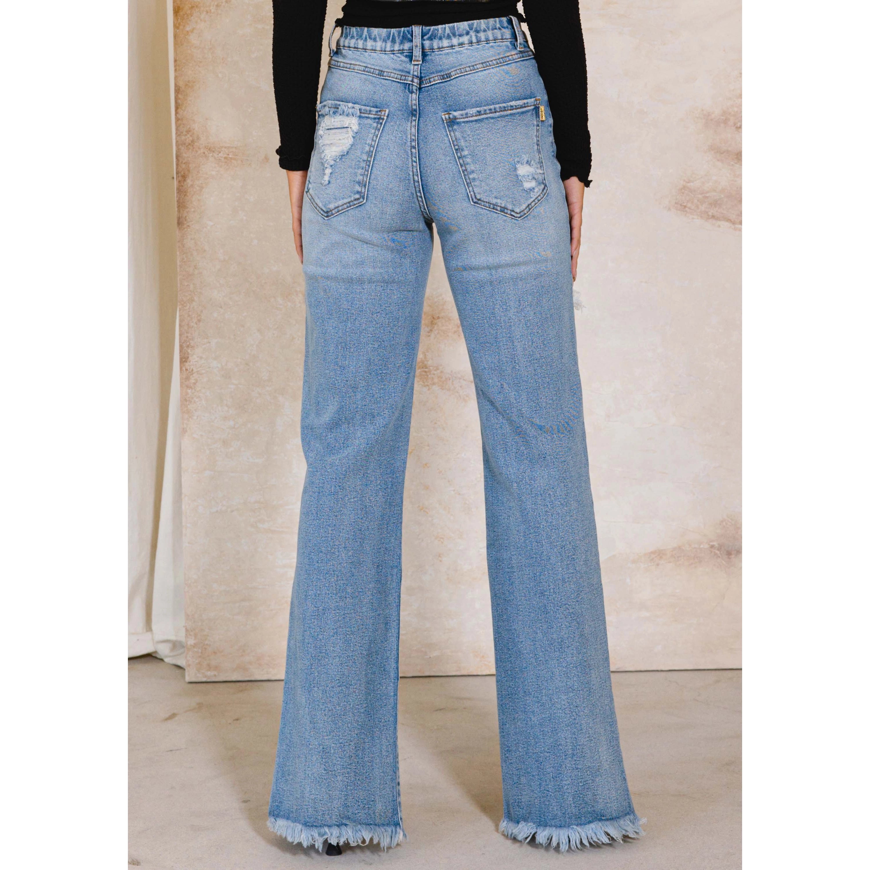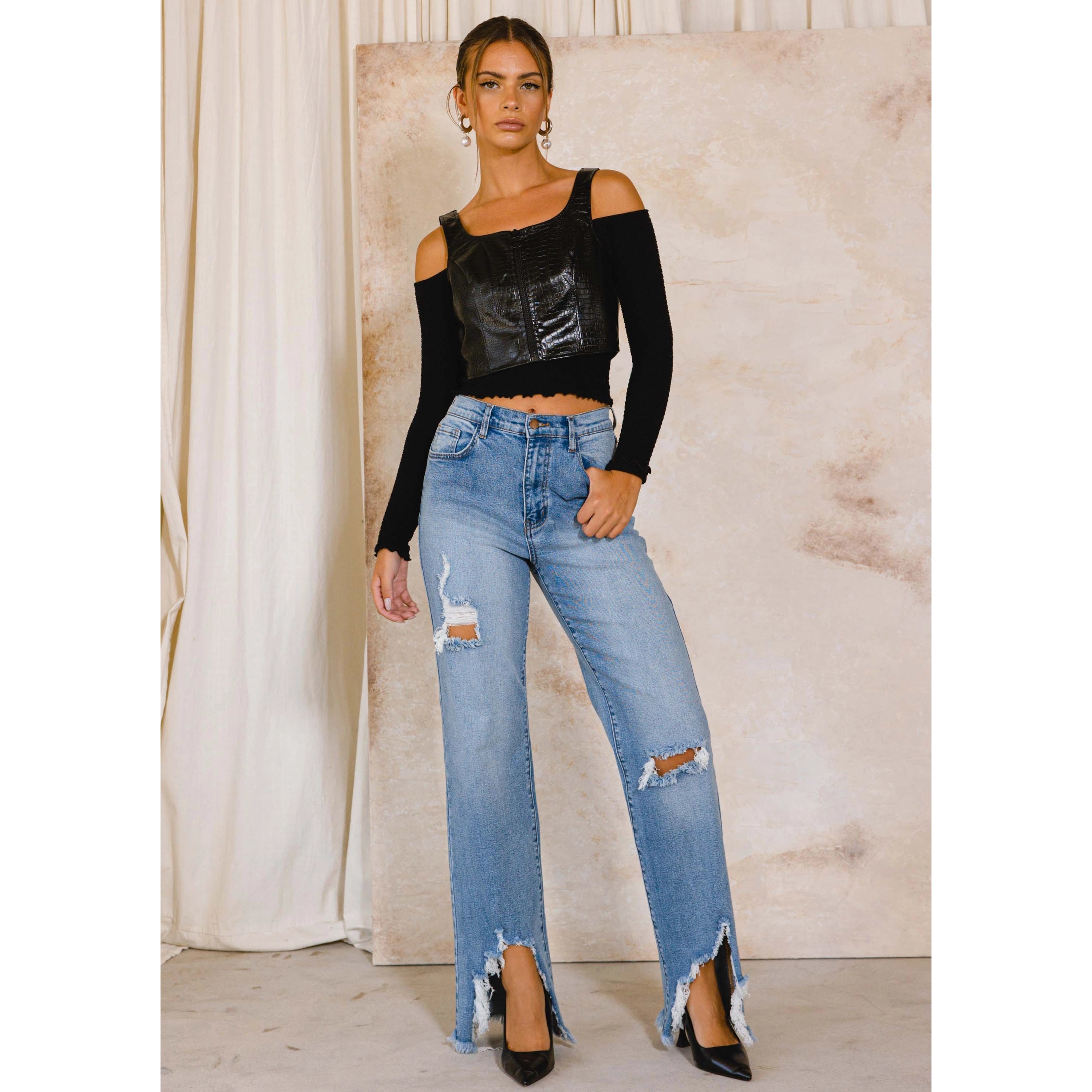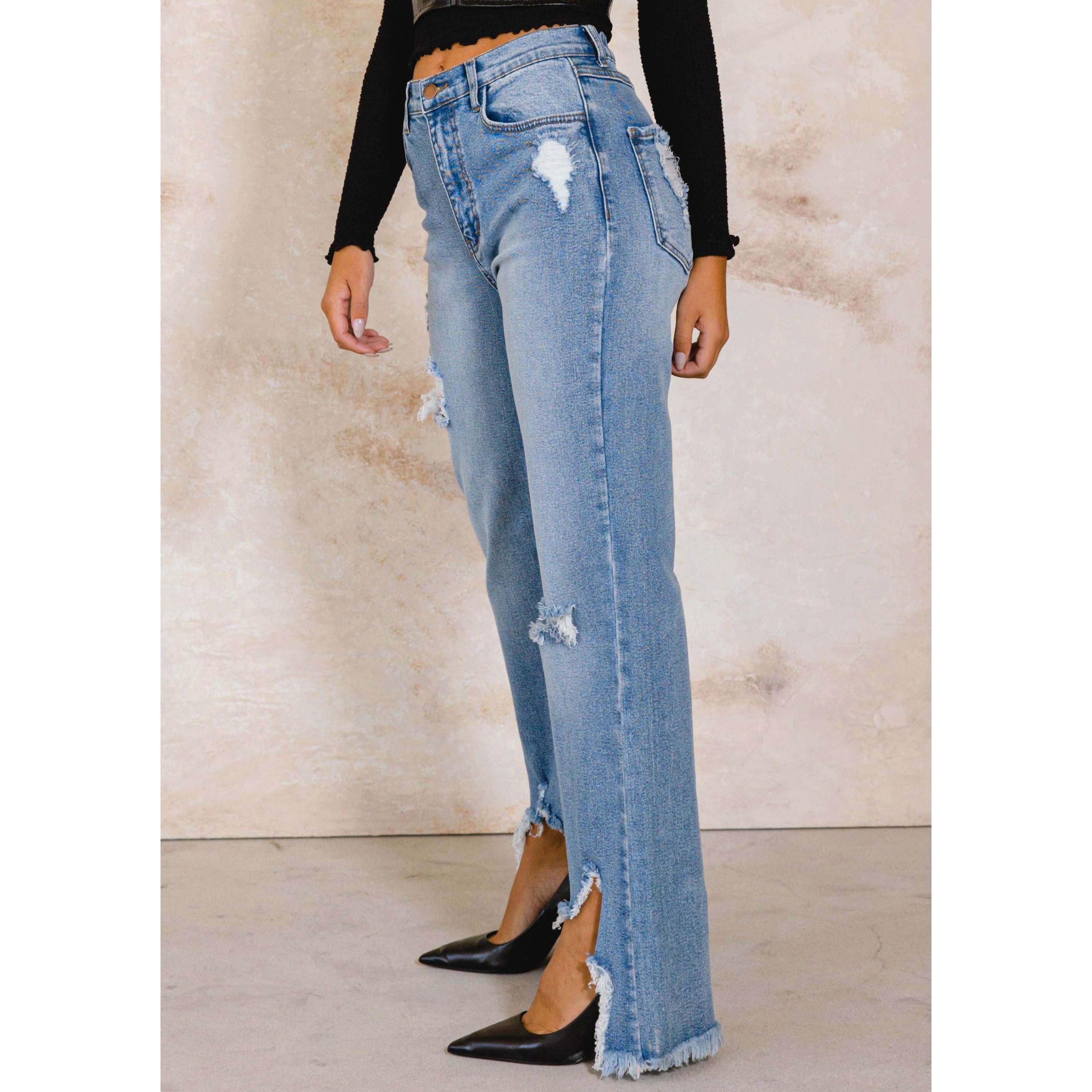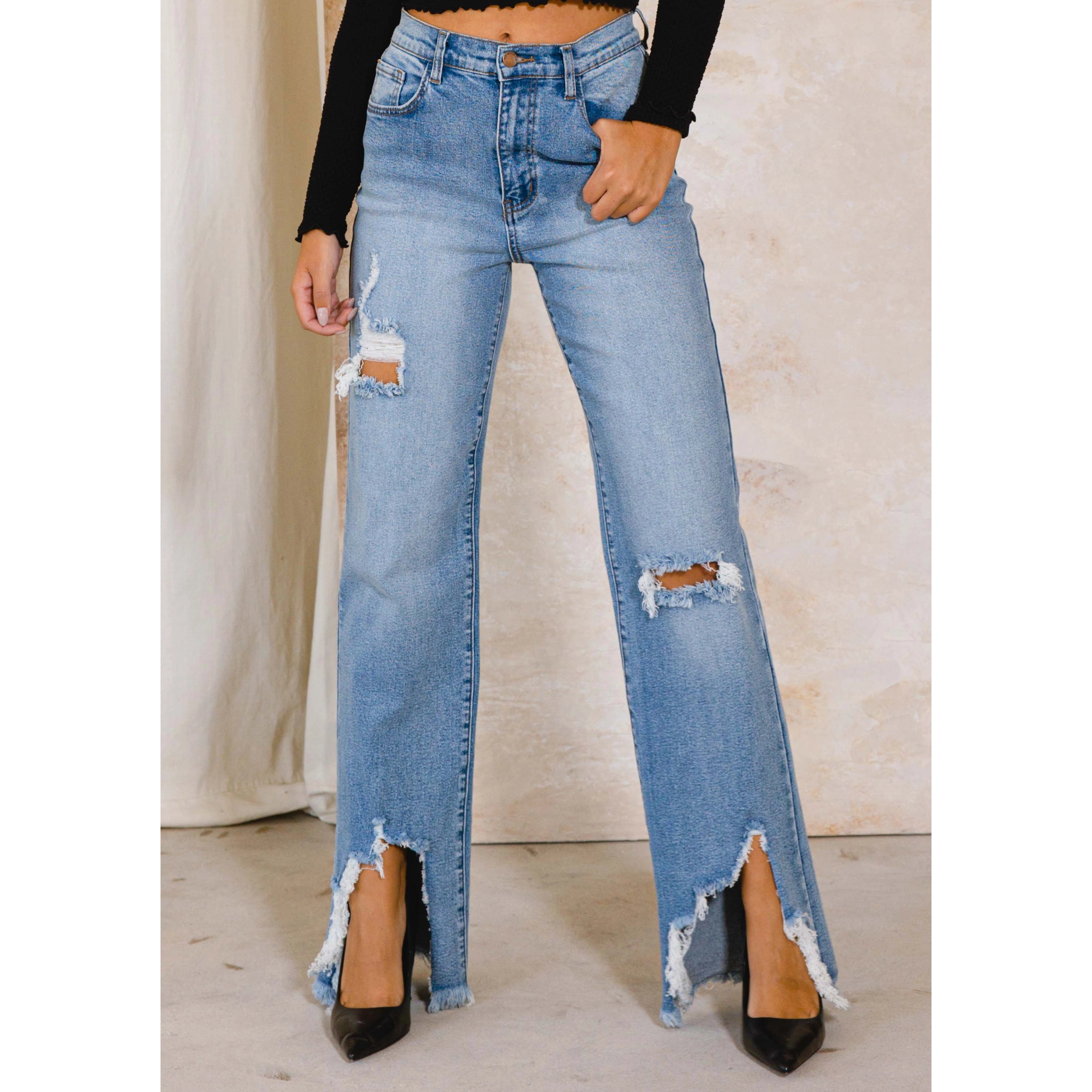 High waist stretch jeans you didn't know you needed. Perfectly tailored to comfortably hug every curve and flatter every shape. These jeans feel great on your skin with high style distressing and great stretch. Style with a cropped black motorcycle jacket or blazer and heels. Dress this denim up or down.
