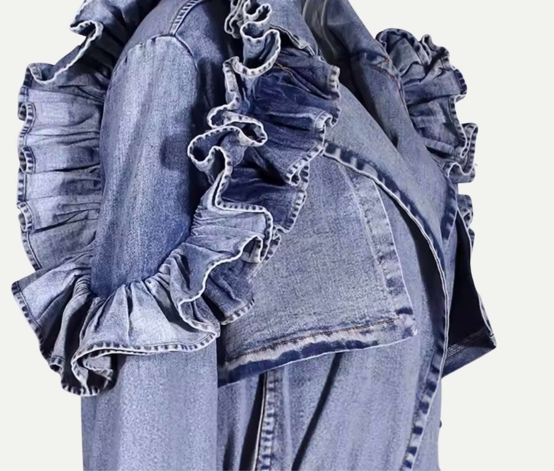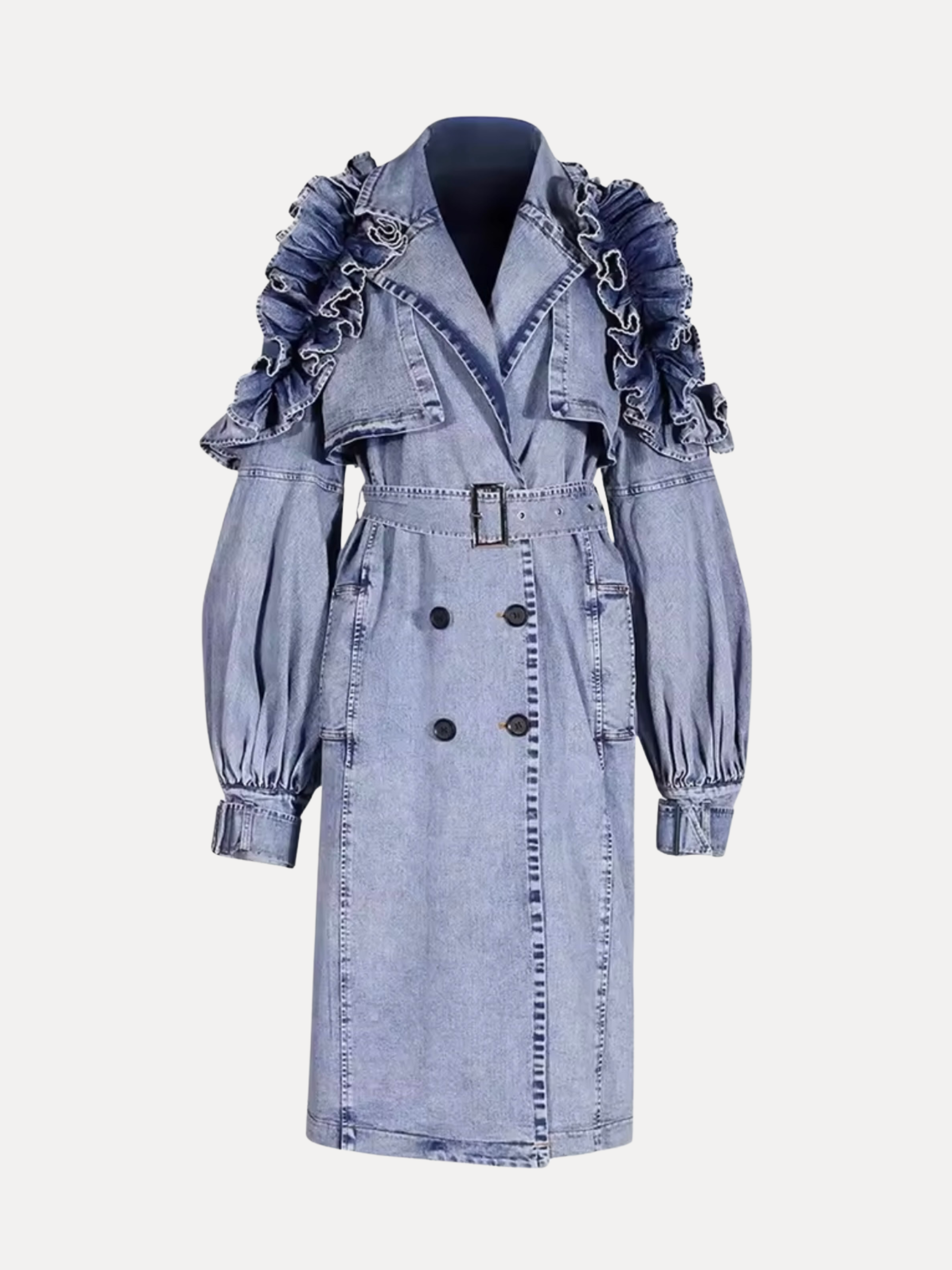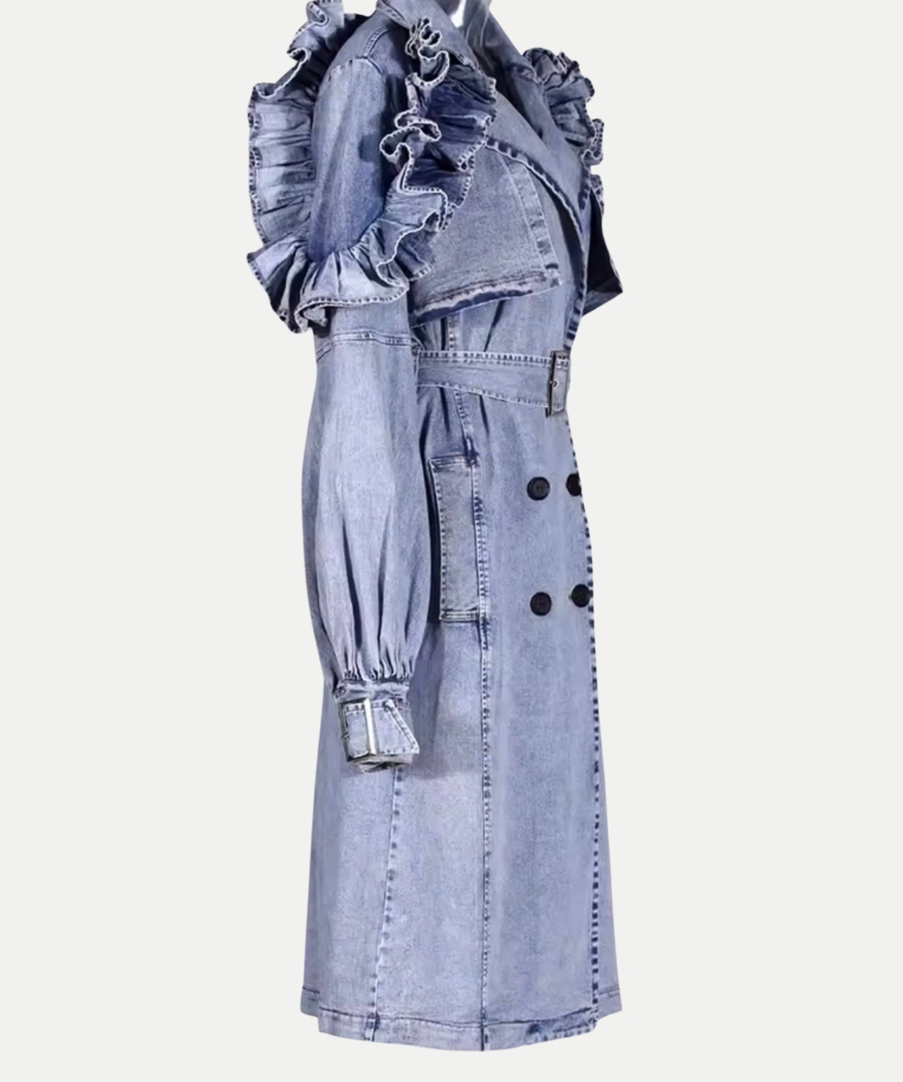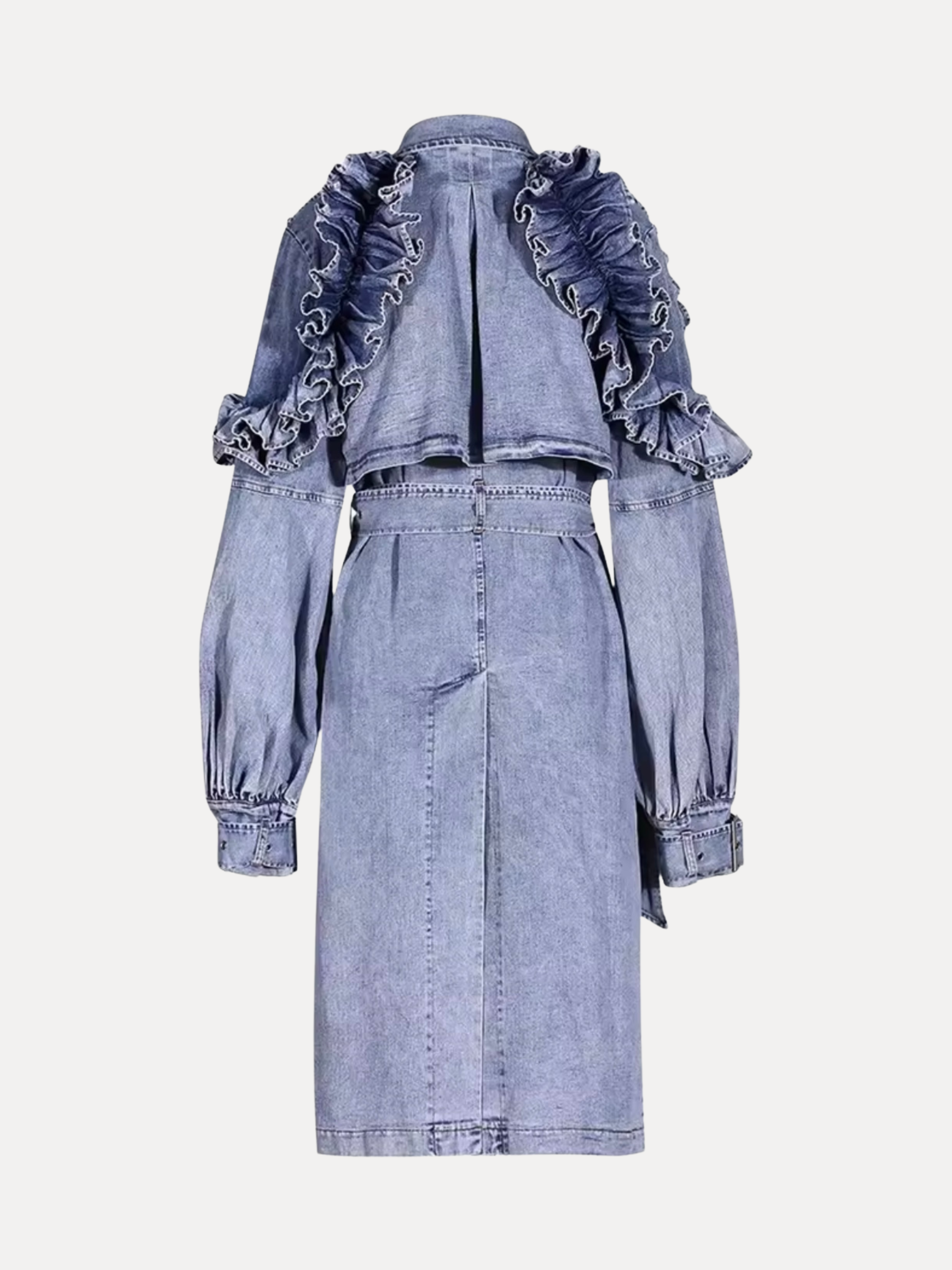 The forever trench—recast in luxuriously washed denim. This sculptural layer pairs clean tailoring with dramatic, ultra-feminine ruffles and artfully structured sleeves for a silhouette that balances edge and elegance. The soft, washed finish lends an easy drape and lived-in comfort. A self-tie belt cinches the waist, while discreet side pockets keep the profile refined. Wear it open for effortless flow or belted for hourglass definition—either way, it turns every entrance into a moment.