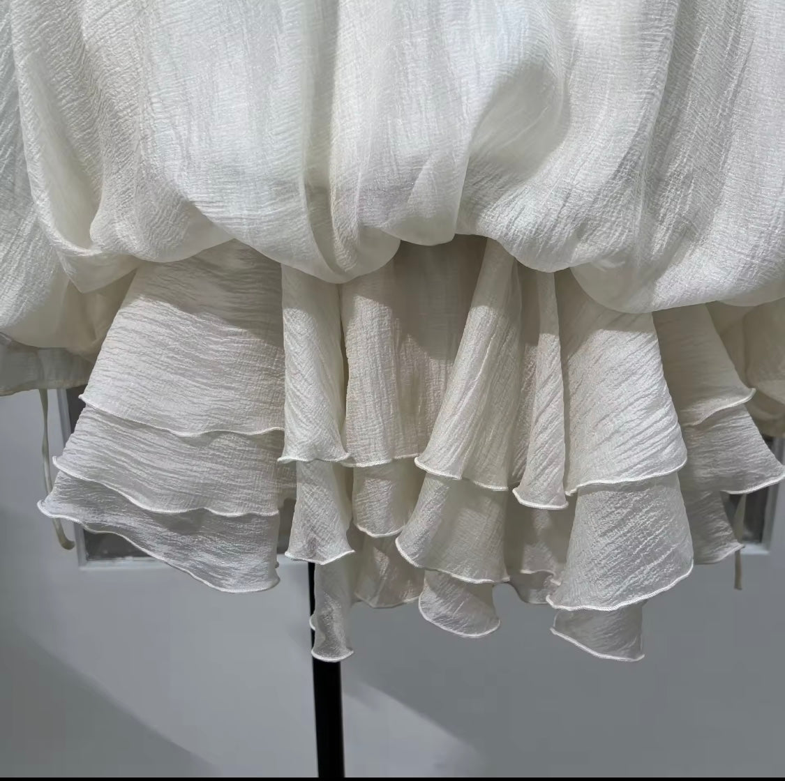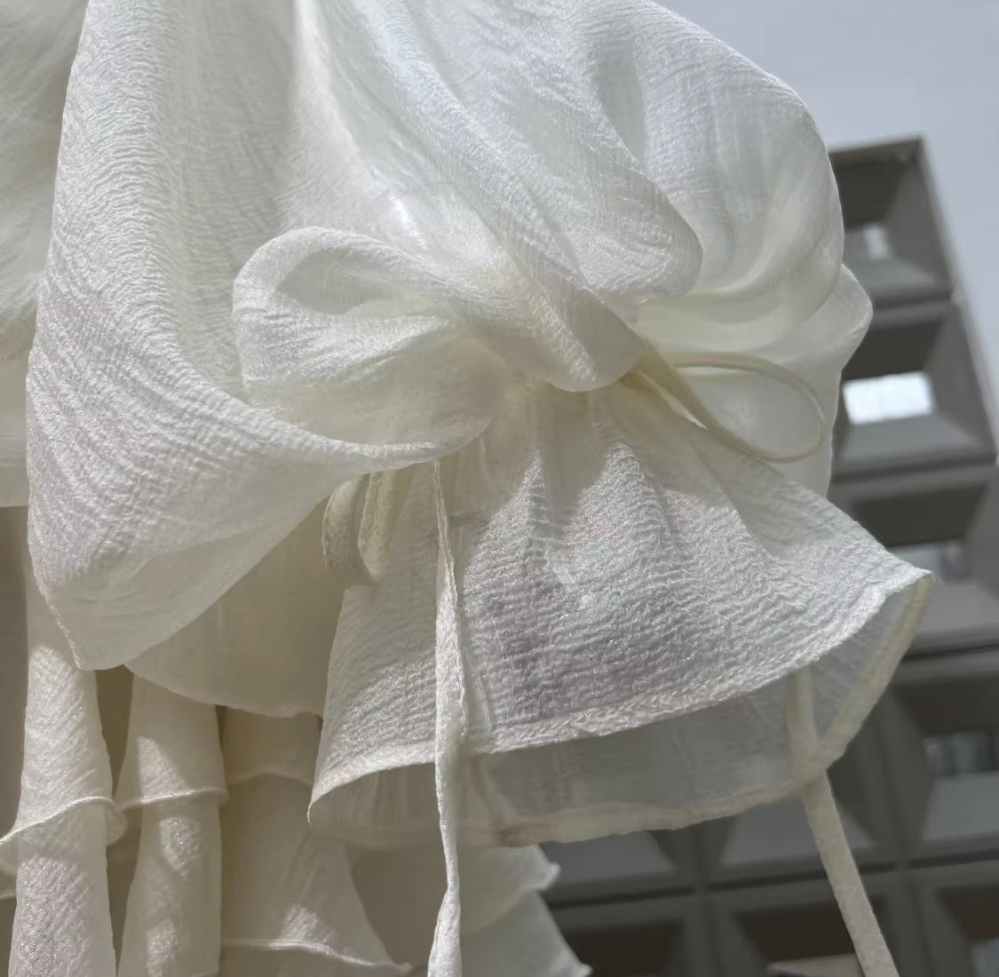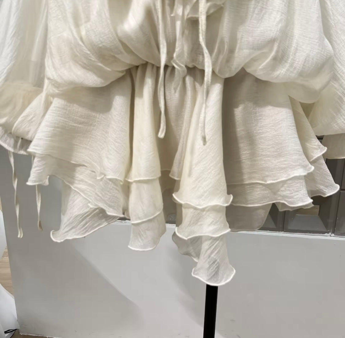 Criss-cross chest ties let you customize the neckline — from softly open to elegantly cinched — while billowy sleeves with adjustable drawstring ties add volume and versatility. The tiered ruffle hem finishes the look with graceful movement and effortless charm.