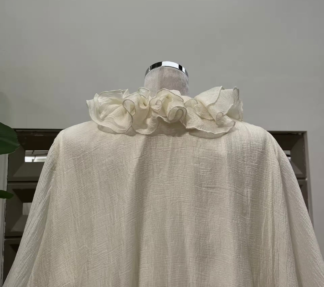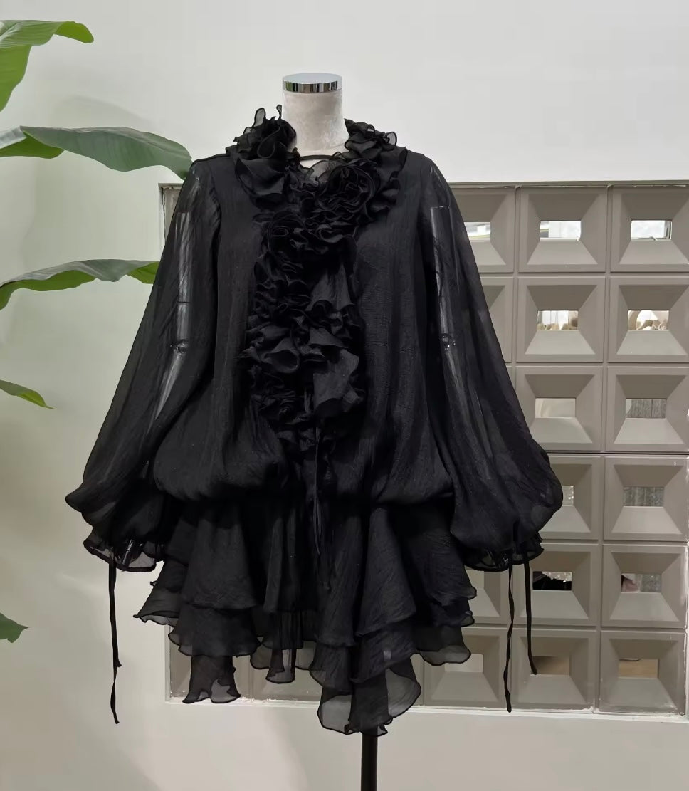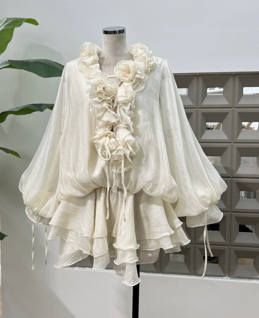 Criss-cross chest ties let you customize the neckline — from softly open to elegantly cinched — while billowy sleeves with adjustable drawstring ties add volume and versatility. The tiered ruffle hem finishes the look with graceful movement and effortless charm.