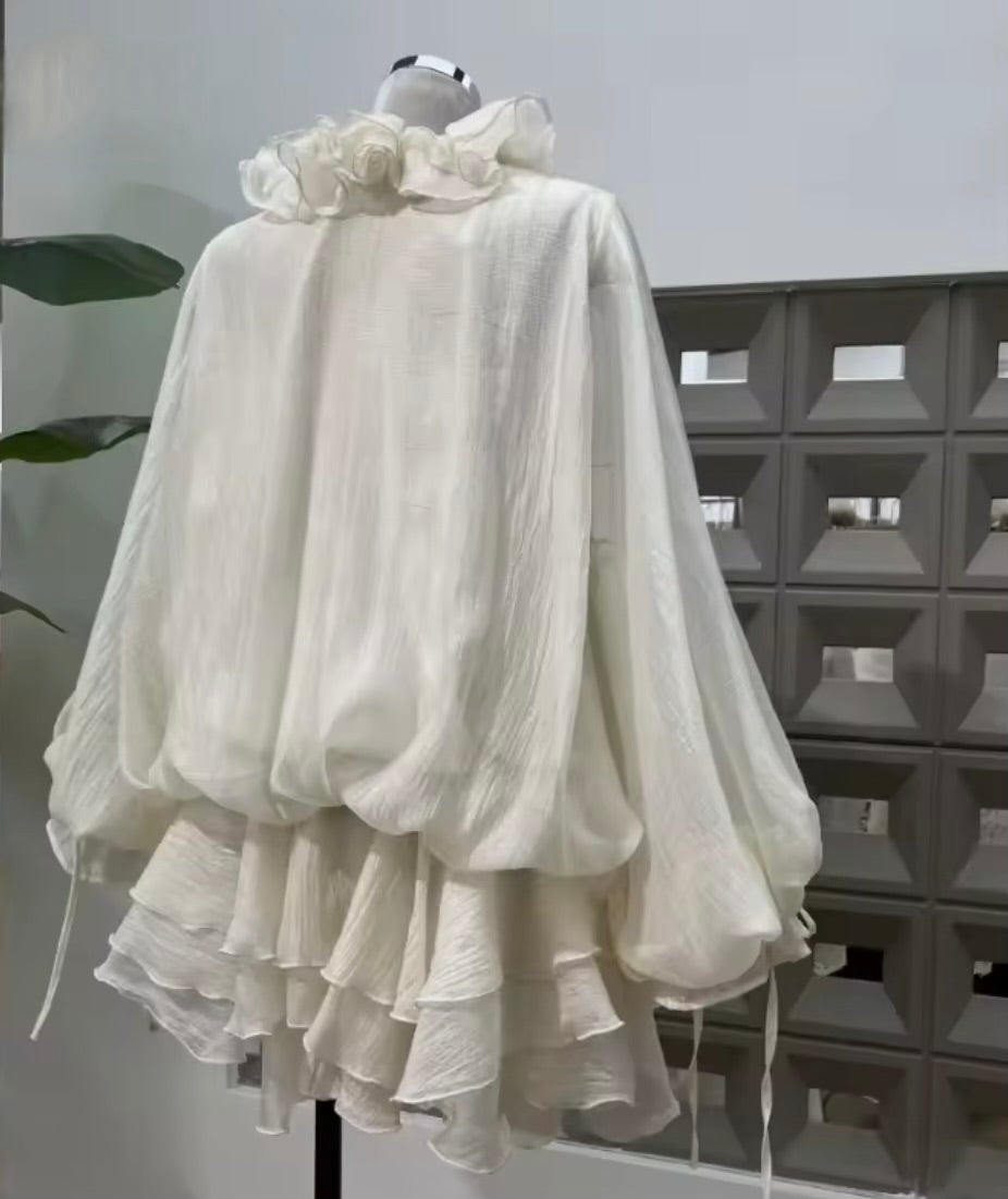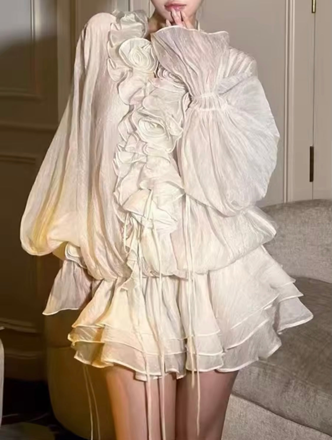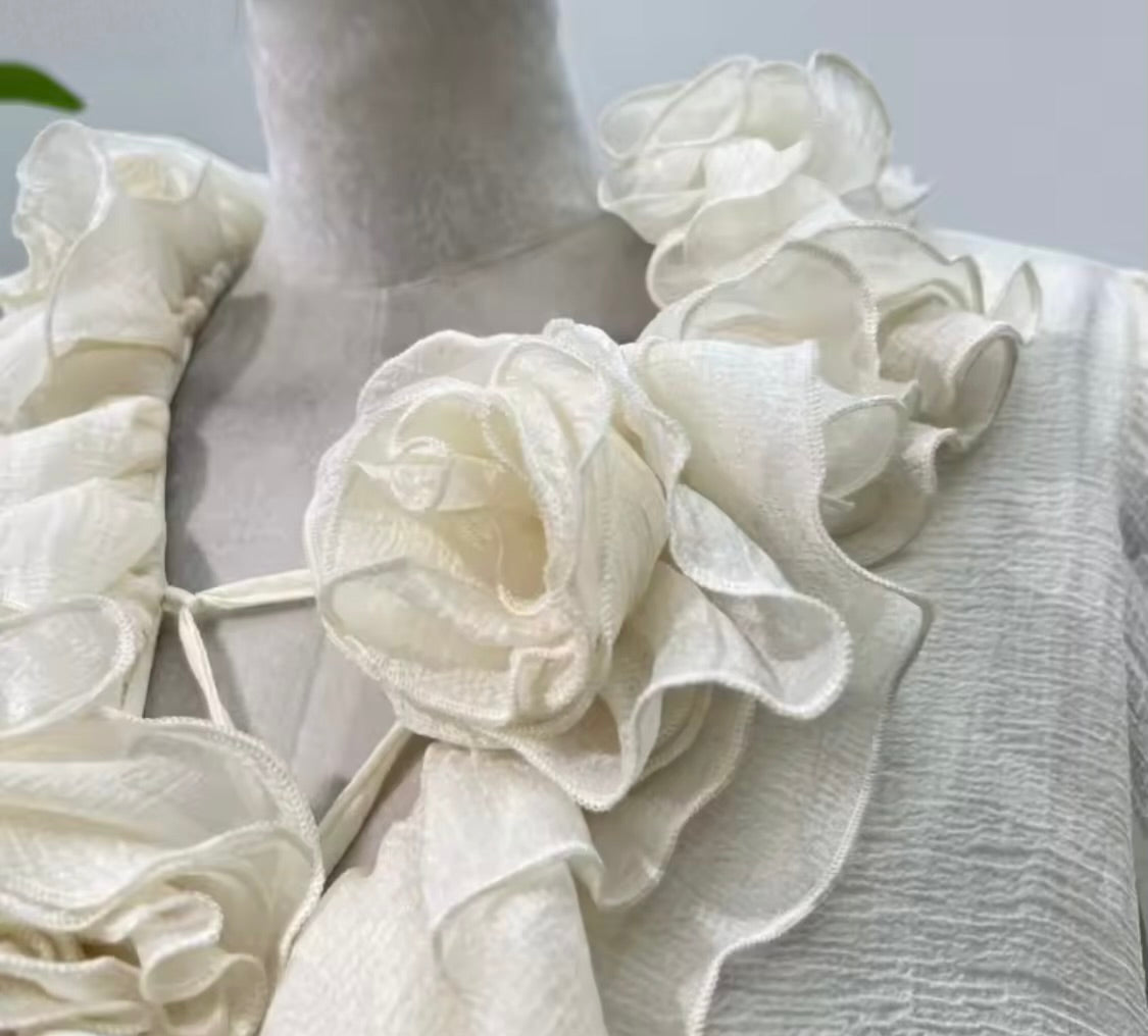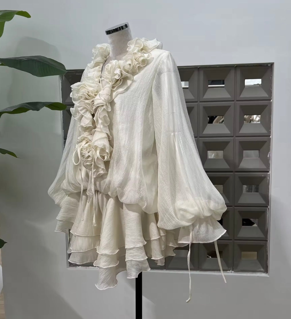 PRE ORDER, ESTIMATED SHIP DATE SECOND BATCH 10/24-10/30, LAST RESTOCK, WILL NOT RESTOCK.  Light as air and undeniably feminine, the Rosa Cascade Mini Dress is made to move with you — whether worn solo or layered for added drama. Crafted with a flowing silhouette, this dress features cascading ruffles and handcrafted fabric roses along the neckline and down the center front, offering an artful, romantic touch.