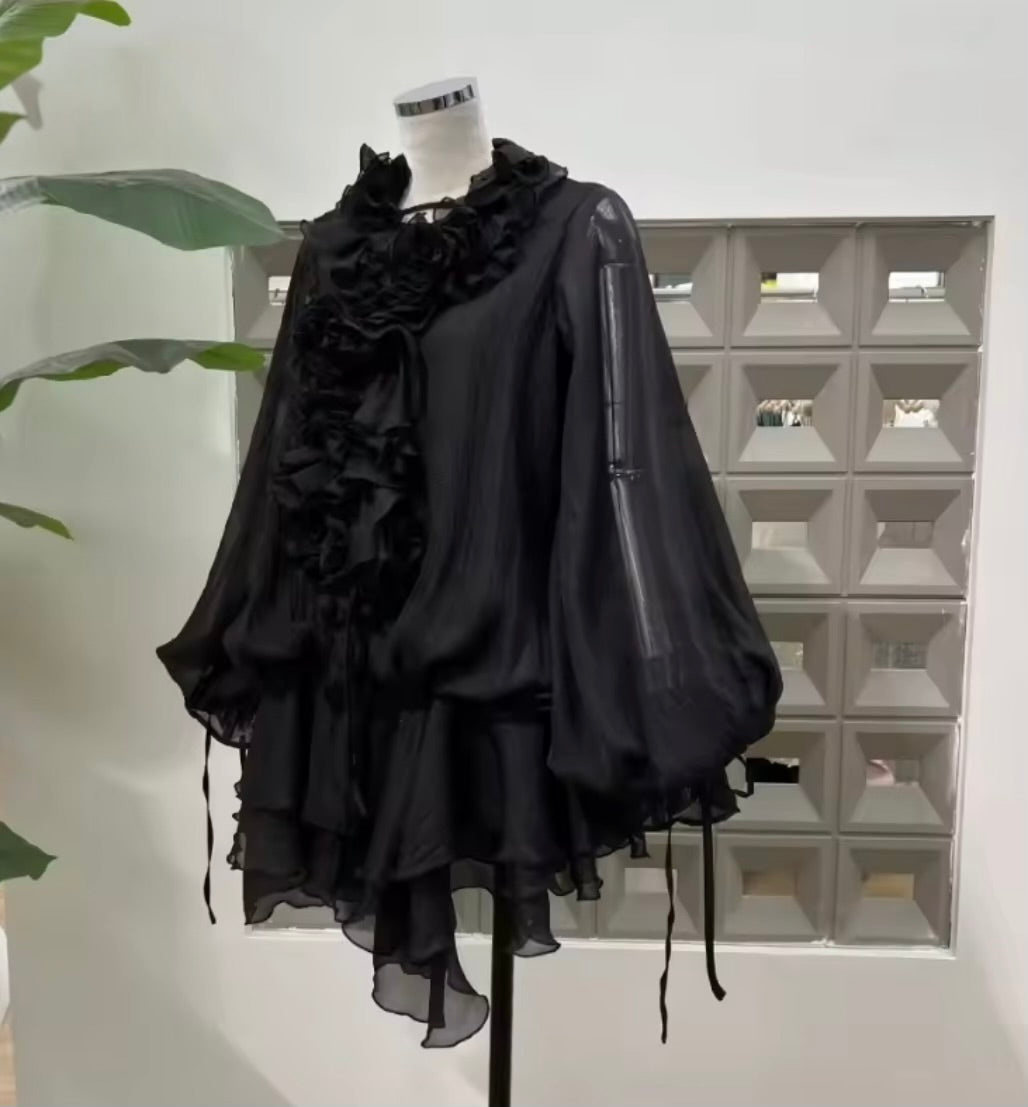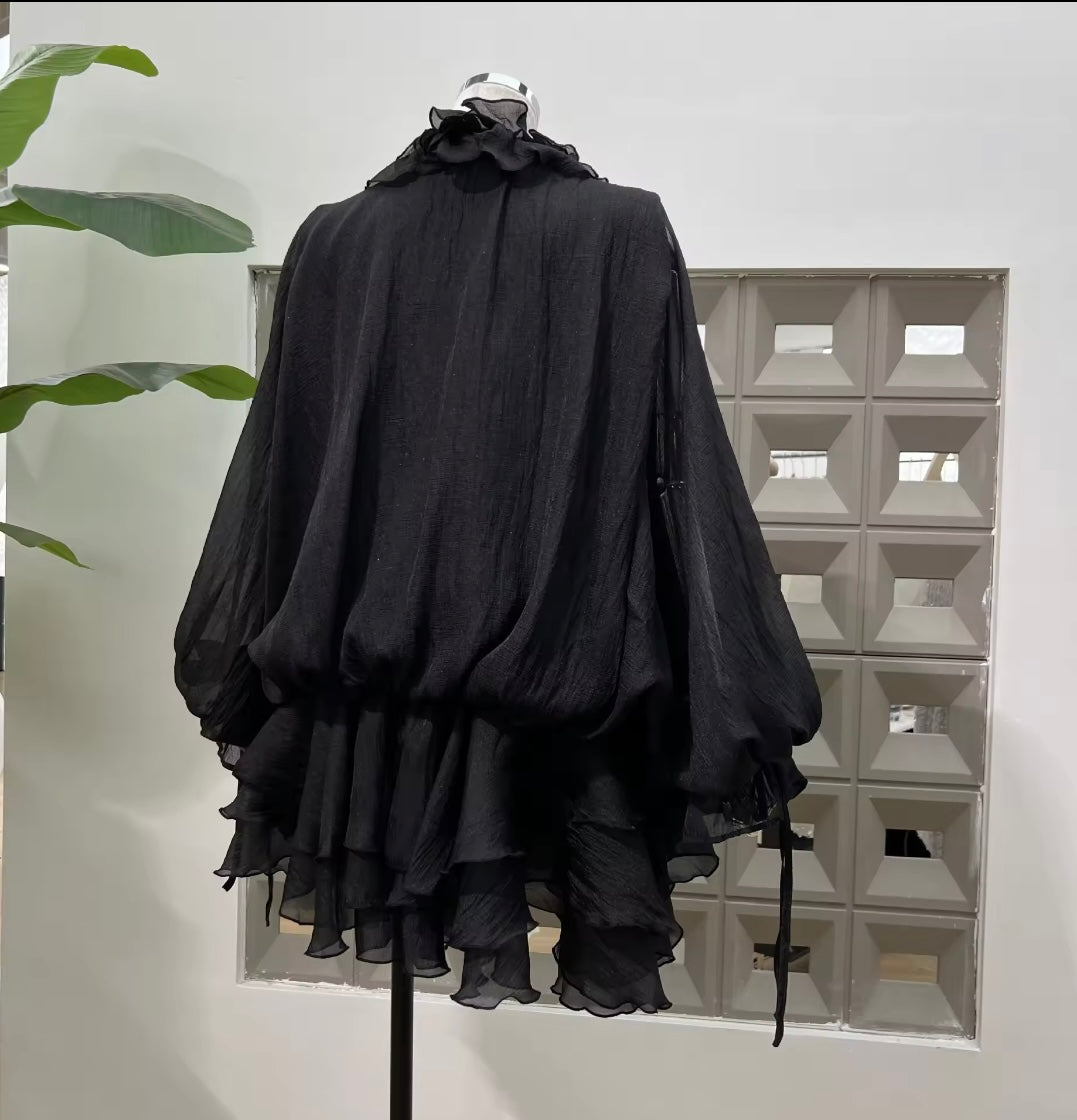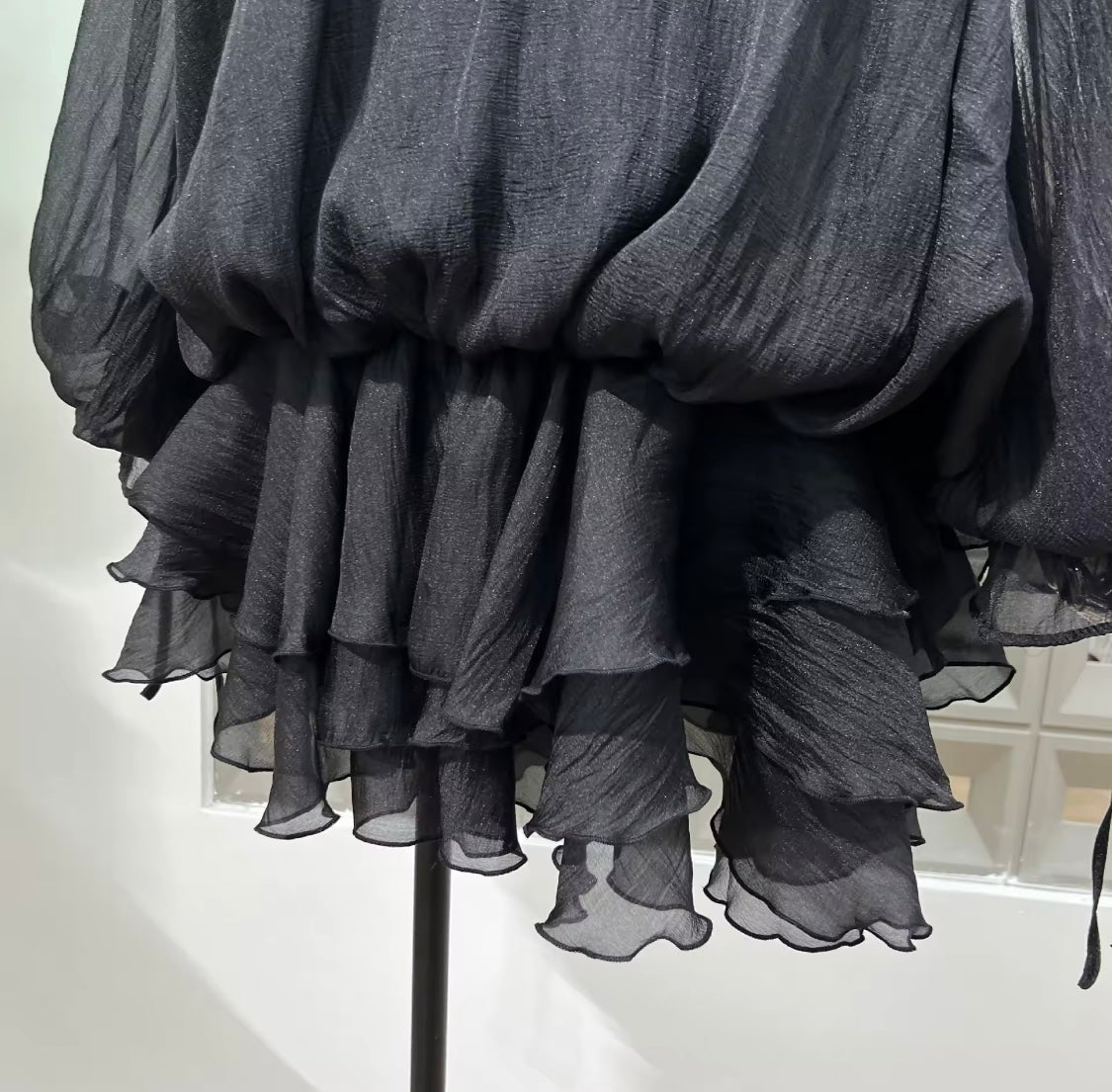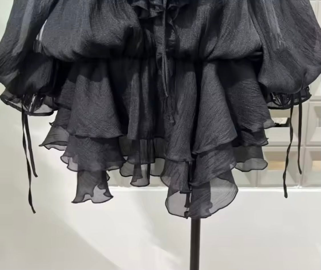 Criss-cross chest ties let you customize the neckline — from softly open to elegantly cinched — while billowy sleeves with adjustable drawstring ties add volume and versatility. The tiered ruffle hem finishes the look with graceful movement and effortless charm.