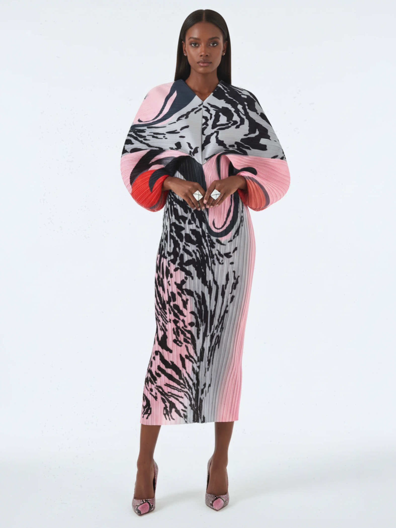 Featuring dramatic architectural pleating, sweeping abstract printwork, and a luxuriously soft hand-feel, the Prea Dress delivers instant chic with zero effort. The sculpted cocoon sleeve, dimensional folds, and elongated column shape create an undeniably modern profile—eye-catching yet refined, bold yet wearable.