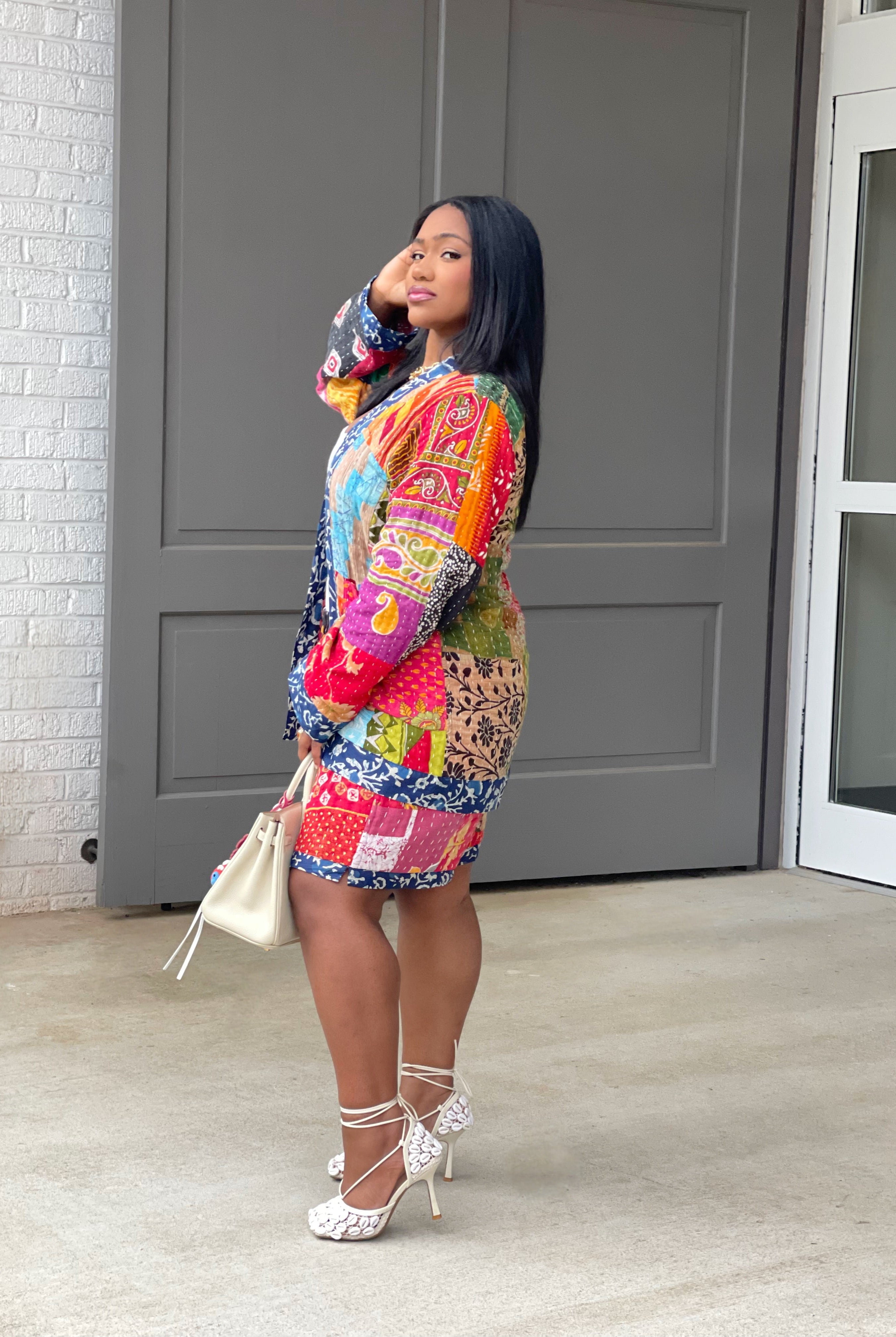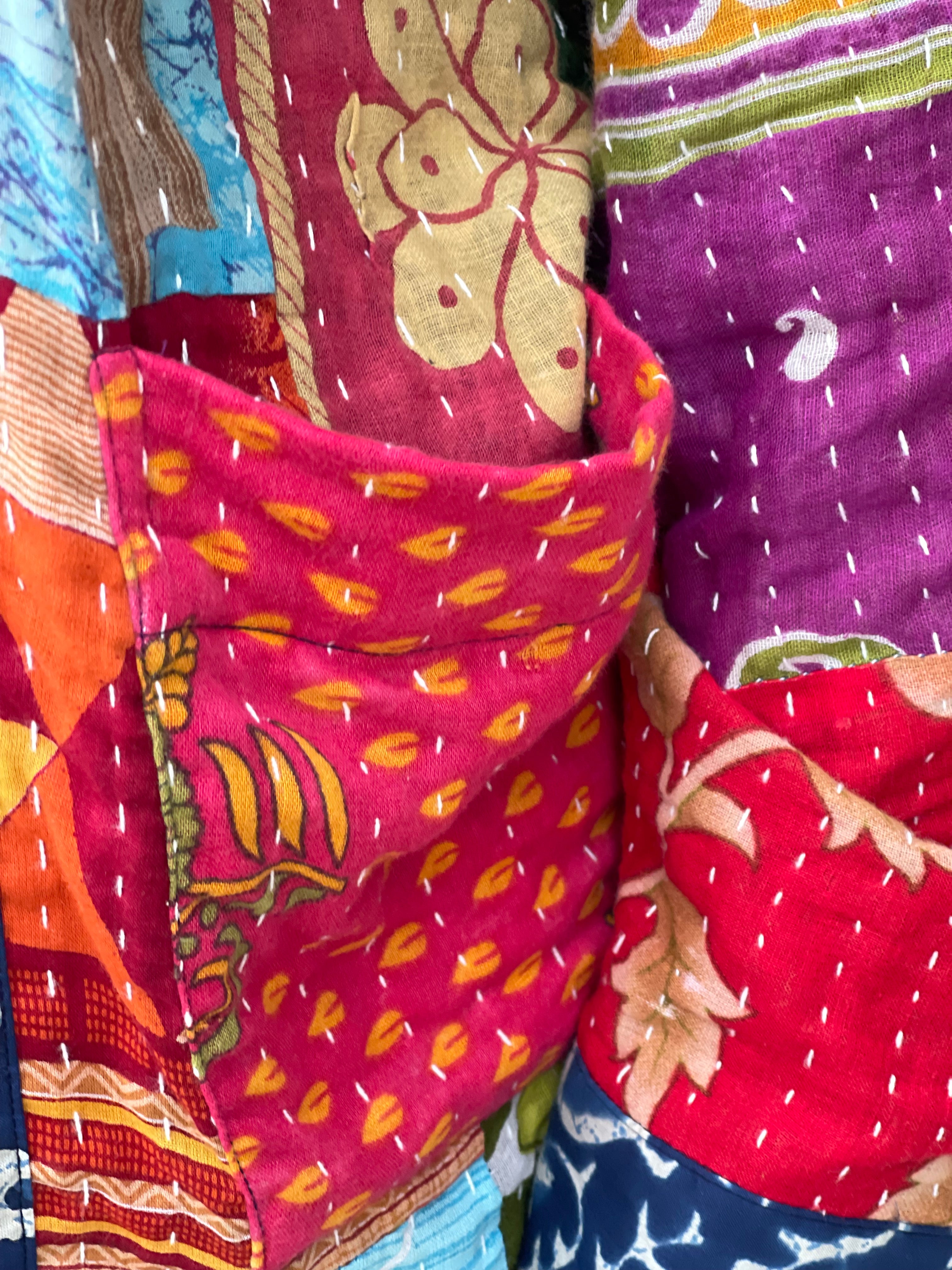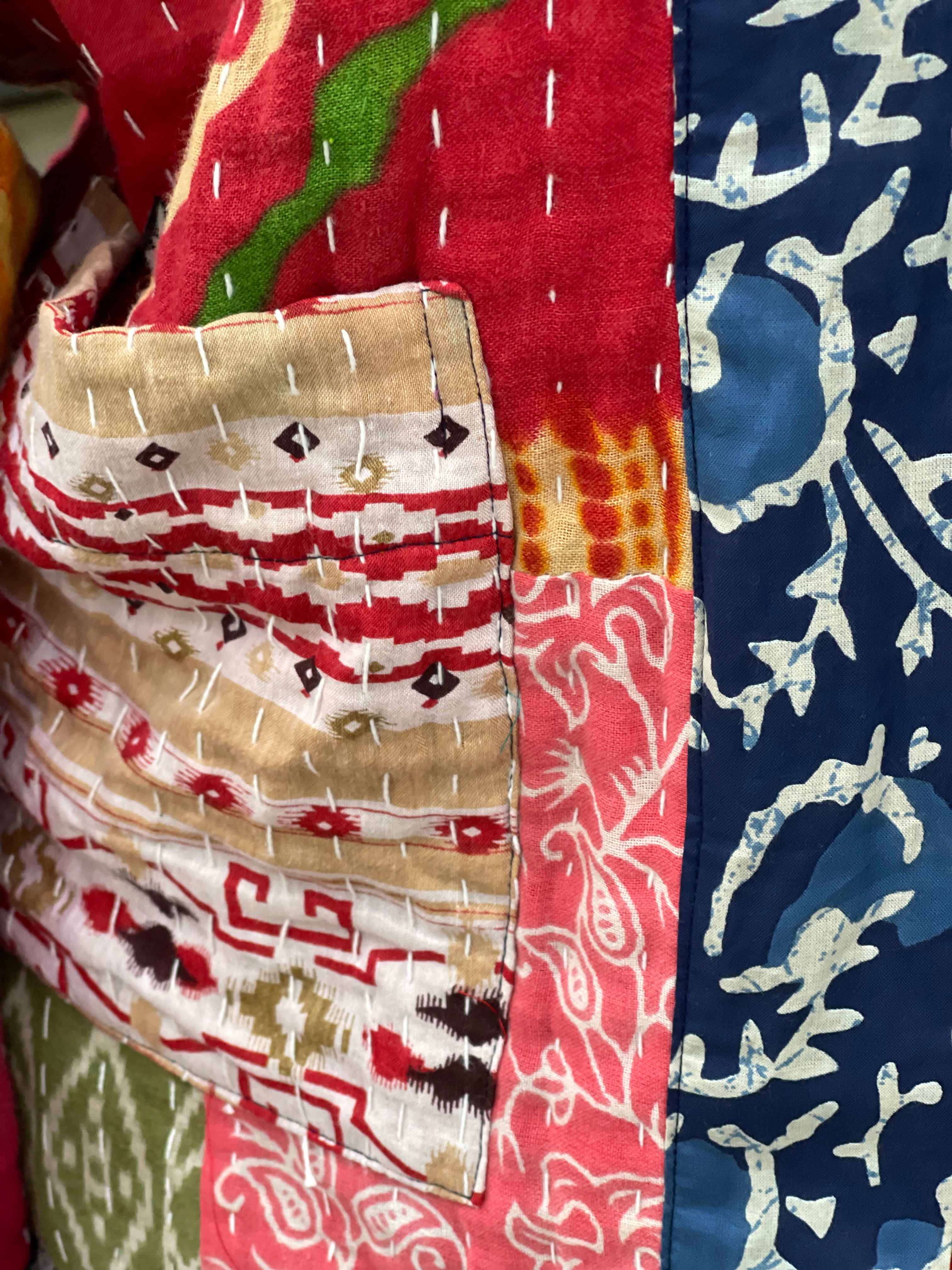Designed in a relaxed, versatile silhouette, it features a reversible patchwork construction with beautifully assorted prints on each side. Finished with pockets and soft indigo block print trim, no two pieces are alike — making yours uniquely yours.