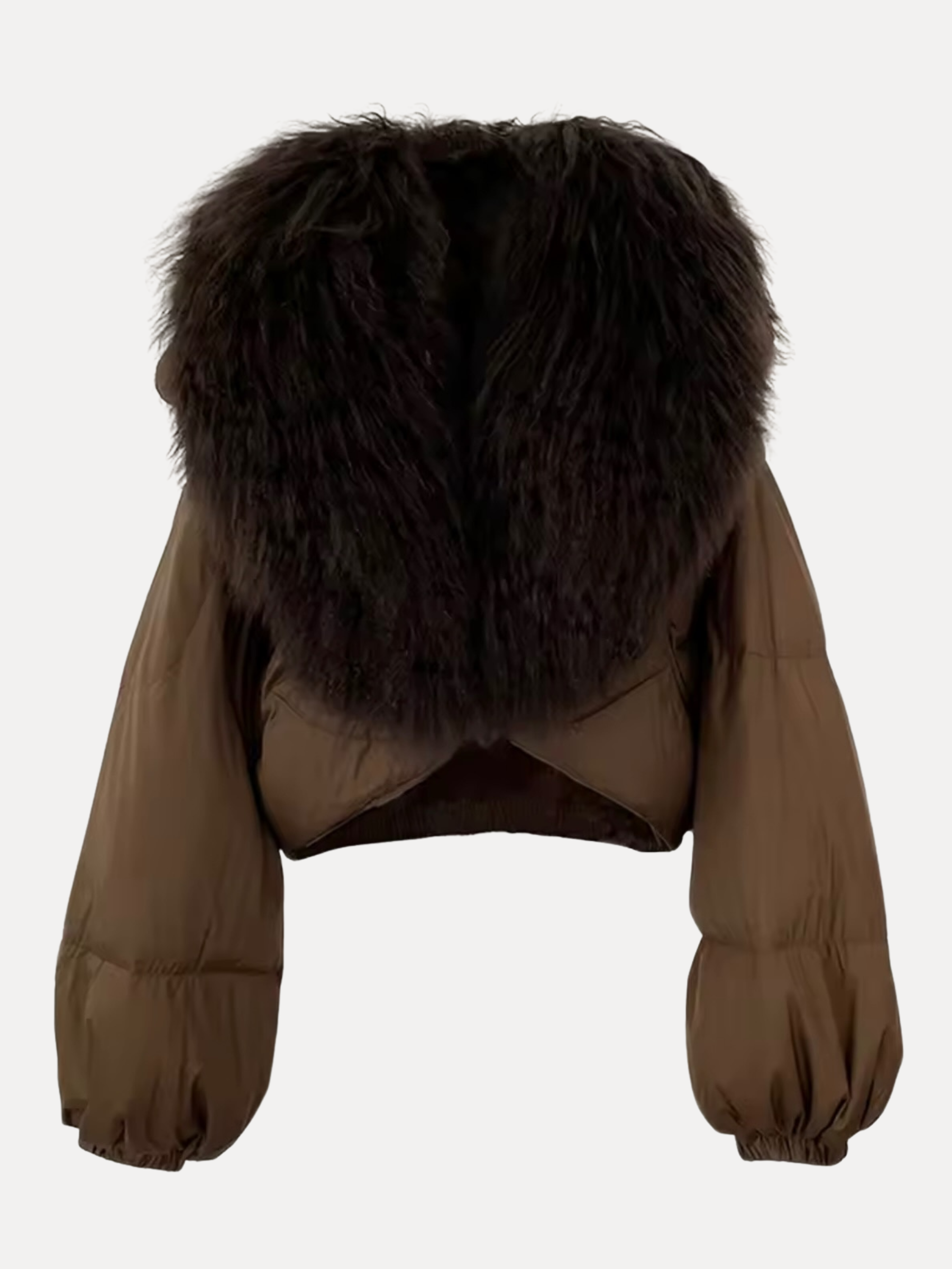 A modern cloud-soft quilted crop jacket crowned with an authentic Mongolian fur collar. Sleek, warm, and unapologetically chic—finished with slight bell sleeves, elastic cuffs, and discreet side pockets.