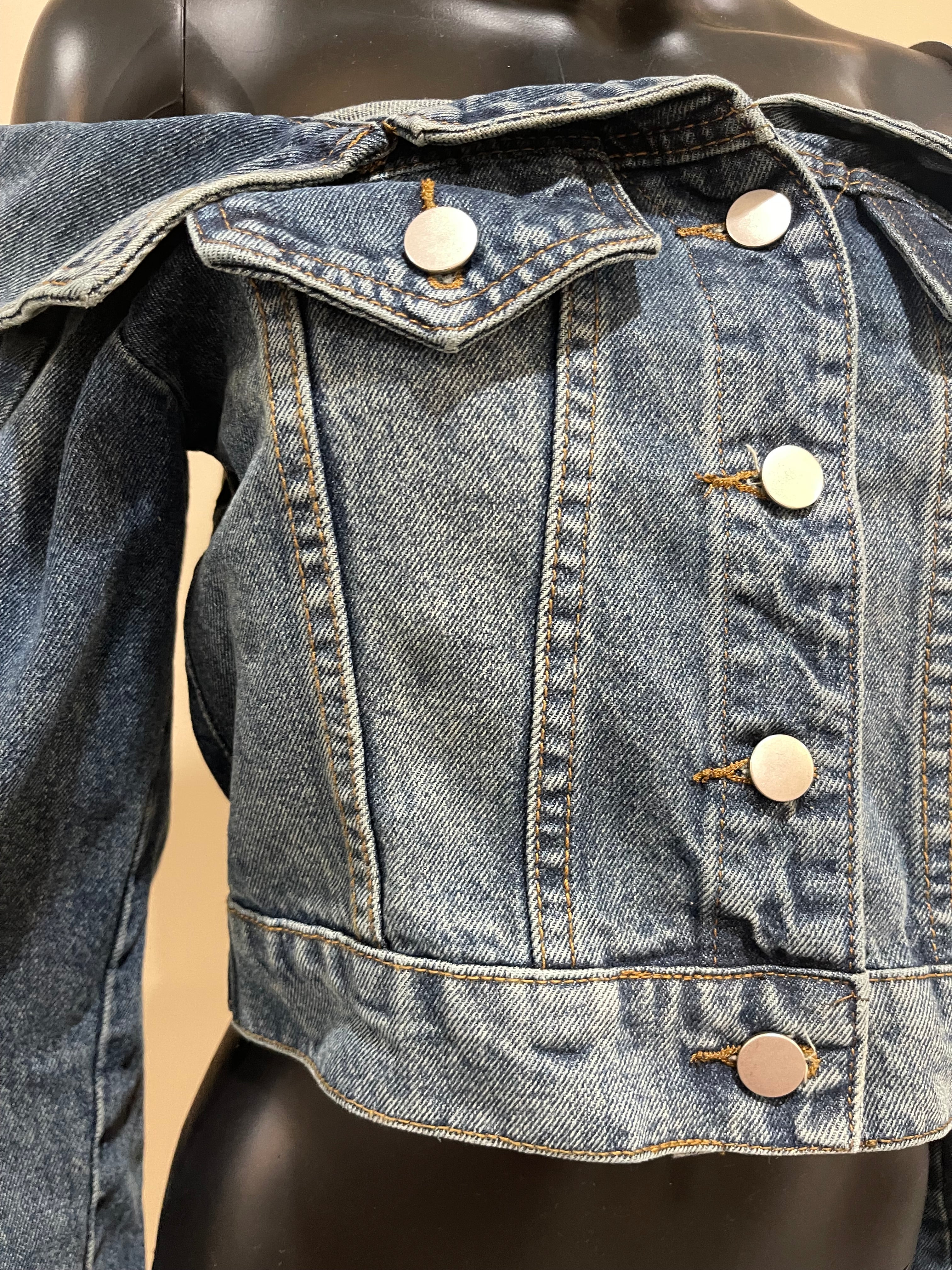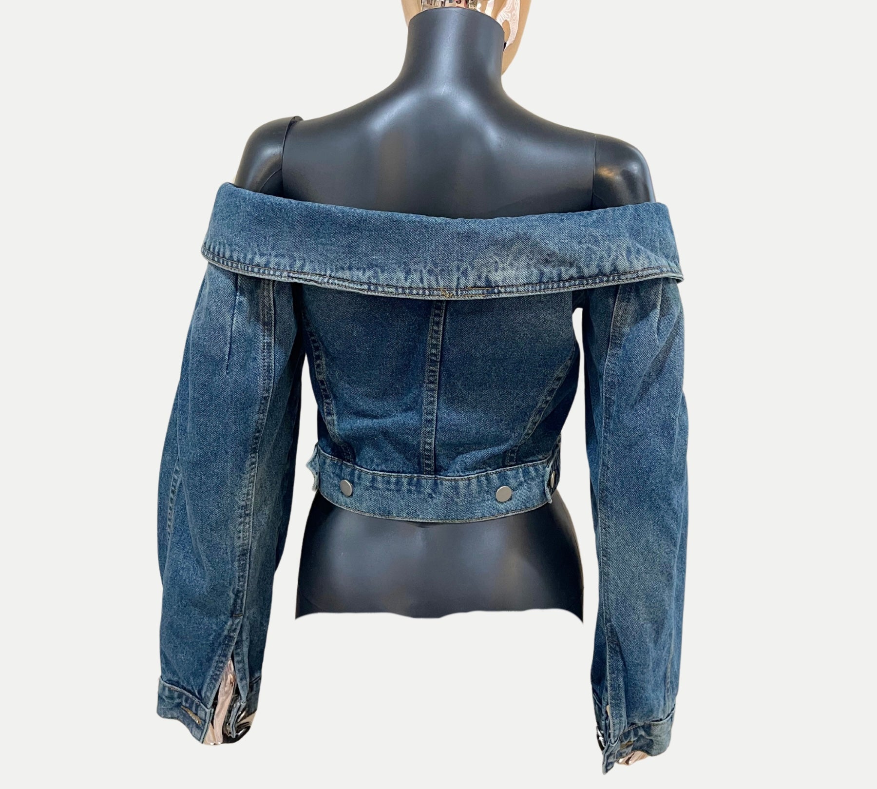 Add a touch of chic style to your wardrobe with this Off-the-Shoulder Crop Denim Jacket from our Sample Sale! Featuring a flattering off-the-shoulder design and a cropped fit, this jacket offers a stylish, modern twist on classic denim. The front button closure adds a timeless element, making it easy to pair with jeans, skirts, or dresses for a laid-back, fashionable look. Perfect for any occasion, this versatile jacket won’t last long—grab yours today!