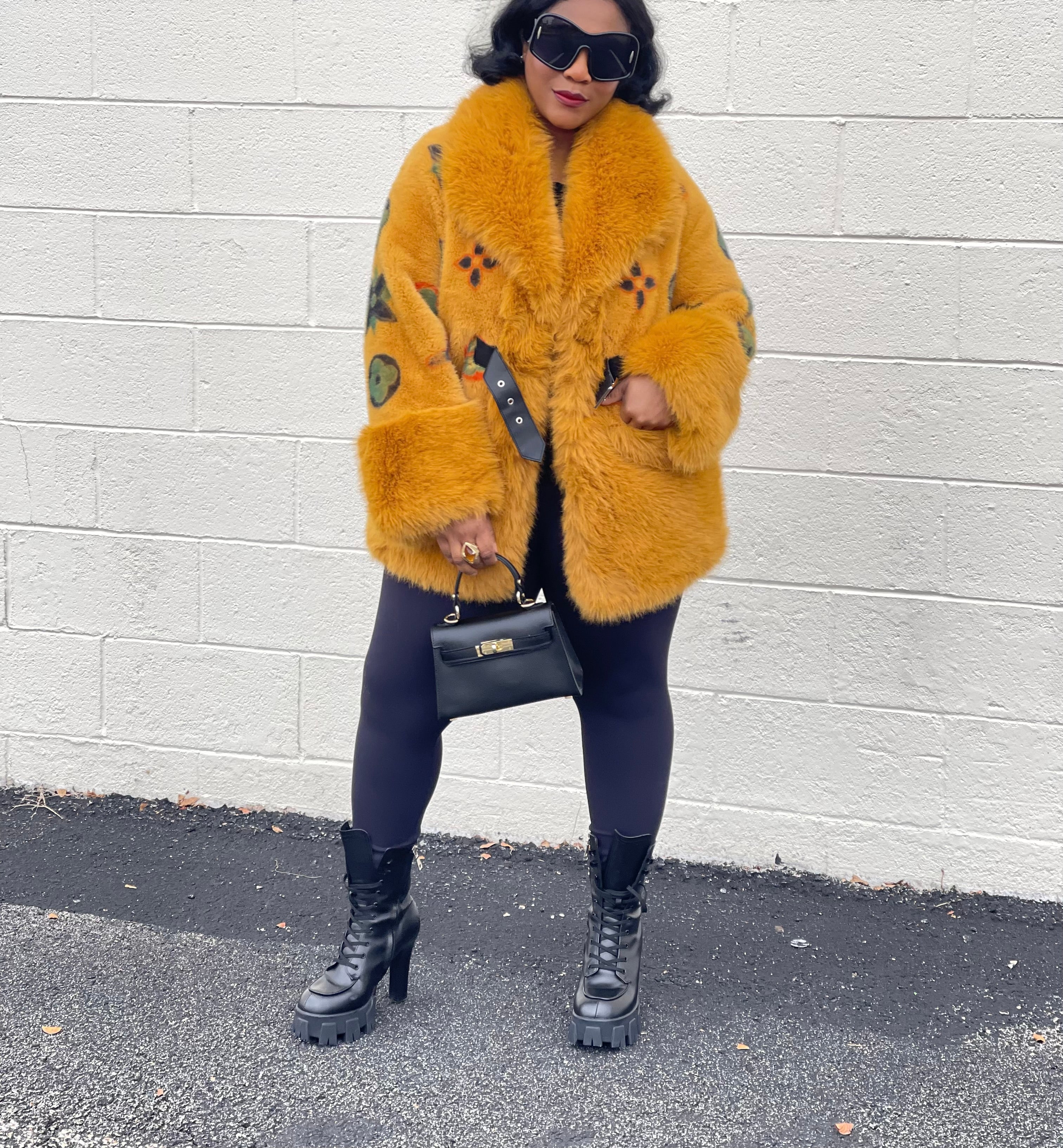 The Nyansapo Jacket captures attention with its vibrant geometric pattern and sumptuous faux fur finish — a perfect blend of artistry and edge. The plush, fluffy lapel collar adds volume and drama, while the front vegan leather adjustable buckle closure creates a sleek, structured contrast.