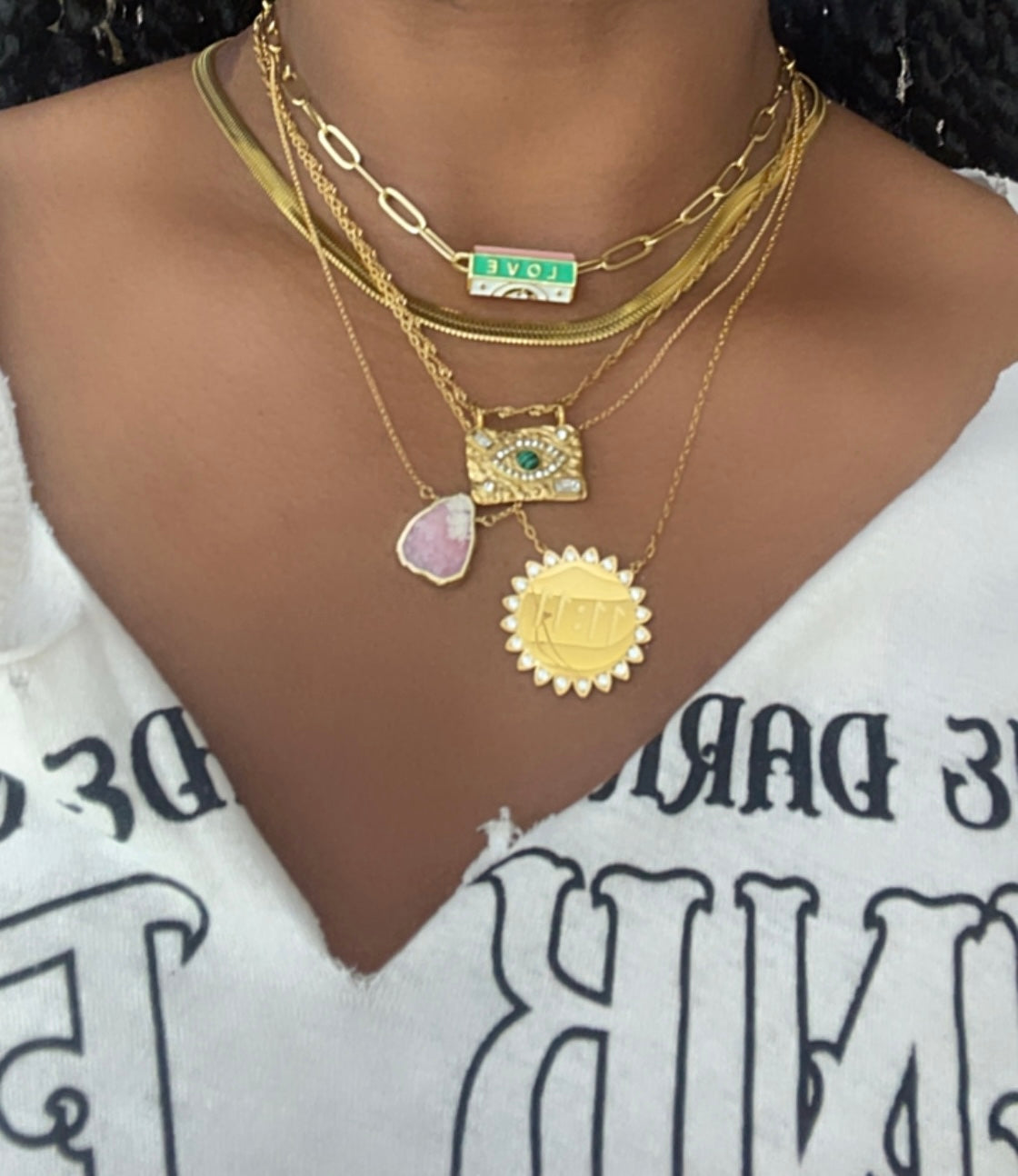 Indulge in luxe yet playful elegance with our Pink Love Necklace. This vintage-inspired piece features a charming enameled pendant on a chic gold plated paperclip chain. Each necklace is hand engraved and hand enameled, adding a personal touch to this fun piece. Dress up any outfit by layering it with longer chains for a sophisticated look.