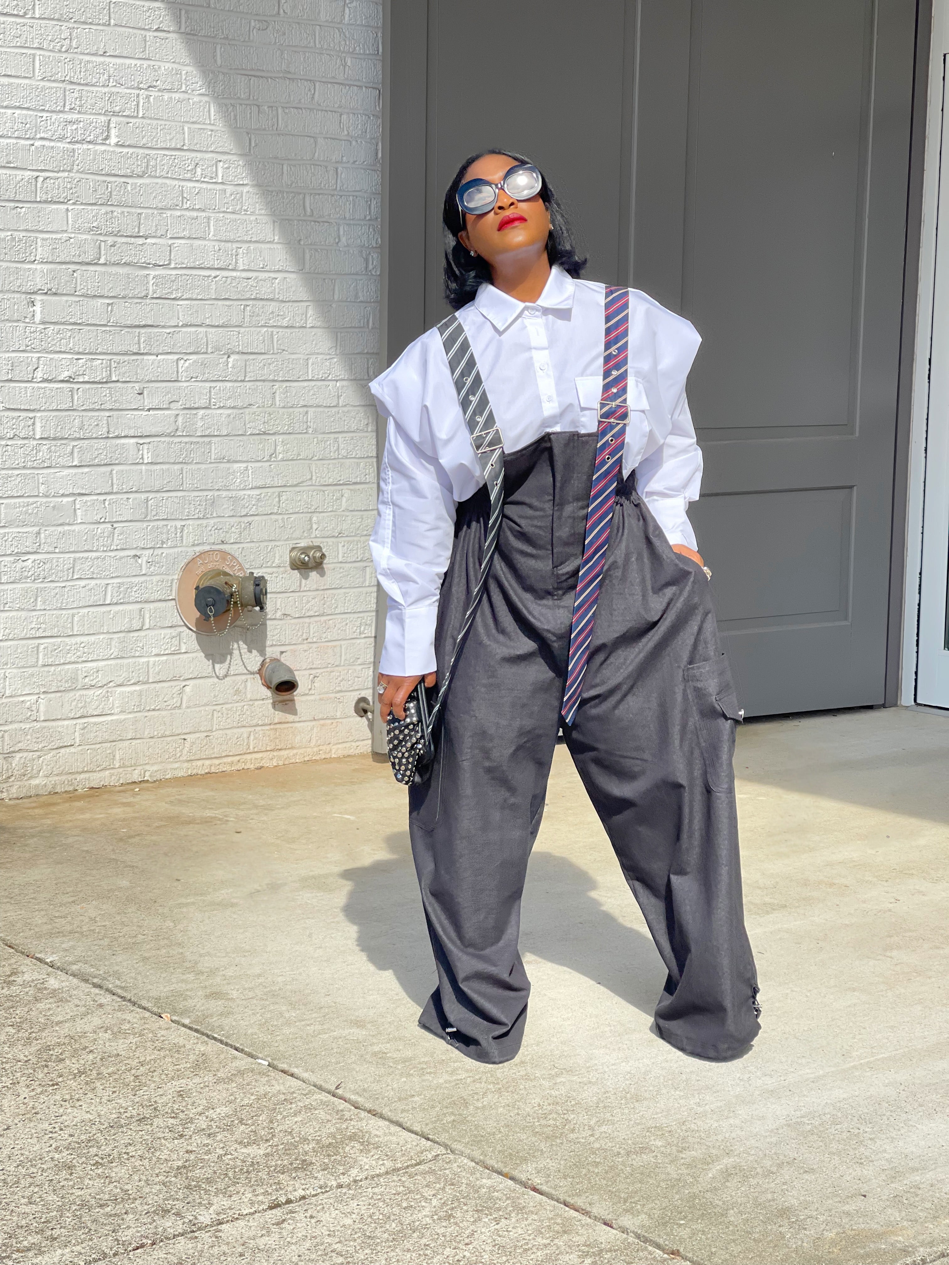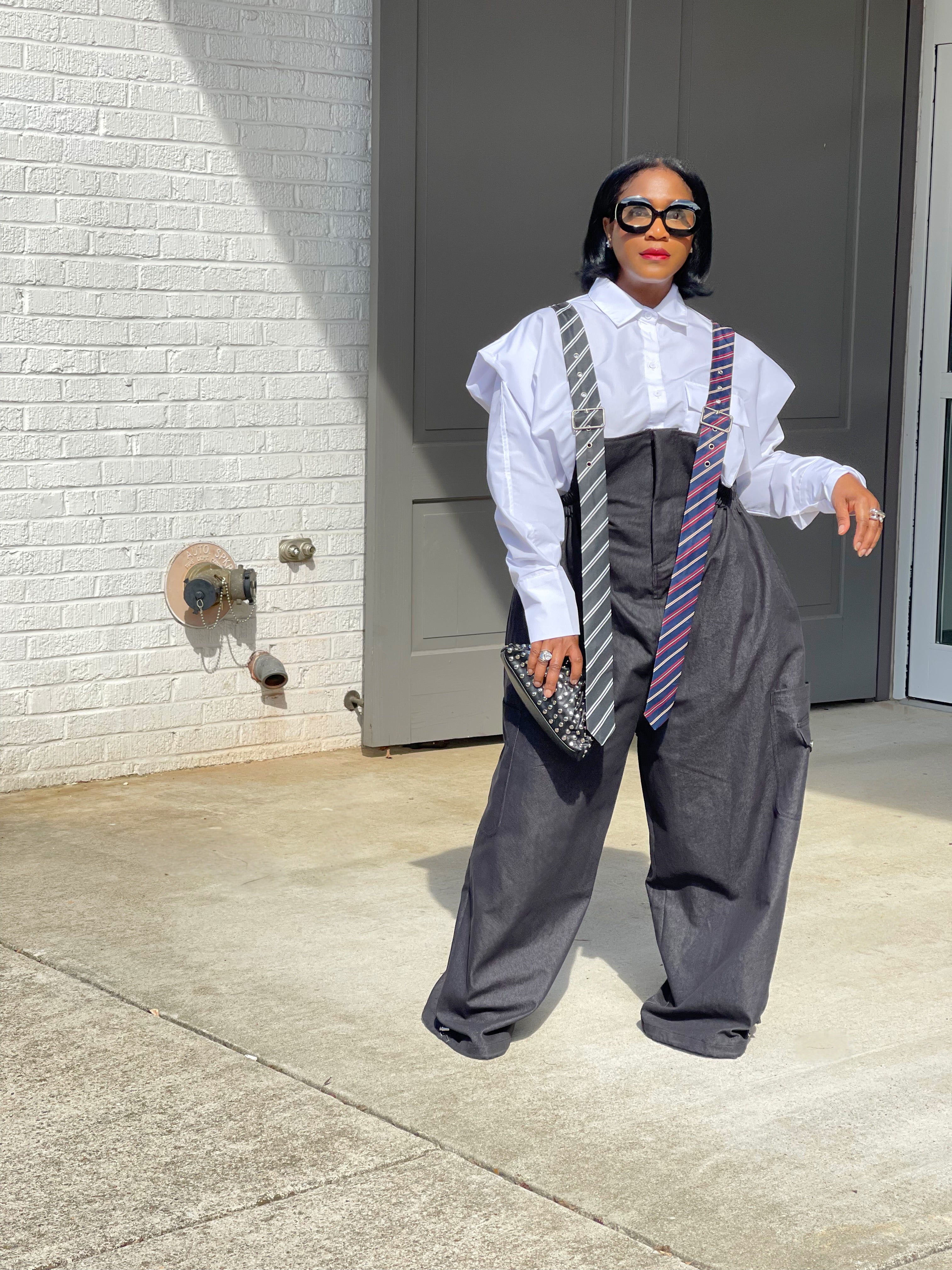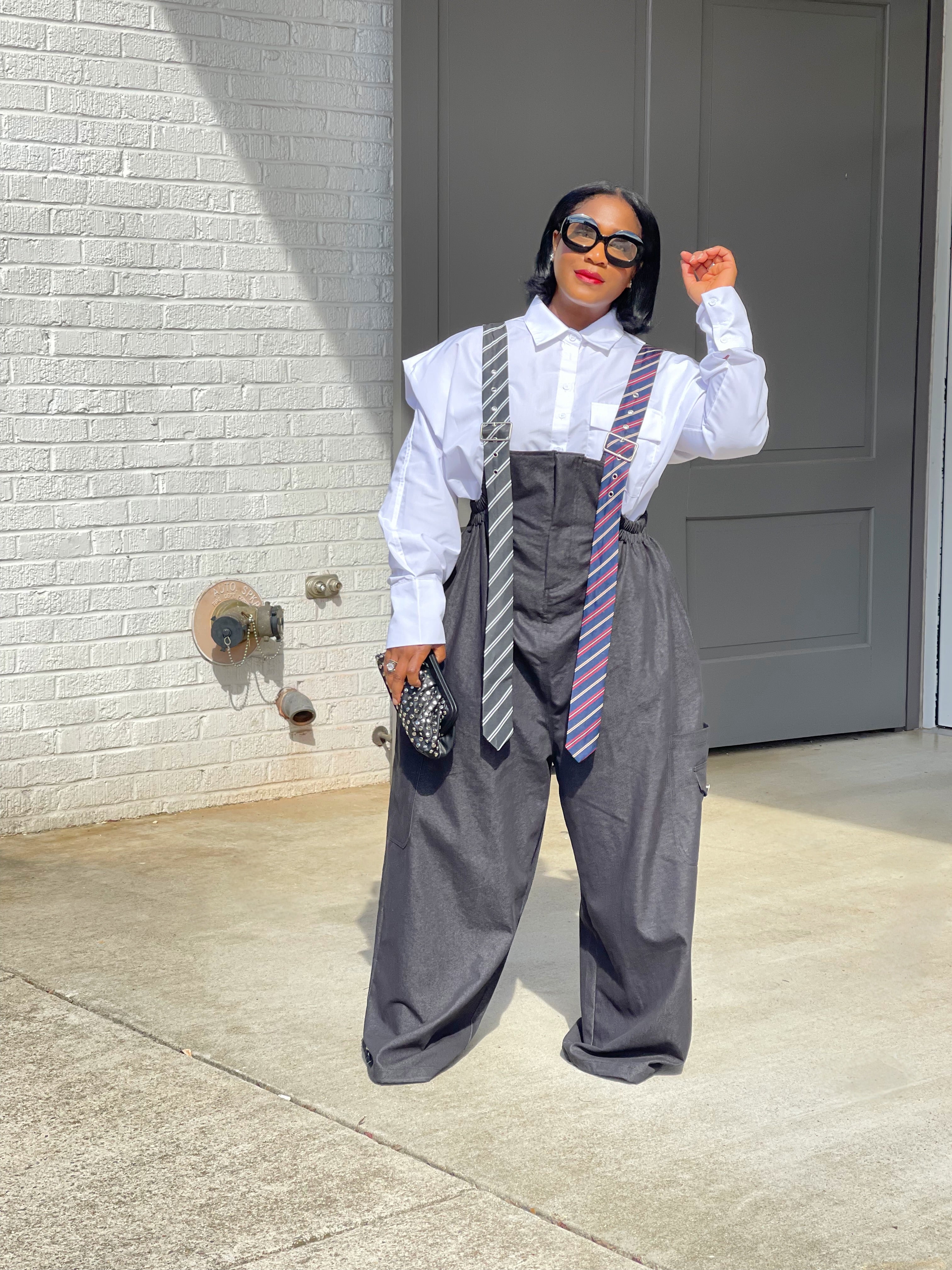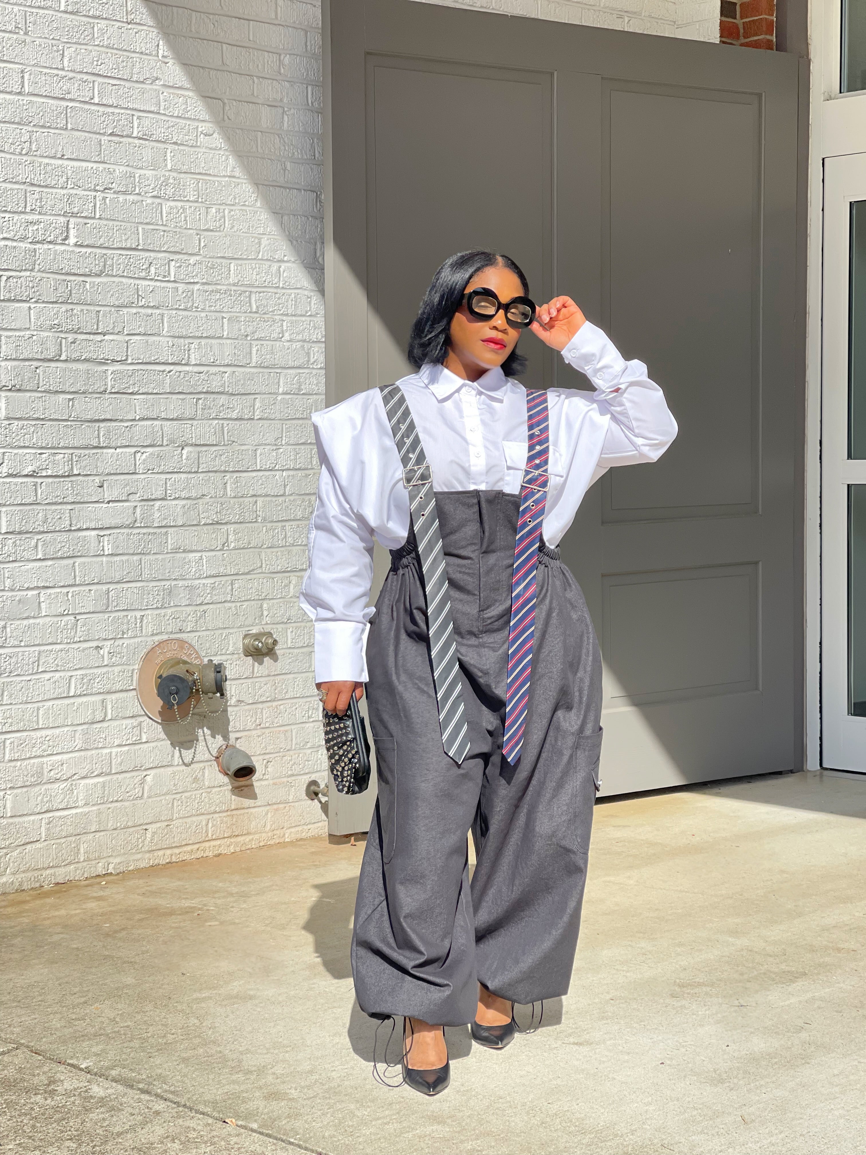 The show-stealer? The suspenders. They’re designed in an exaggerated, ultra-long length and resemble striped neckties, turning a classic utility piece into a statement.