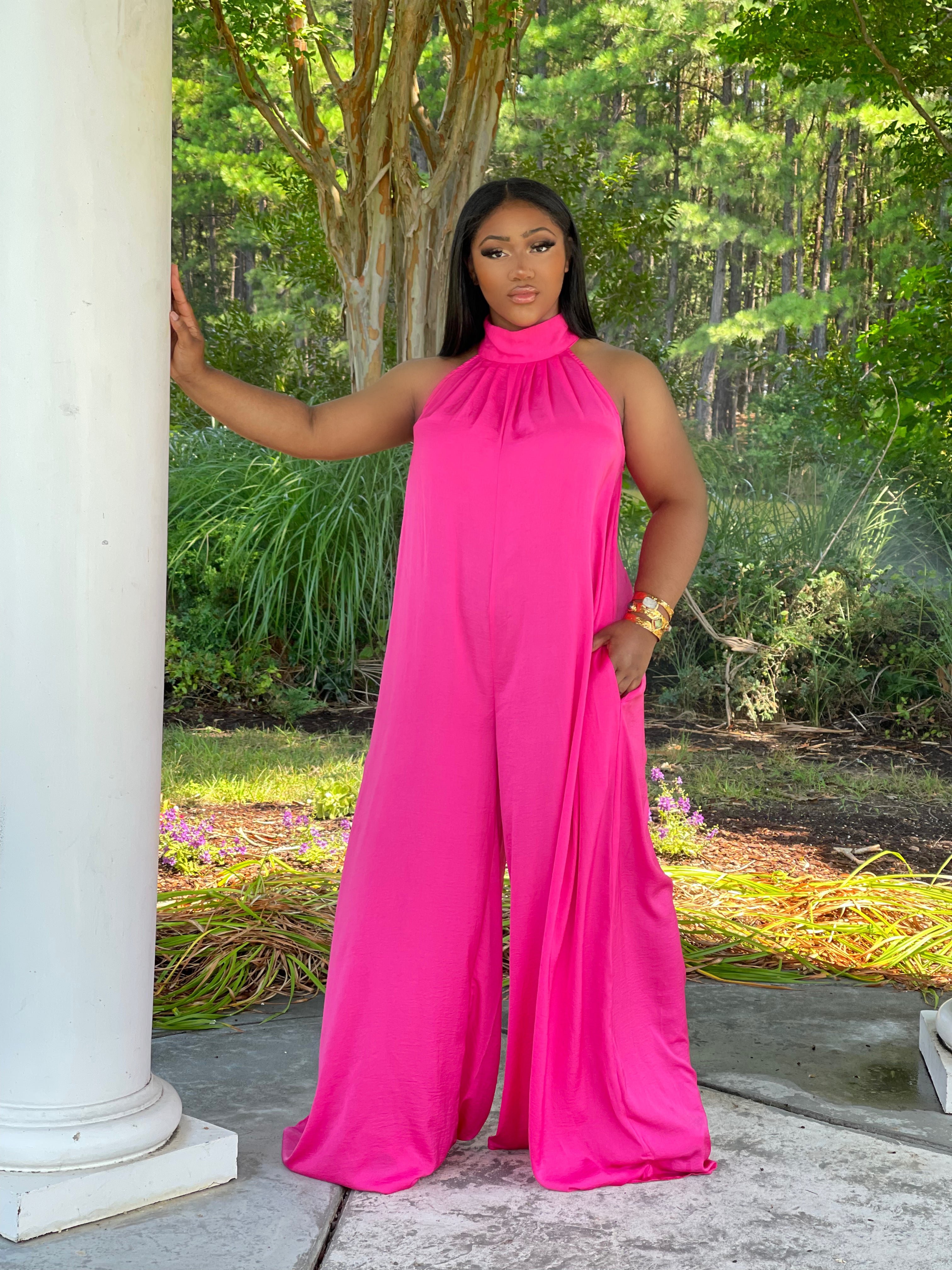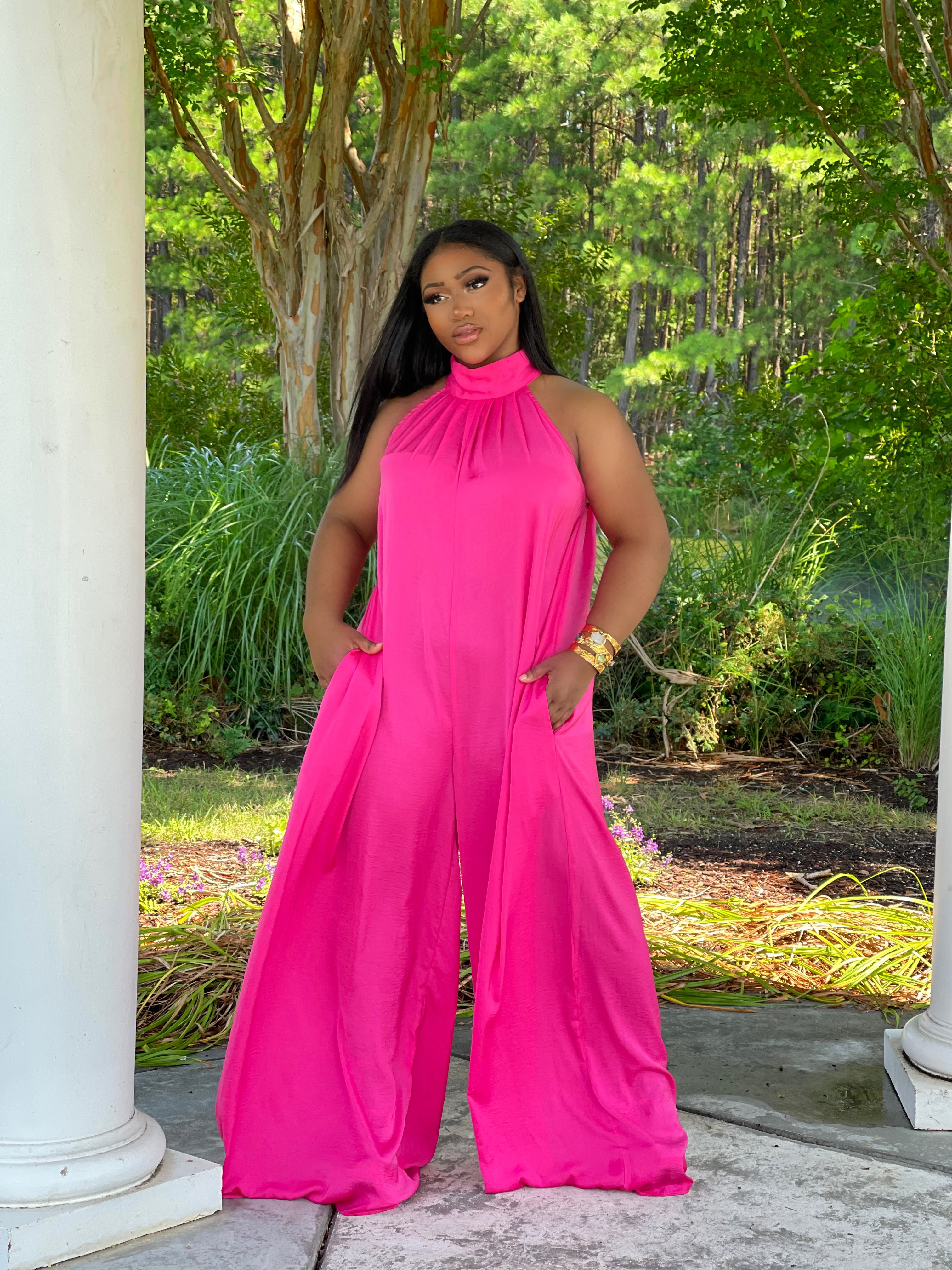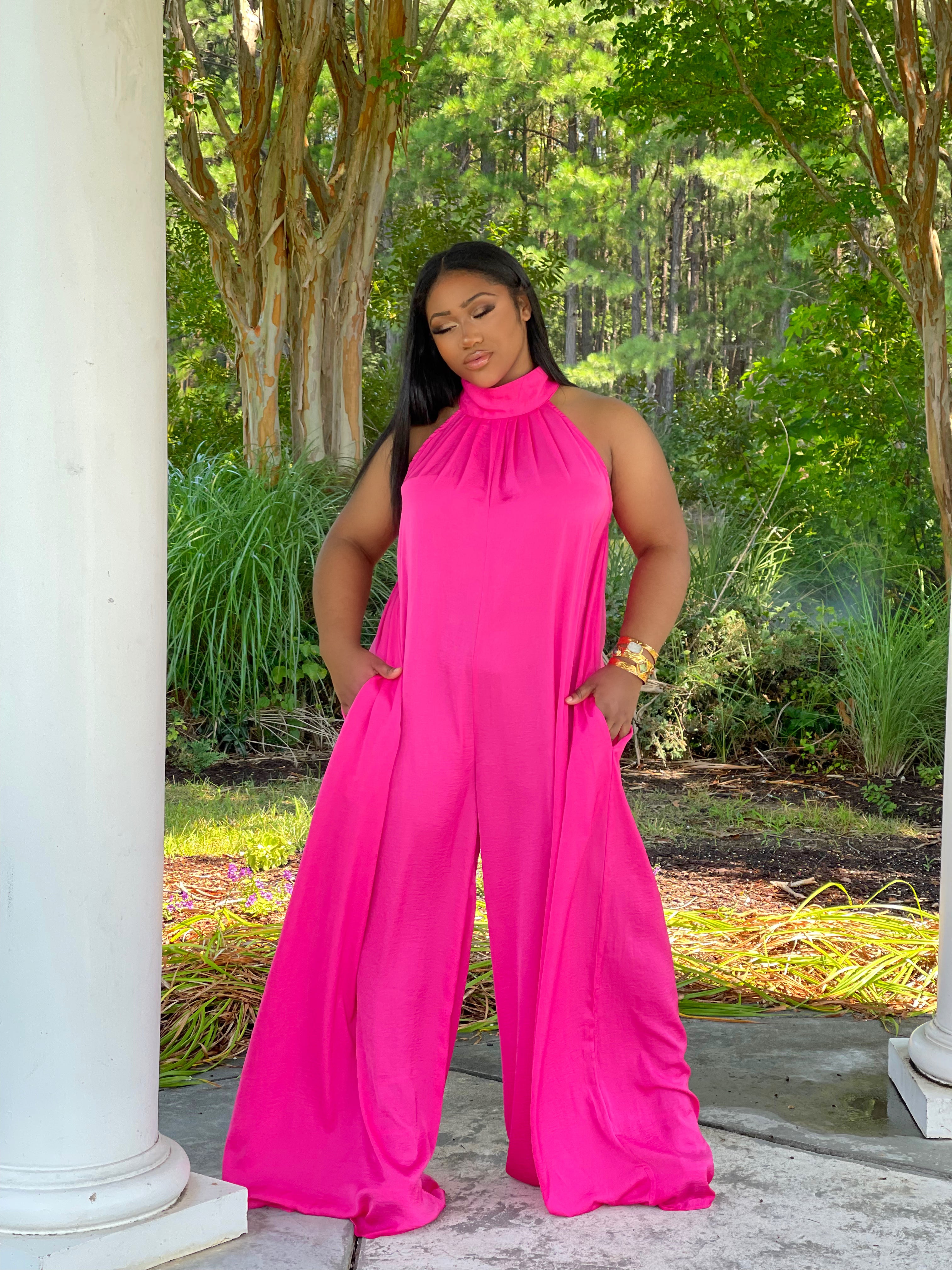 Ladies, don't we just love a breezy jumpsuit! Relax in chic style with this textured satiny wide leg jumpsuit. High neck, side pockets and back key hole. Available in bronze and hot pink.