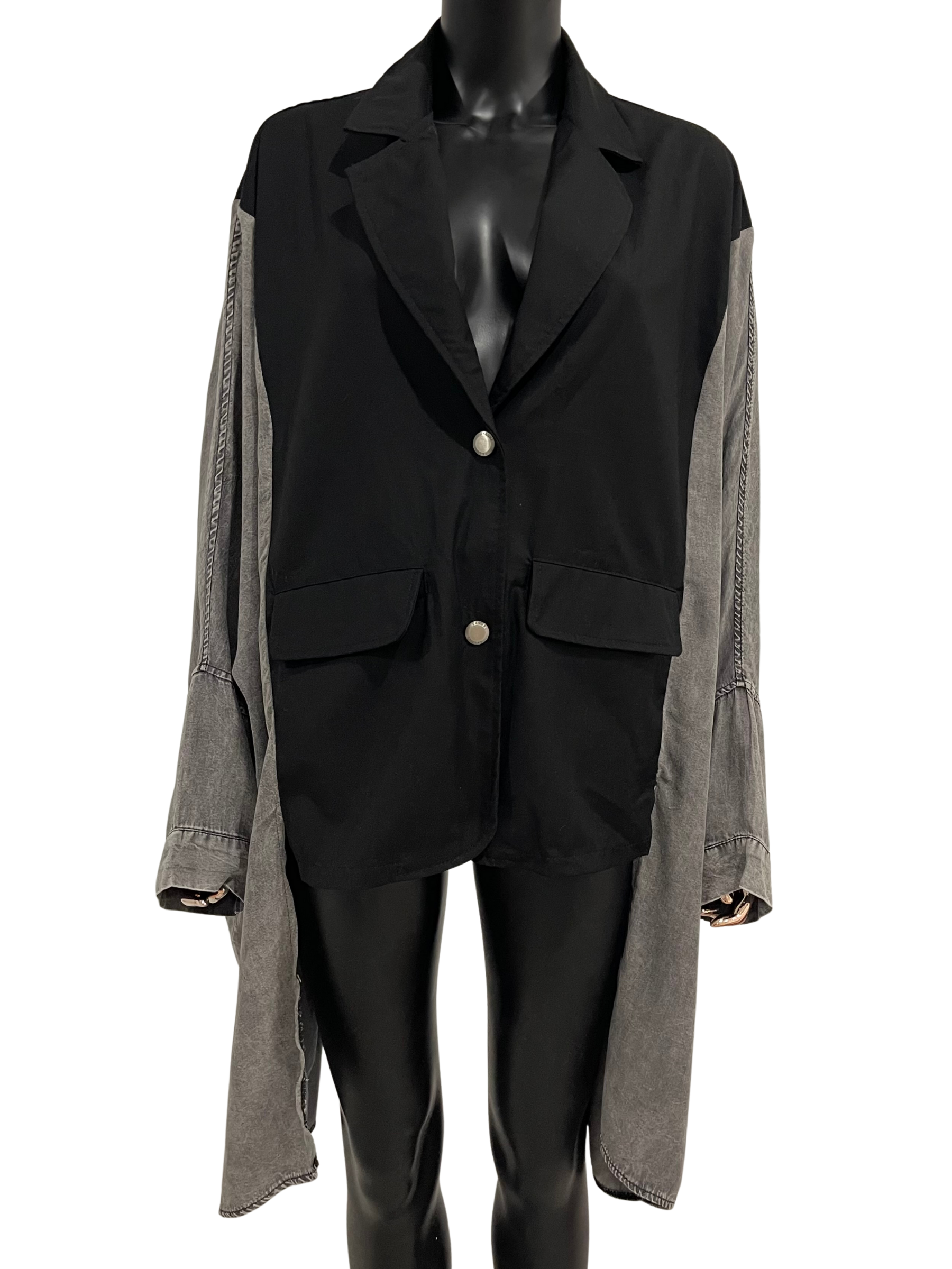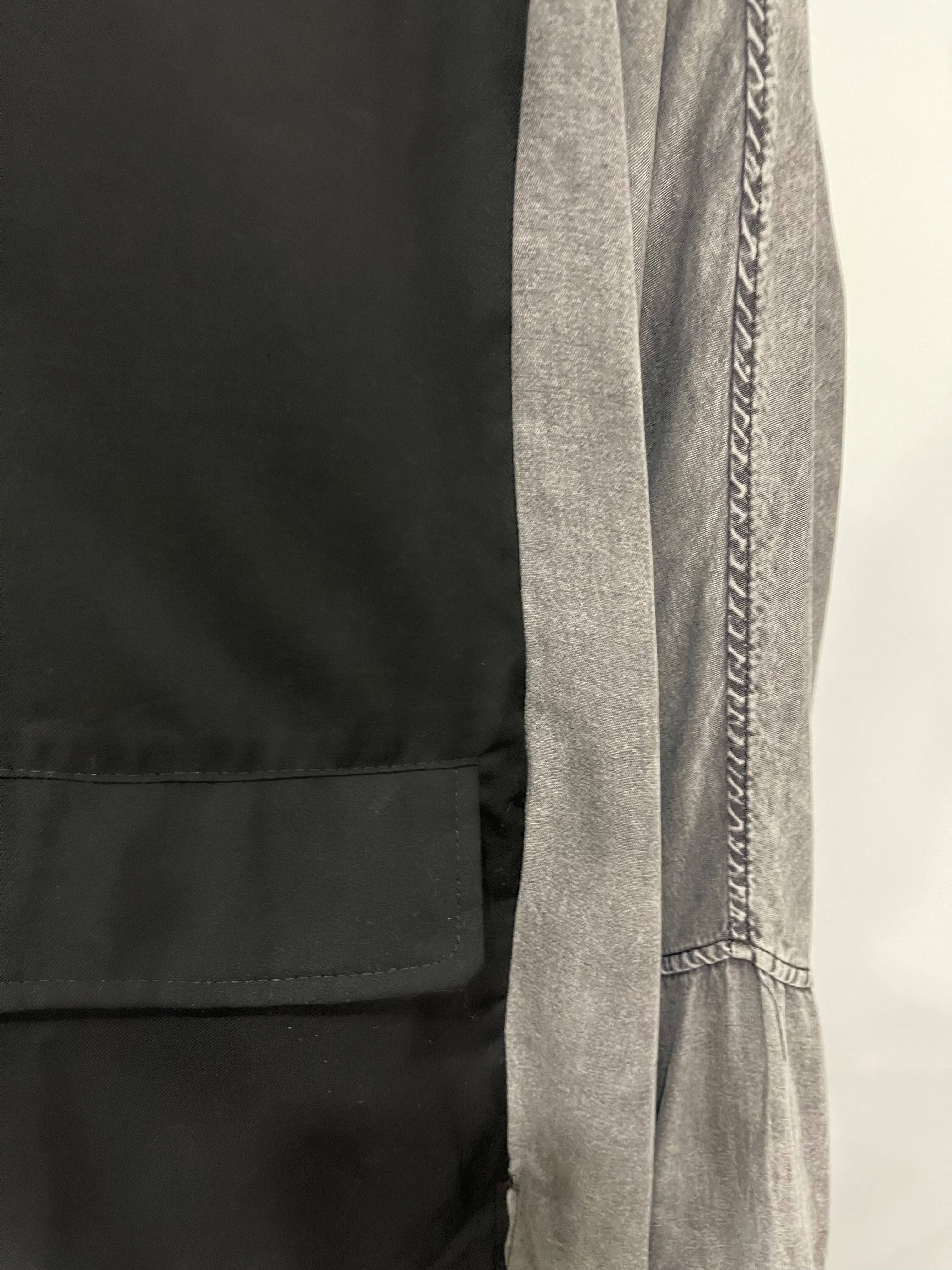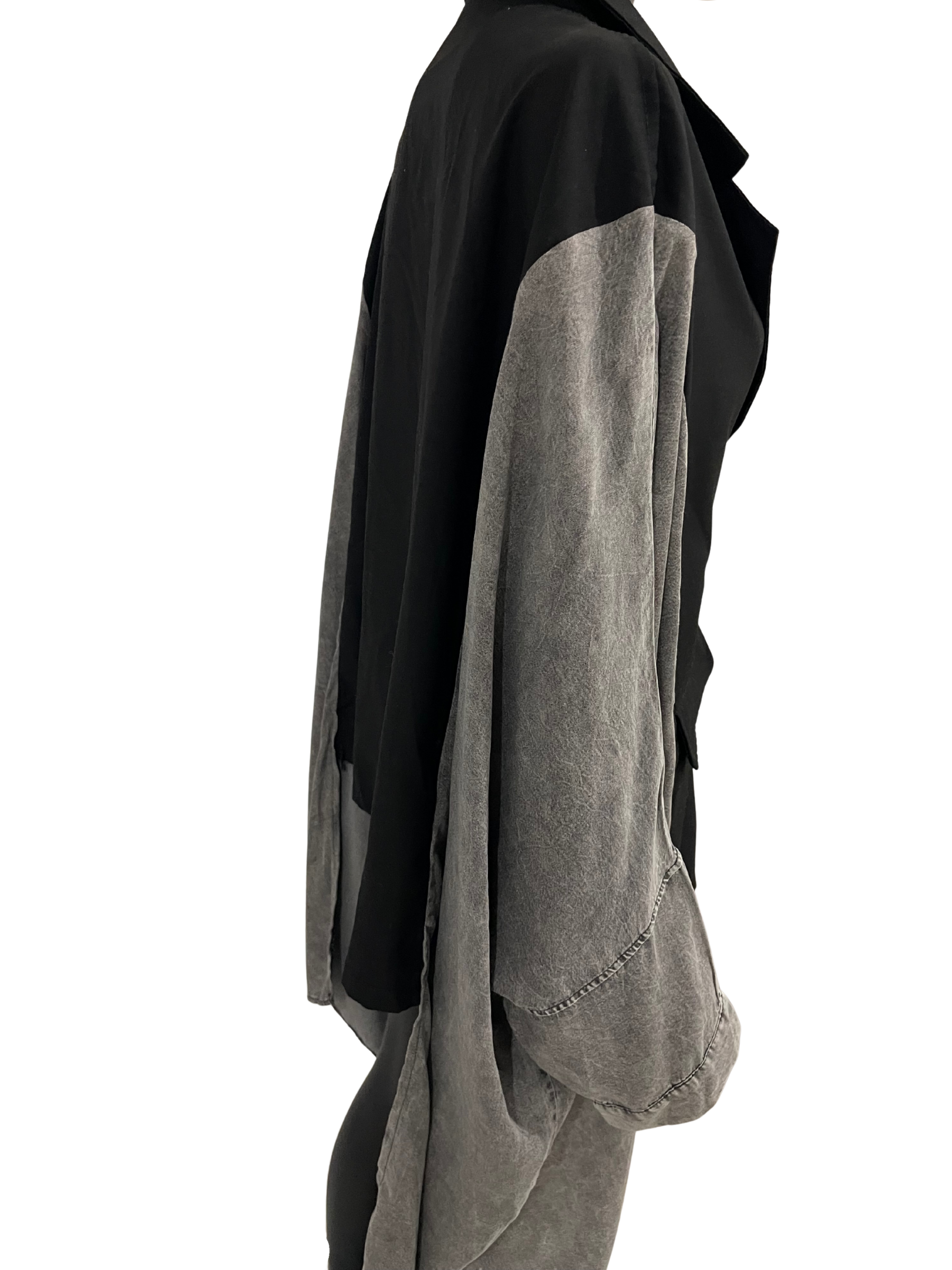 A relaxed-fit blazer designed with a softly structured body and elongated dolman sleeves. The contrast charcoal denim–washed sleeve panels create a distinctive drape and add an understated edge to the classic tailored silhouette.