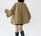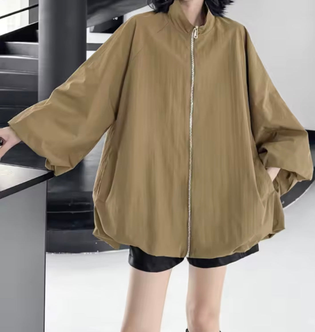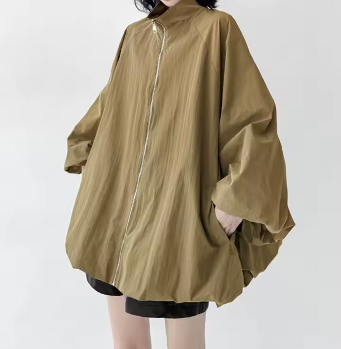 An effortless statement layer with a modern twist. This khaki bubble jacket features voluminous, wide bubble sleeves for instant style, a sleek front zip closure, and discreet side pockets for on-the-go ease. Lightweight yet cozy, it drapes with a soft, sculptural shape that elevates everything from denim to dresses.