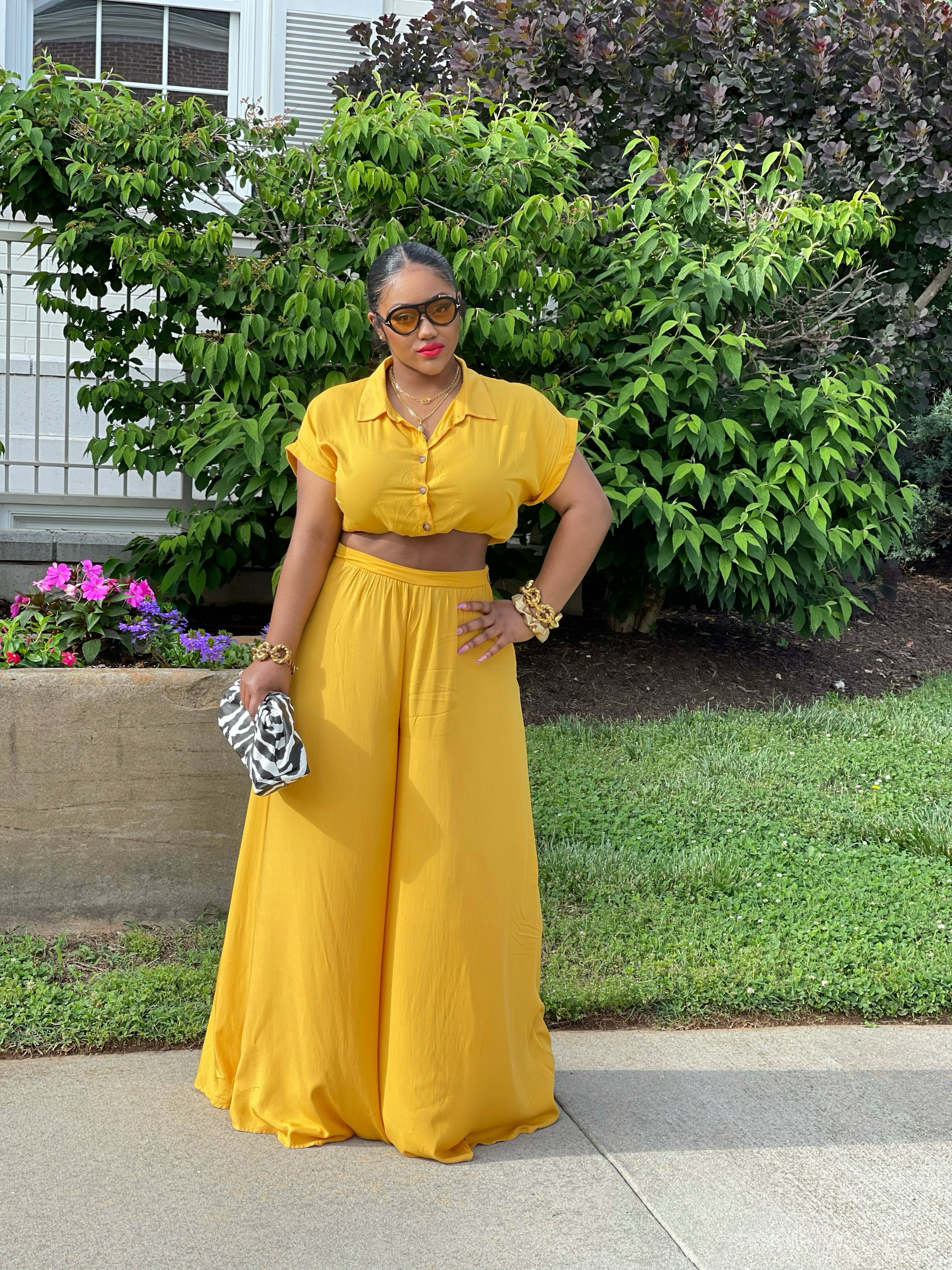 GOLDxTEAL chartreuse color wide leg linen pant set with matching bra top.