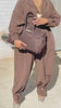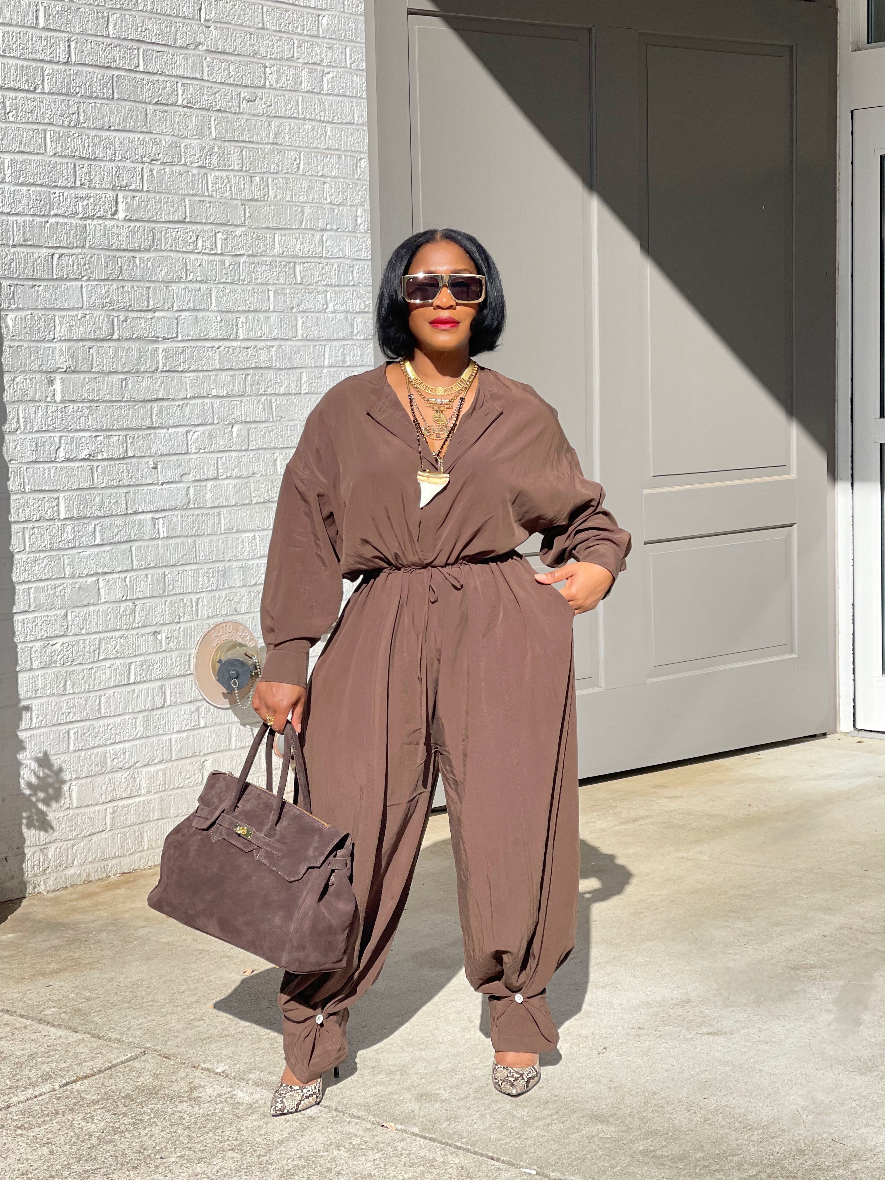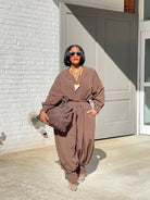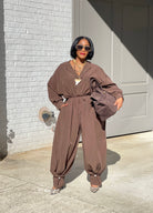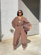 Details like the half-button front, drawstring waist, and optional hem buttons let you customize the shape — cinch the ankles for a gathered jogger look or wear them loose for a laid-back straight leg. Long sleeves, side pockets, and a just-right dose of structure make this an easy one-and-done outfit that’s equal parts polished and effortless.