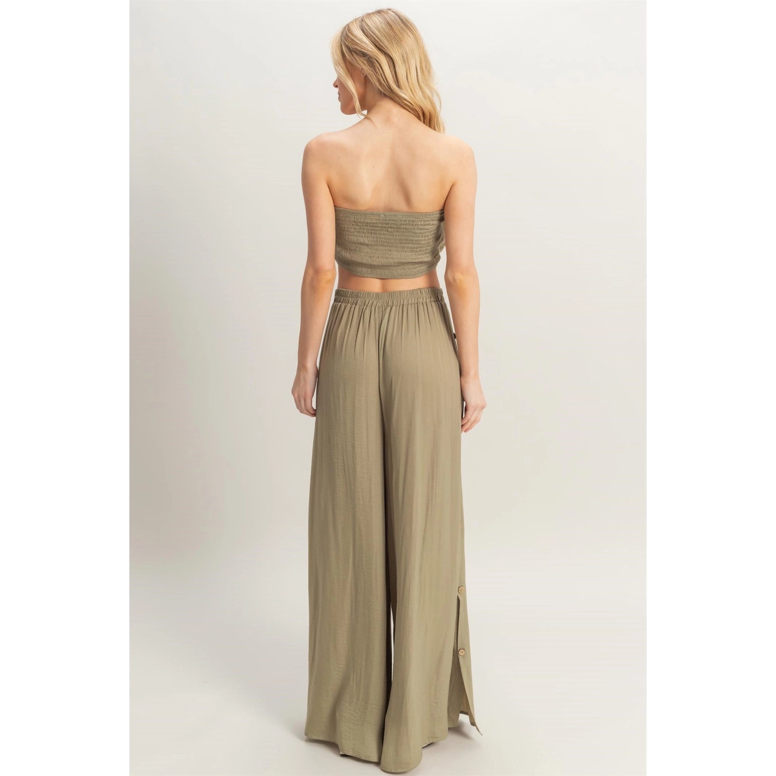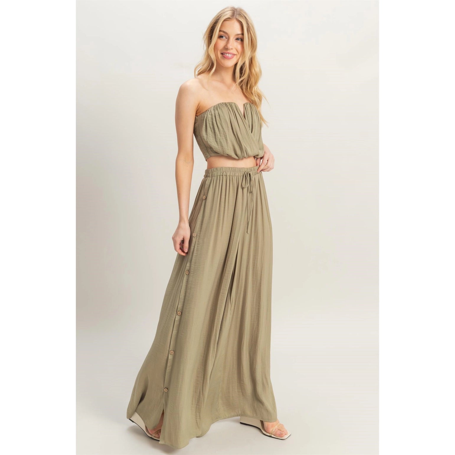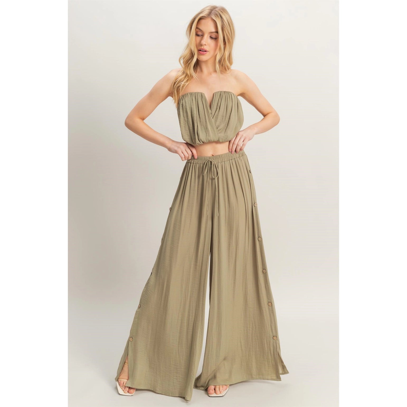 The strapless crop top features flattering ruched detailing and an elegant overlapping bodice, perfectly paired with high-waisted wide-leg pants designed for both comfort and polish. Whether you're headed to brunch, the beach, or lounging on a yacht, this set delivers resort-ready style with a modern twist.