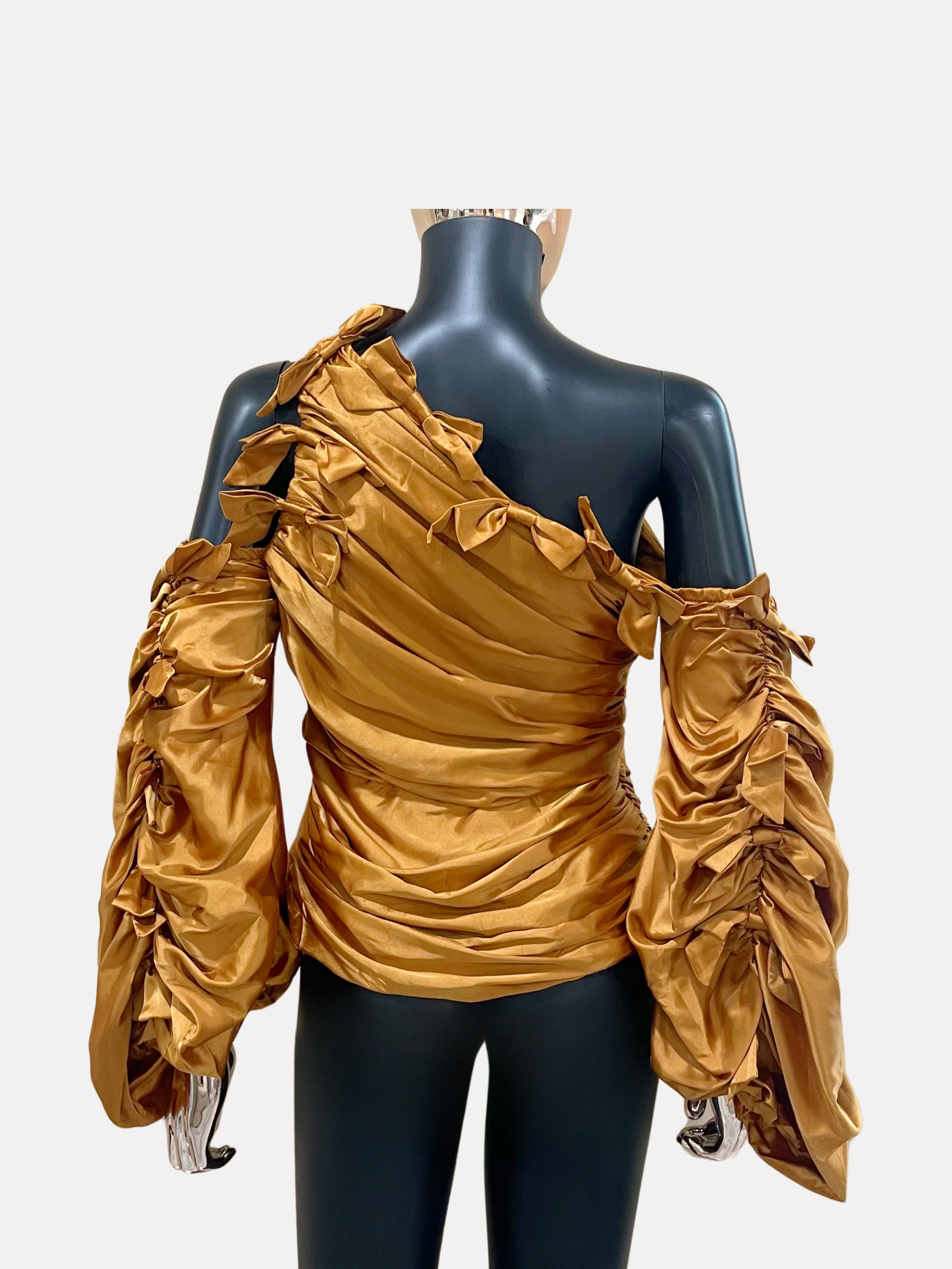 Turn heads and capture the light in our Golden Hour One-Shoulder Top—a lustrous statement piece in a radiant golden bronze hue. Crafted with a satiny, liquid-silk feel, this top blends bold elegance with refined detail.