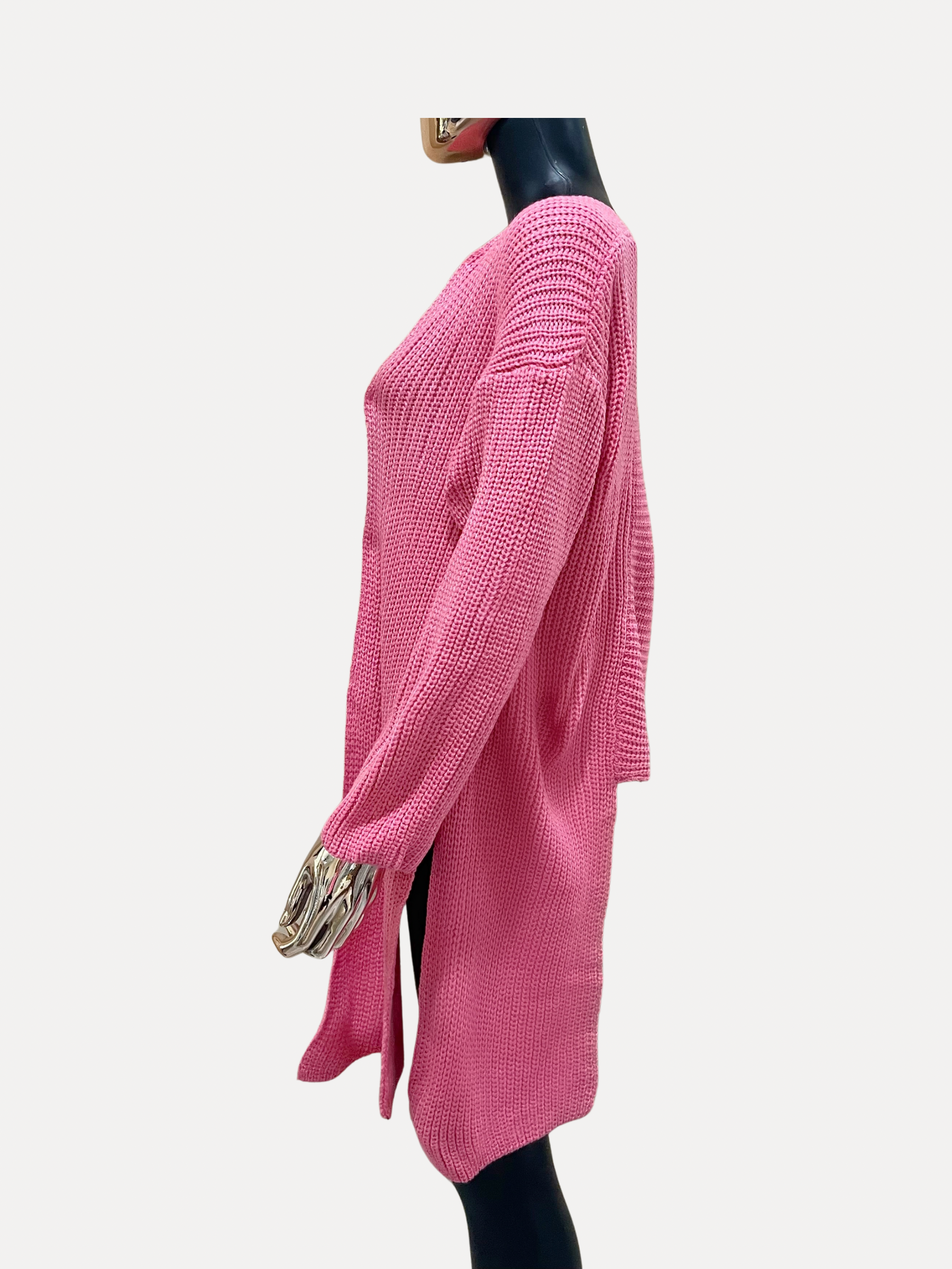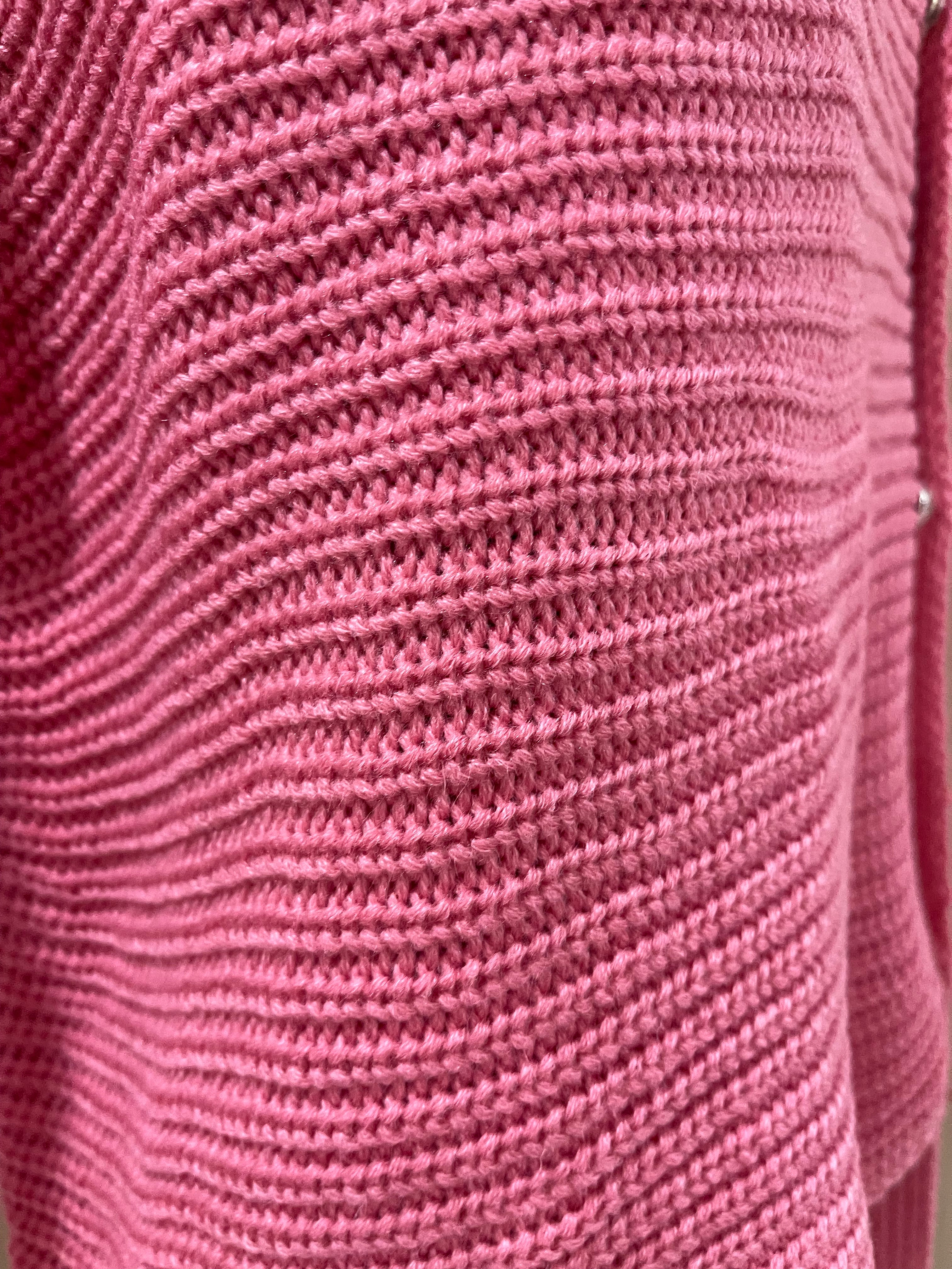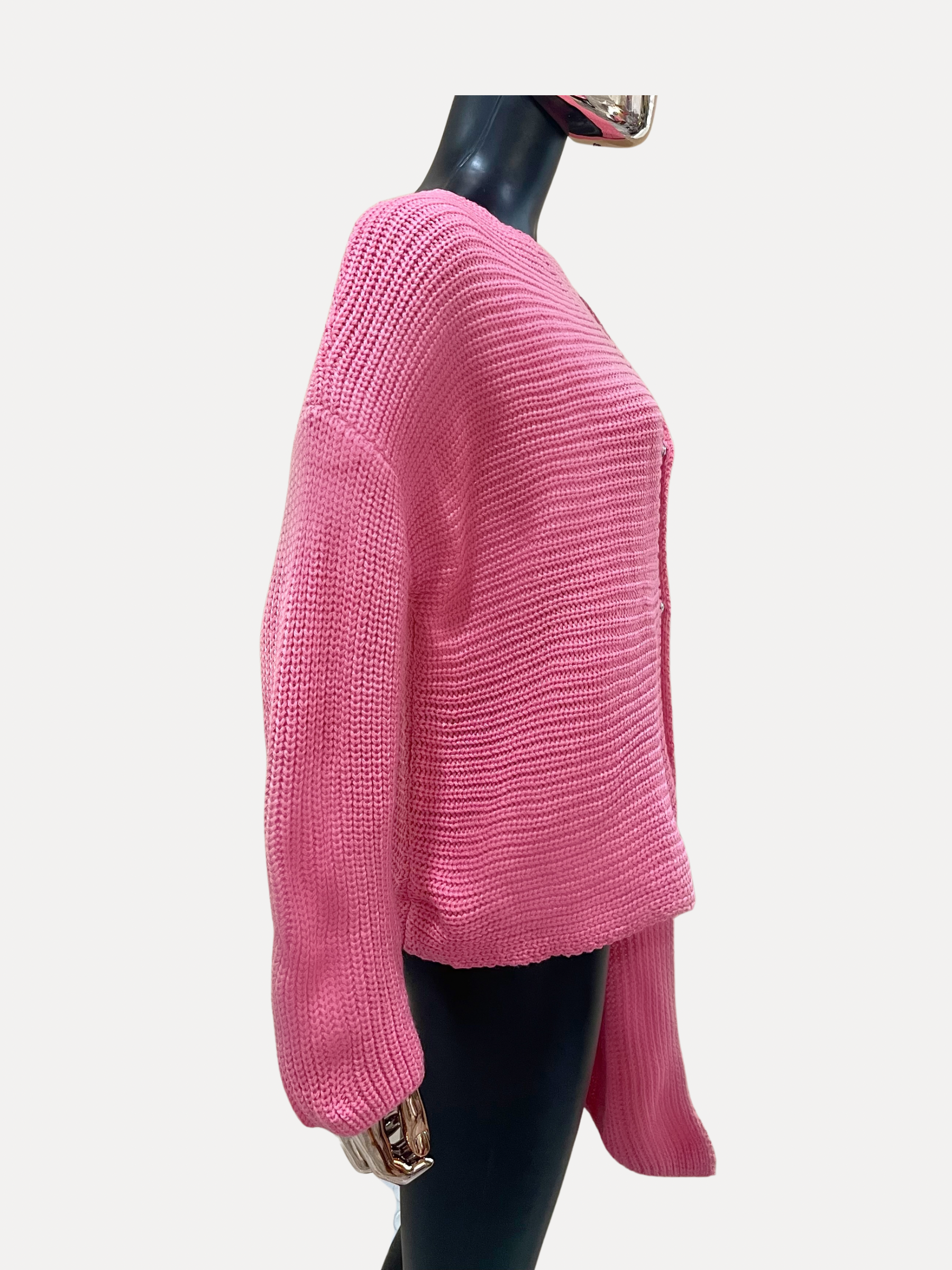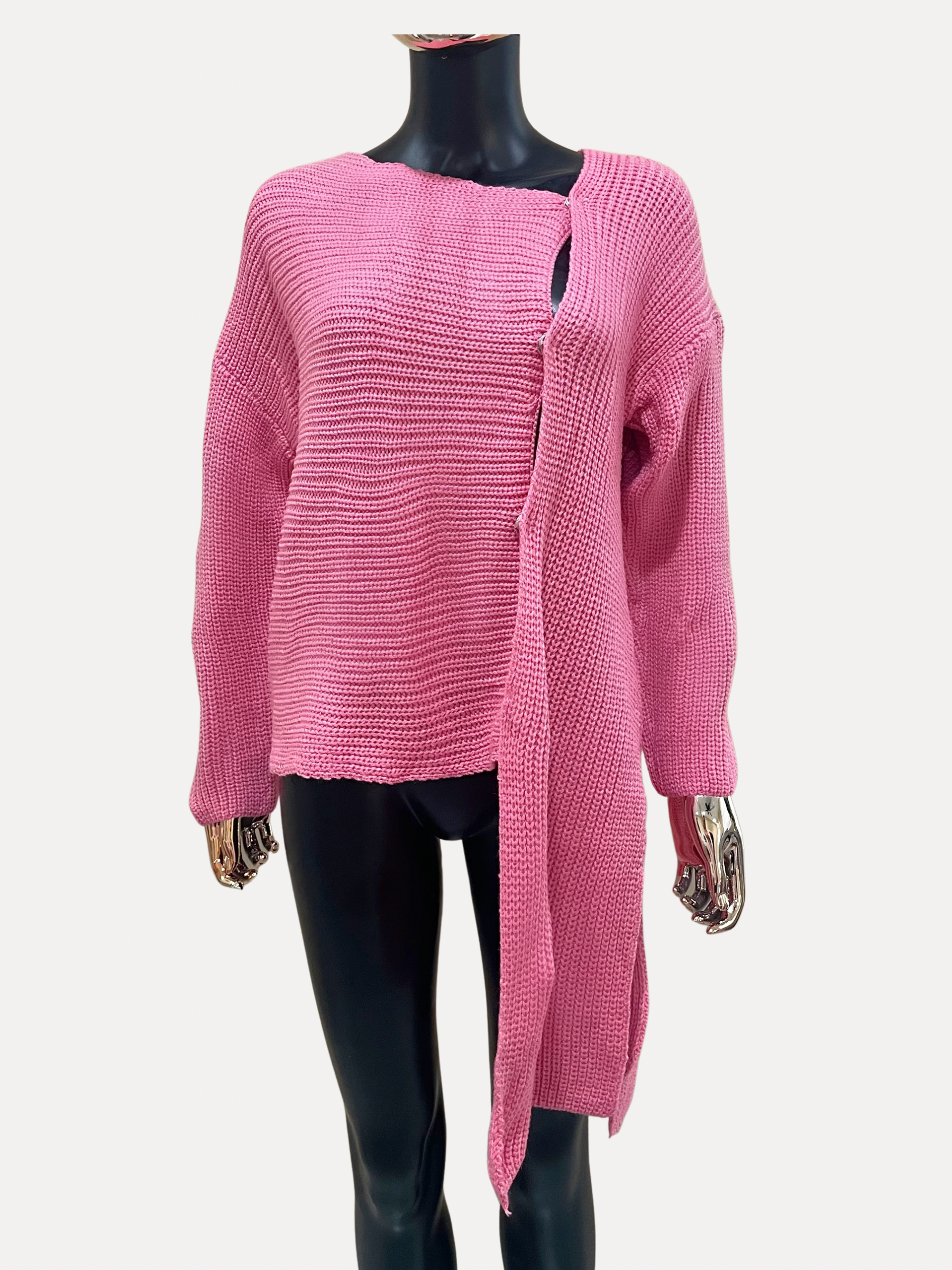 A cozy classic with a contemporary twist. This soft pink knit sweater redefines everyday style with its striking asymmetrical silhouette and side snap button closure. Designed to drape just right, it adds shape and edge to your look while keeping things effortless.