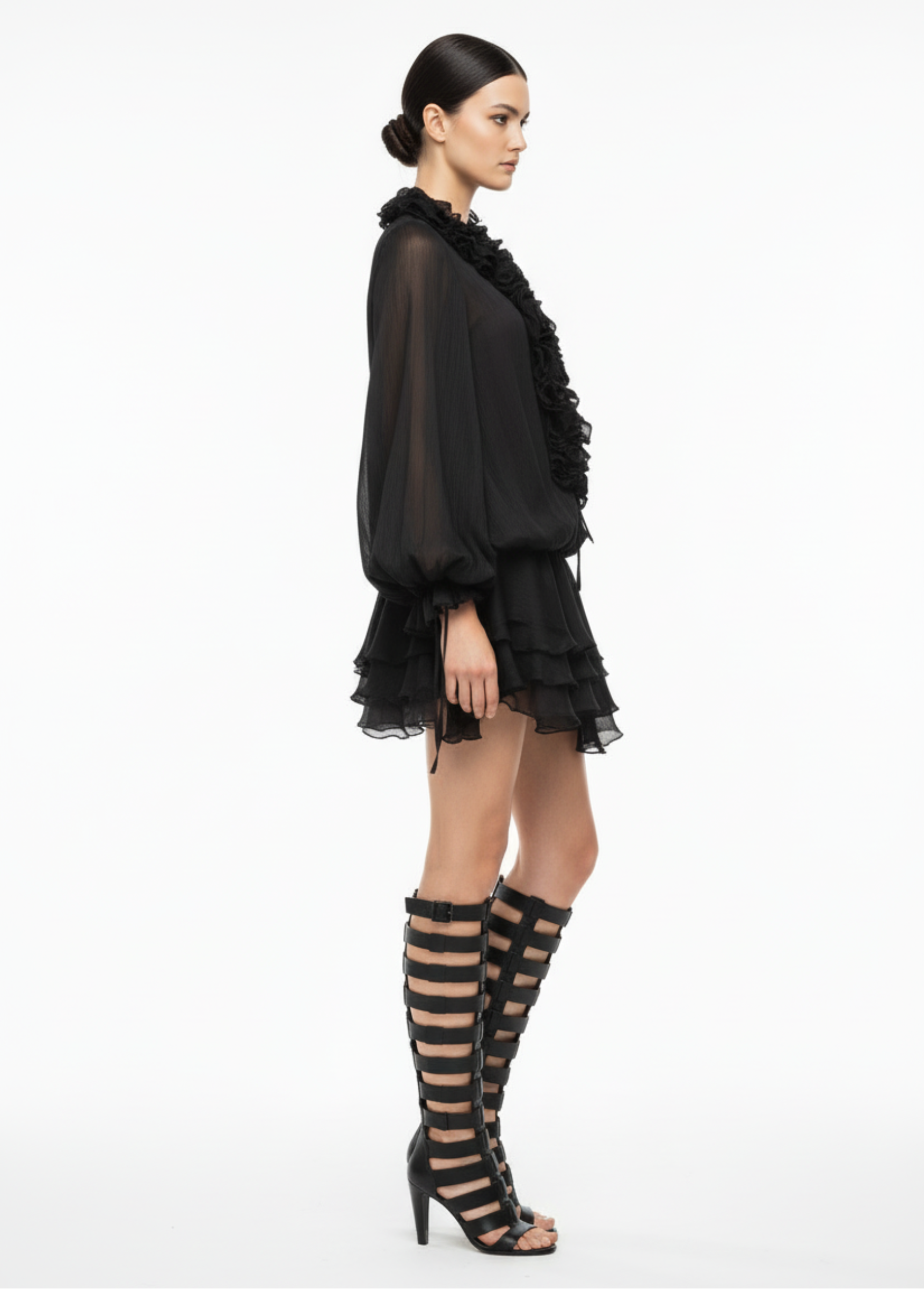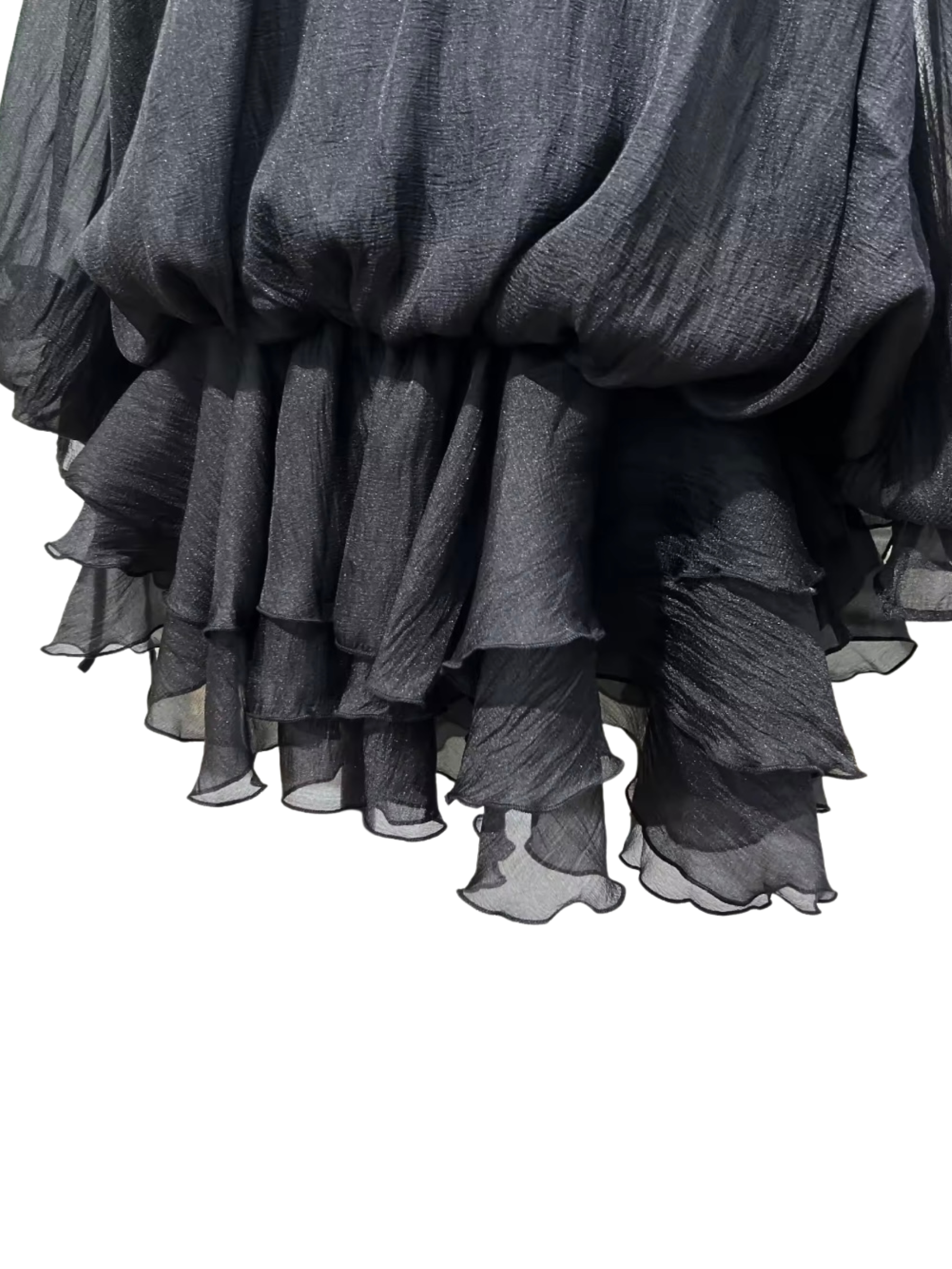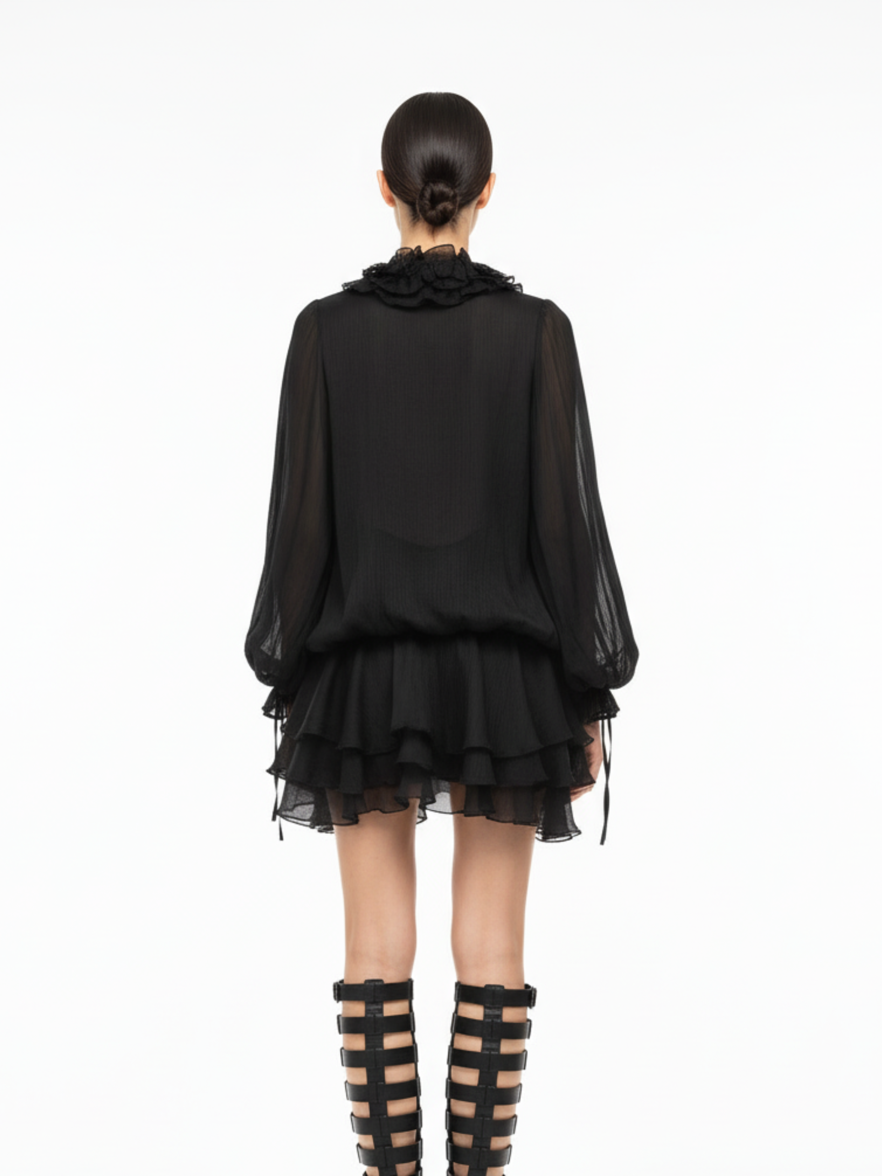 Criss-cross chest ties let you customize the neckline — from softly open to elegantly cinched — while billowy sleeves with adjustable drawstring ties add volume and versatility. The tiered ruffle hem finishes the look with graceful movement and effortless charm.