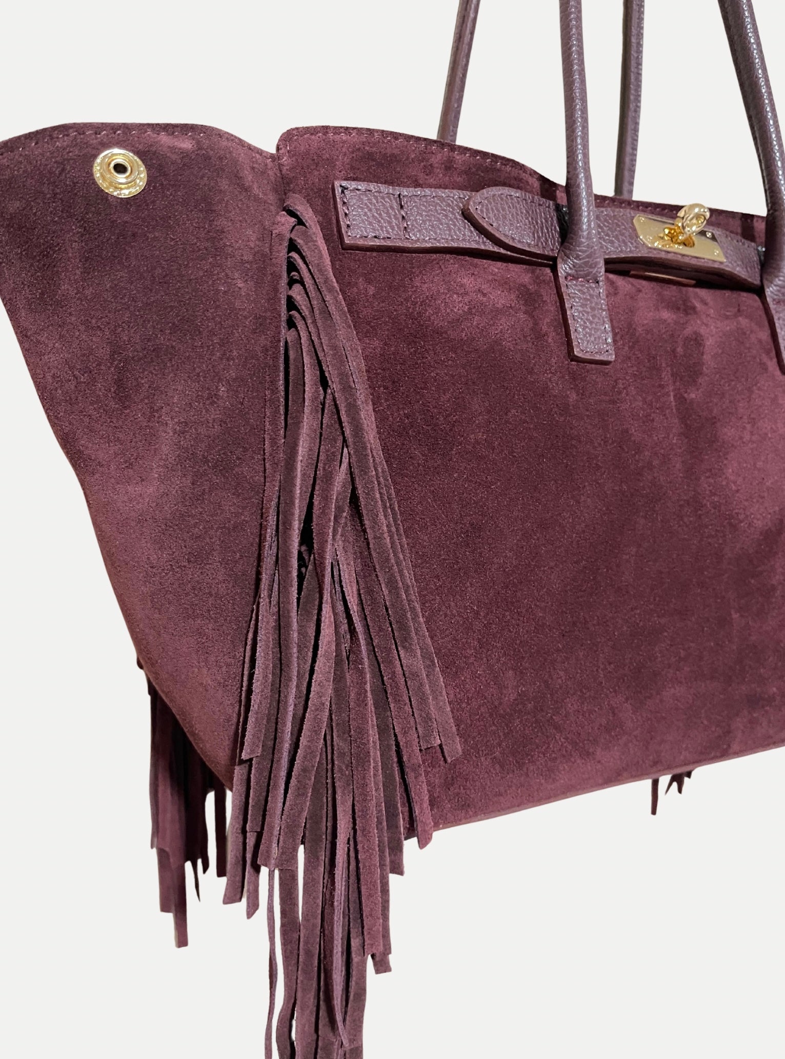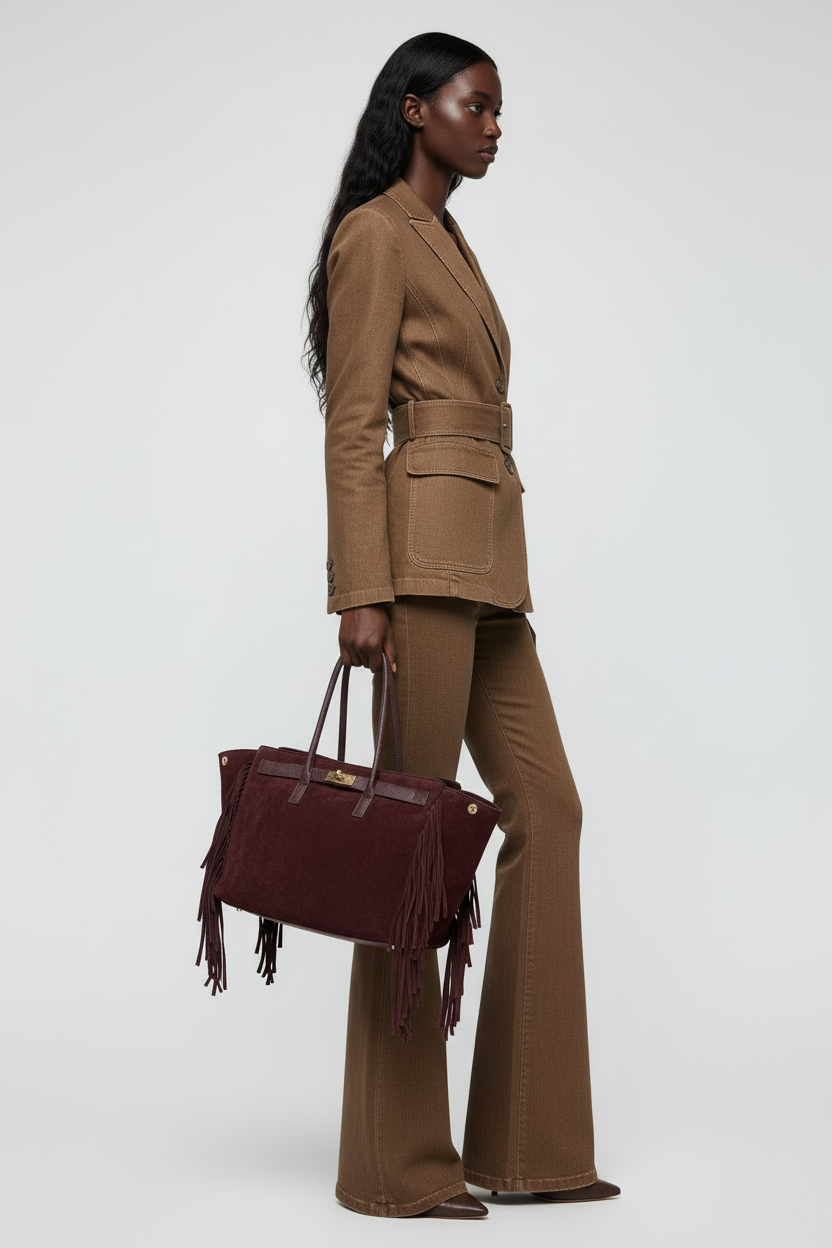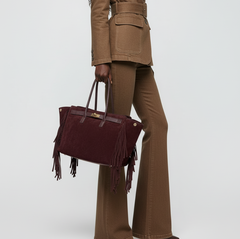 A modern icon with a touch of edge — this genuine suede tote redefines everyday luxury. Designed for the woman who moves with purpose and style, it features bold fringe detailing that runs effortlessly along the front and back seams, creating dynamic texture and movement.