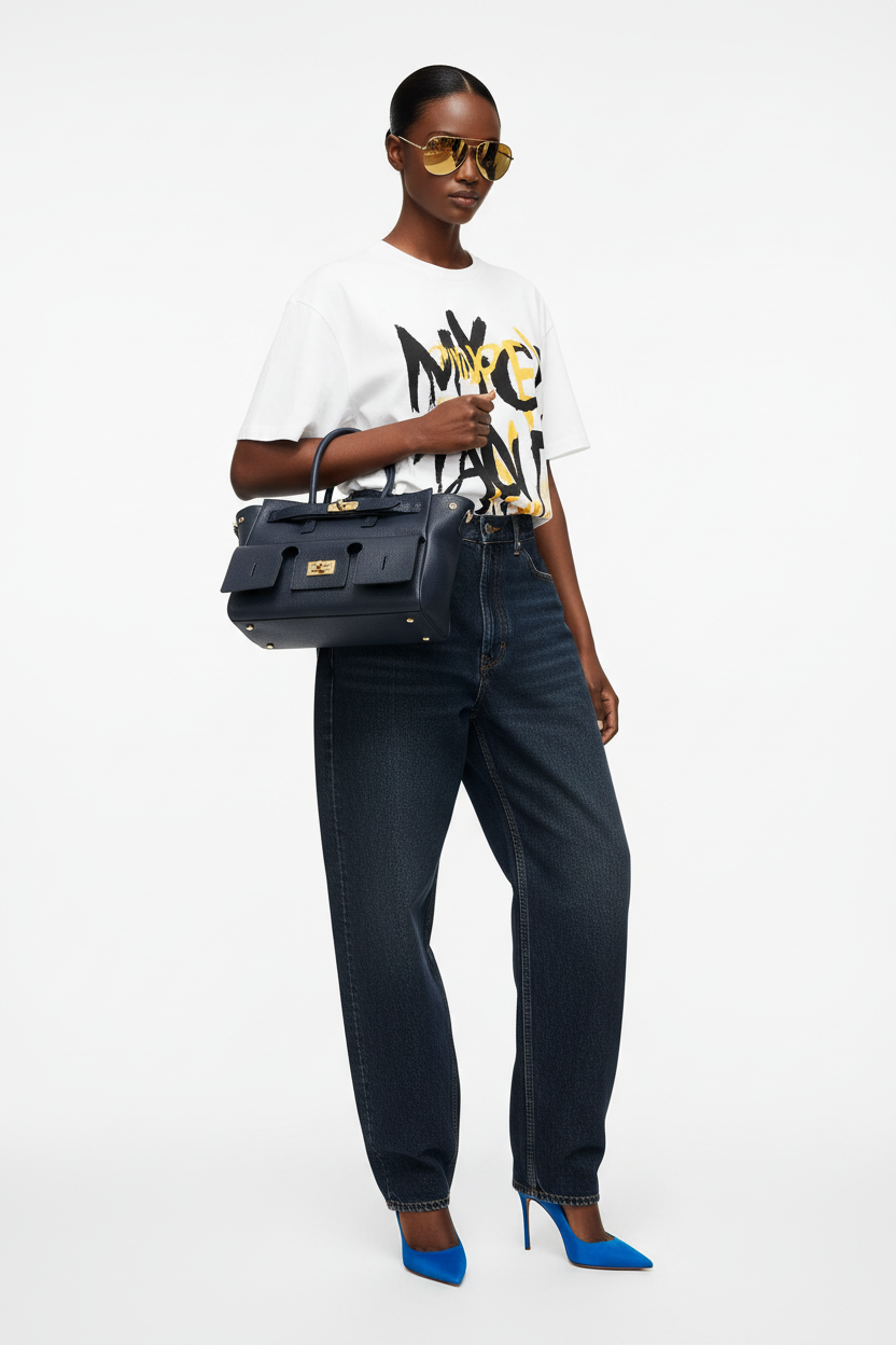 This gorgeous mini tote bag, crafted from dark navy blue textured calf leather, offers a sophisticated touch to any outfit. Featuring side snap buttons for easy expansion, it allows for added versatility in styling. The removable leather shoulder strap provides comfort and convenience, while the gold-tone hardware adds a hint of luxury. The top zip closure keeps your essentials secure, and the black textile lining with a zip compartment offers functional organization. Perfect for those seeking a chic, compact bag with timeless appeal. Handmade with care and precision, this mini tote is a must-have accessory.