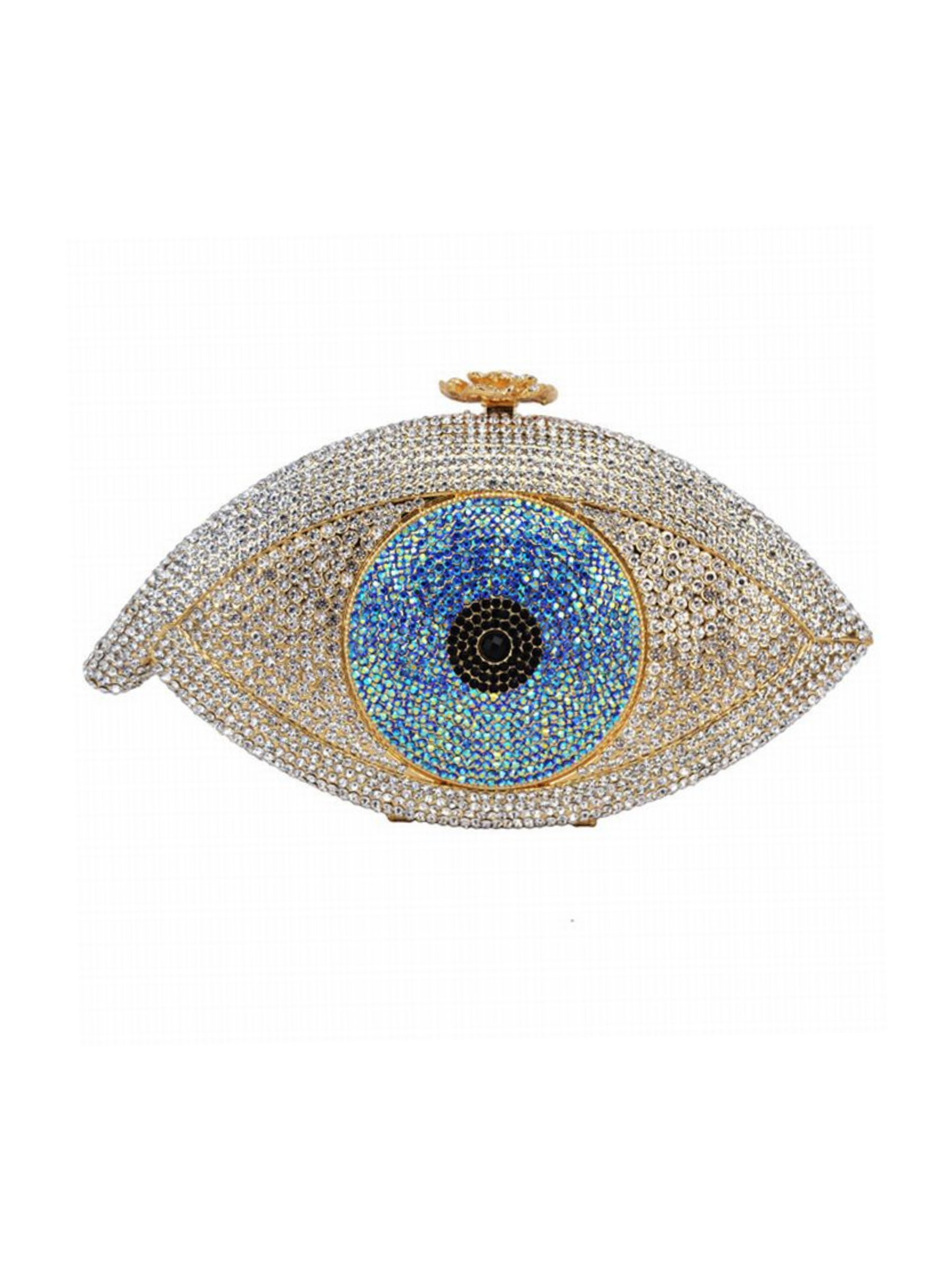Radiant and symbolic, the Crystal Aura Eye Clutch is fully adorned in precision-set crystals and centered with an intricate eye motif that commands attention. The structured silhouette features a secure closure and a removable chain, allowing it to be carried as a statement clutch or worn effortlessly on the shoulder.