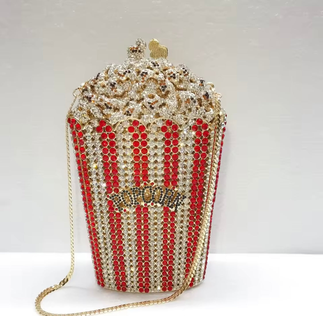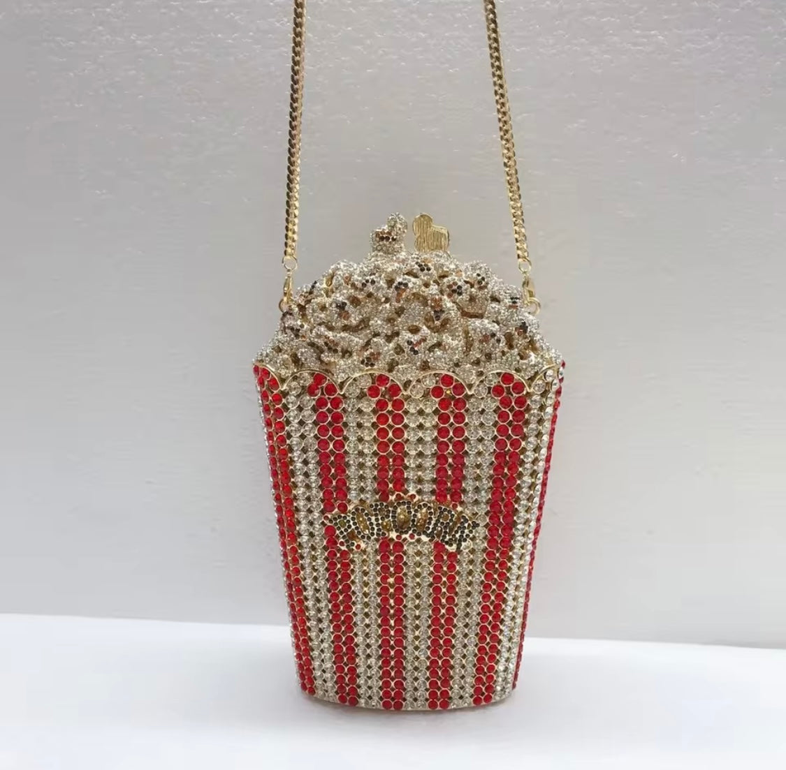 Bold and unforgettable, the Crystal Cinema Pop Clutch reimagines a classic silhouette with a fully crystallized exterior that captures light from every angle. The structured design features a secure closure and a detachable chain, allowing it to be carried as a statement clutch or worn effortlessly on the shoulder.