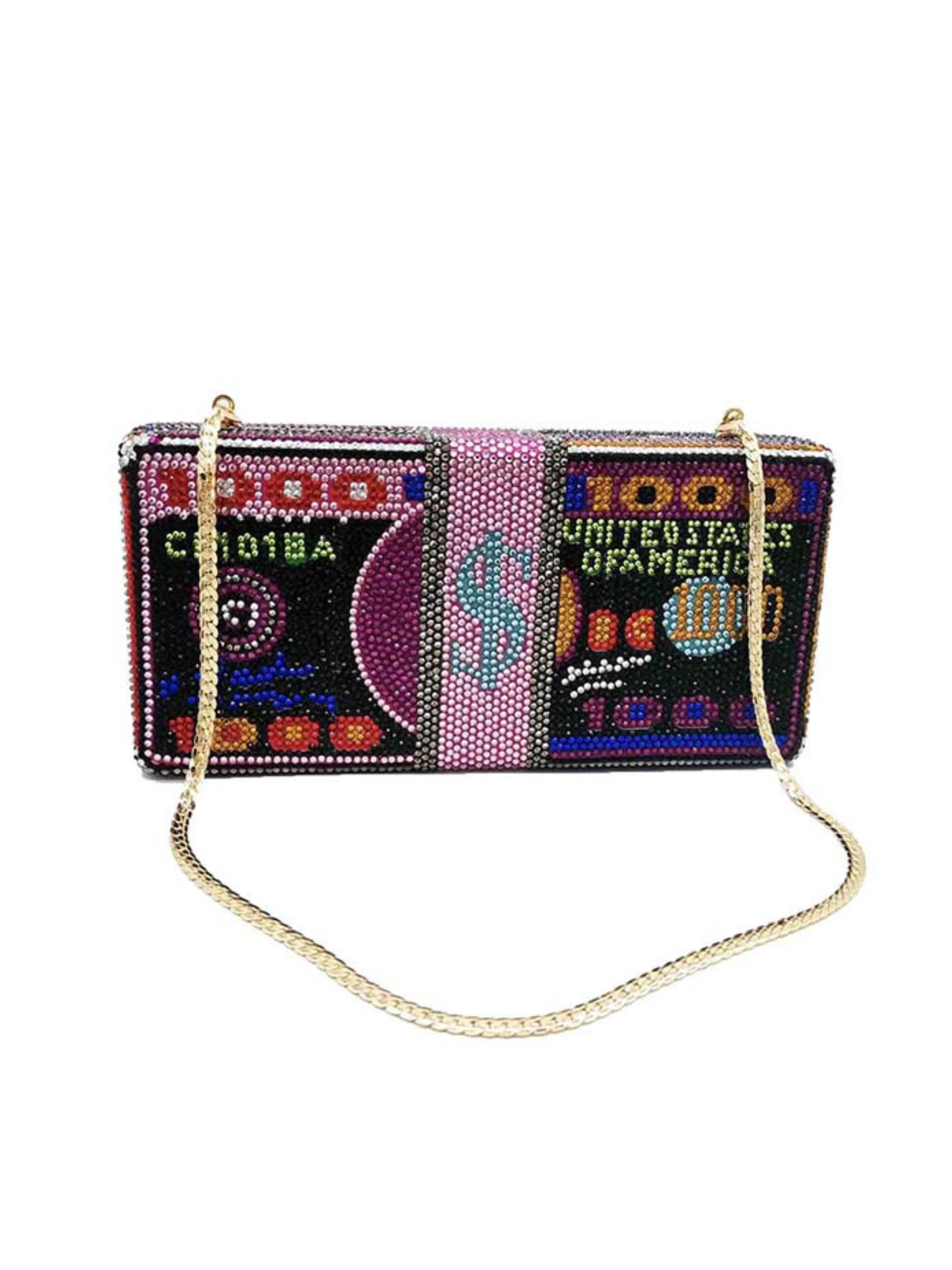A bold symbol of prosperity and glamour, the Crystal Reserve Money Clutch is sculpted in the silhouette of stacked currency and fully encrusted in radiant crystals. The structured hard-shell design features a secure clasp closure and a removable chain, allowing it to be carried as a statement clutch or worn on the shoulder.