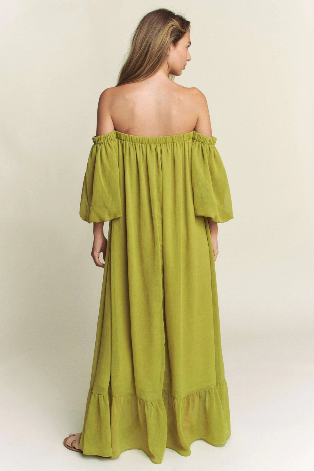 GOLDxTEAL chartreuse off the shoulder maxi dress. Gorgeous green off the shoulder maxi dress with ruffle hemline.