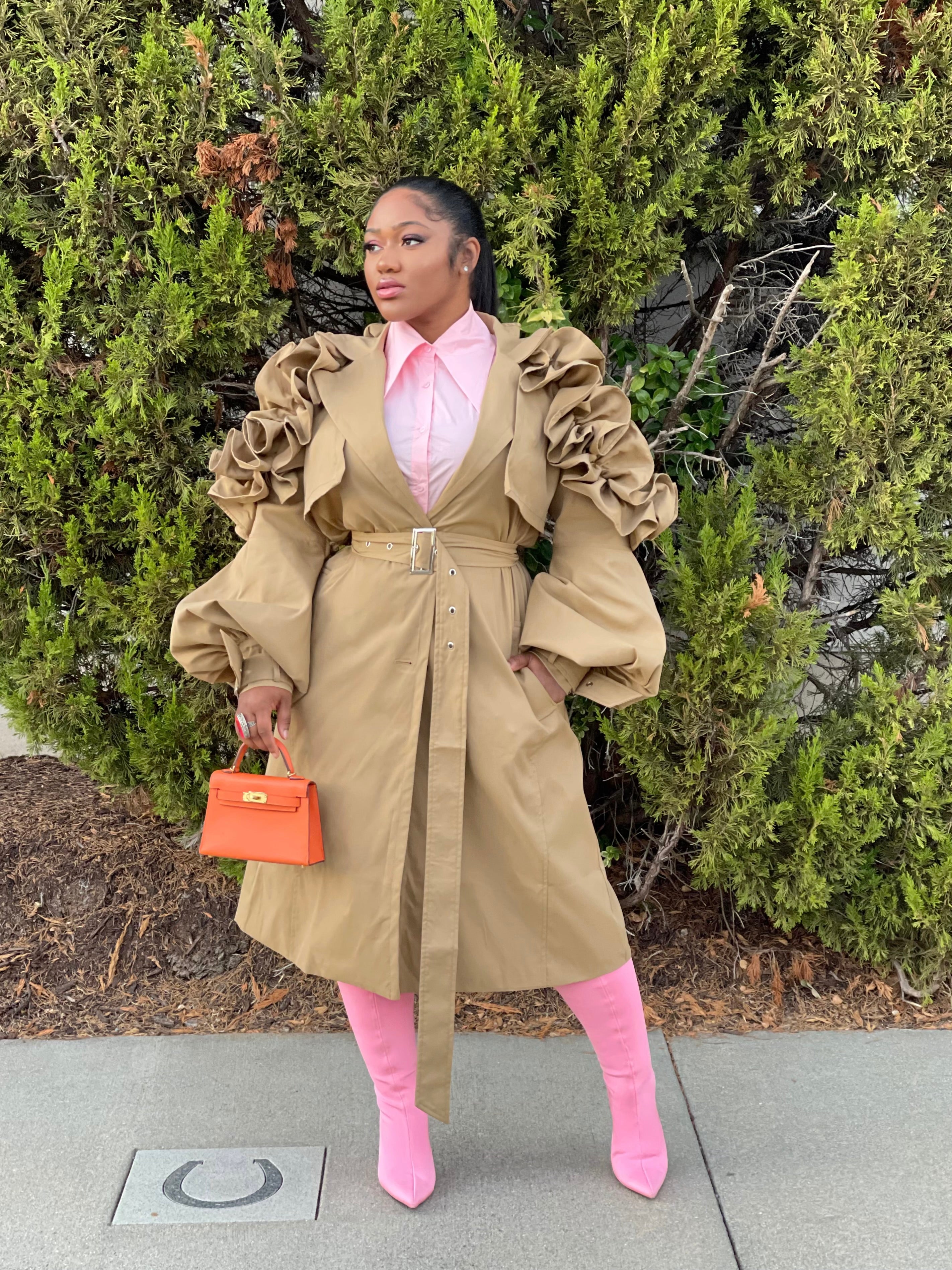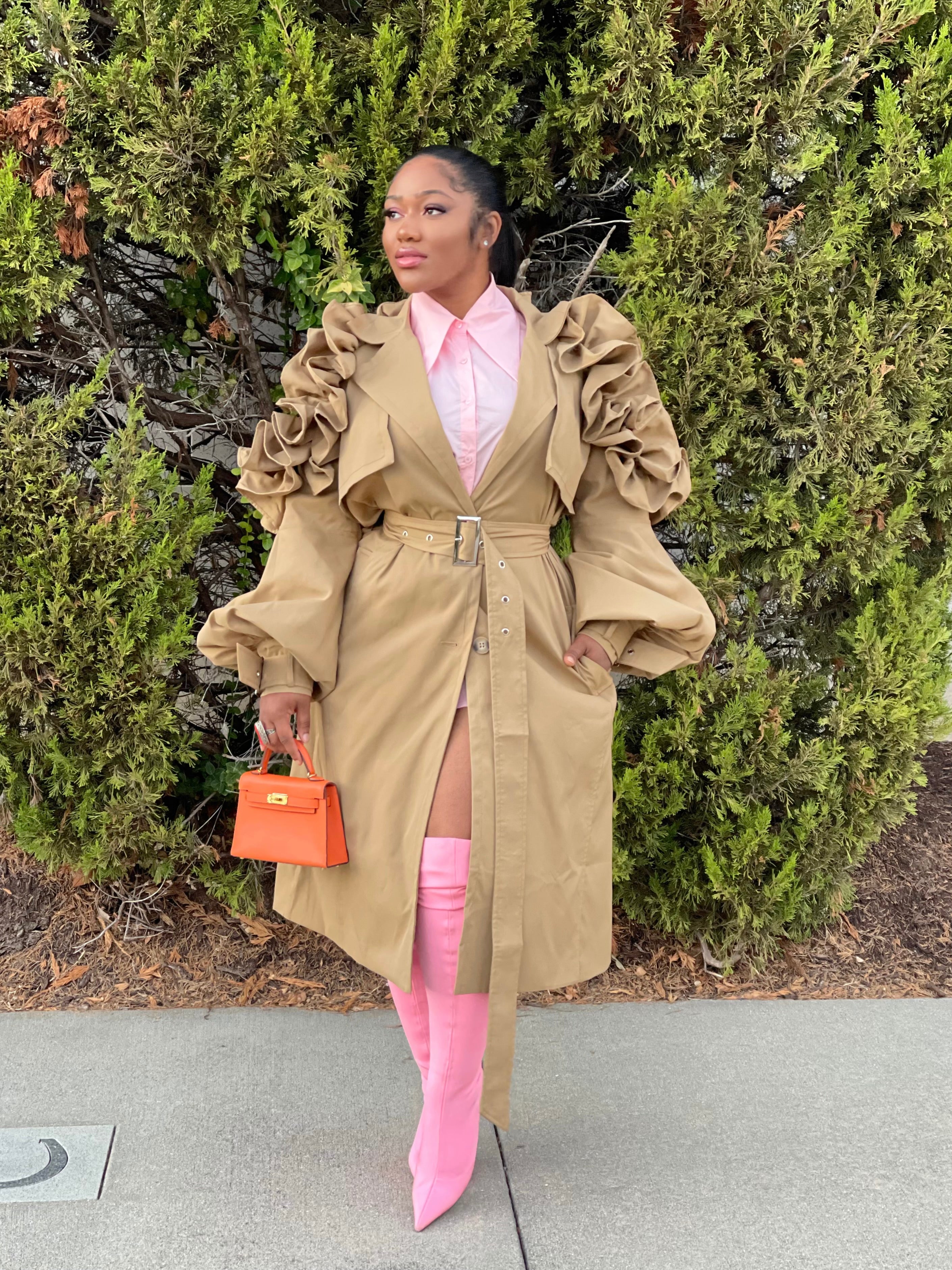 She's back! The forever trench—elevated. This sculptural coat marries clean tailoring with dramatic, ultra-feminine ruffles and artfully structured sleeves for a silhouette that moves with quiet power. A self-tie belt cinches the waist, while discreet side pockets keep the look refined and functional. Wear it open for effortless drape or belted for hourglass definition—either way, it turns every entrance into a moment.