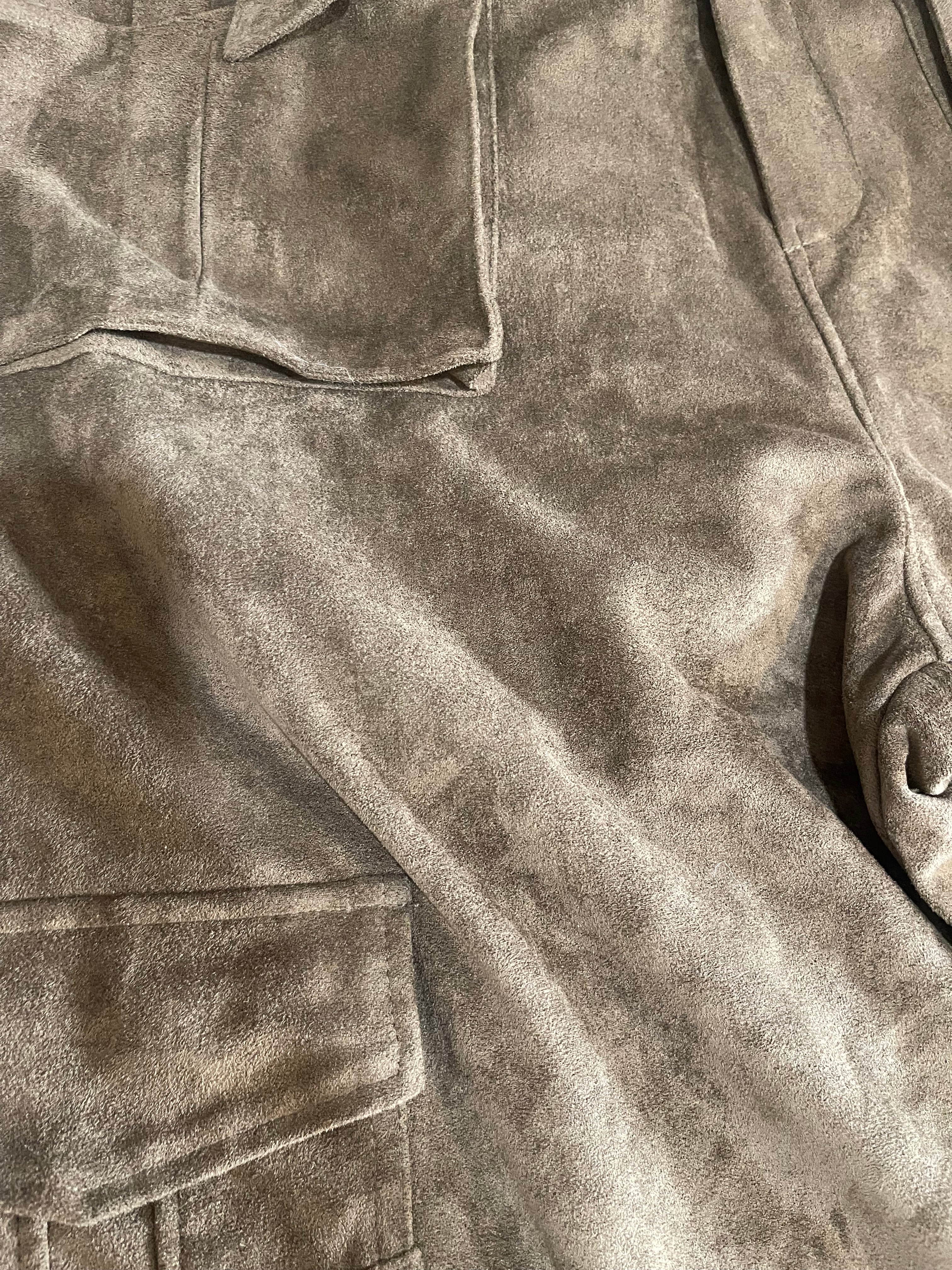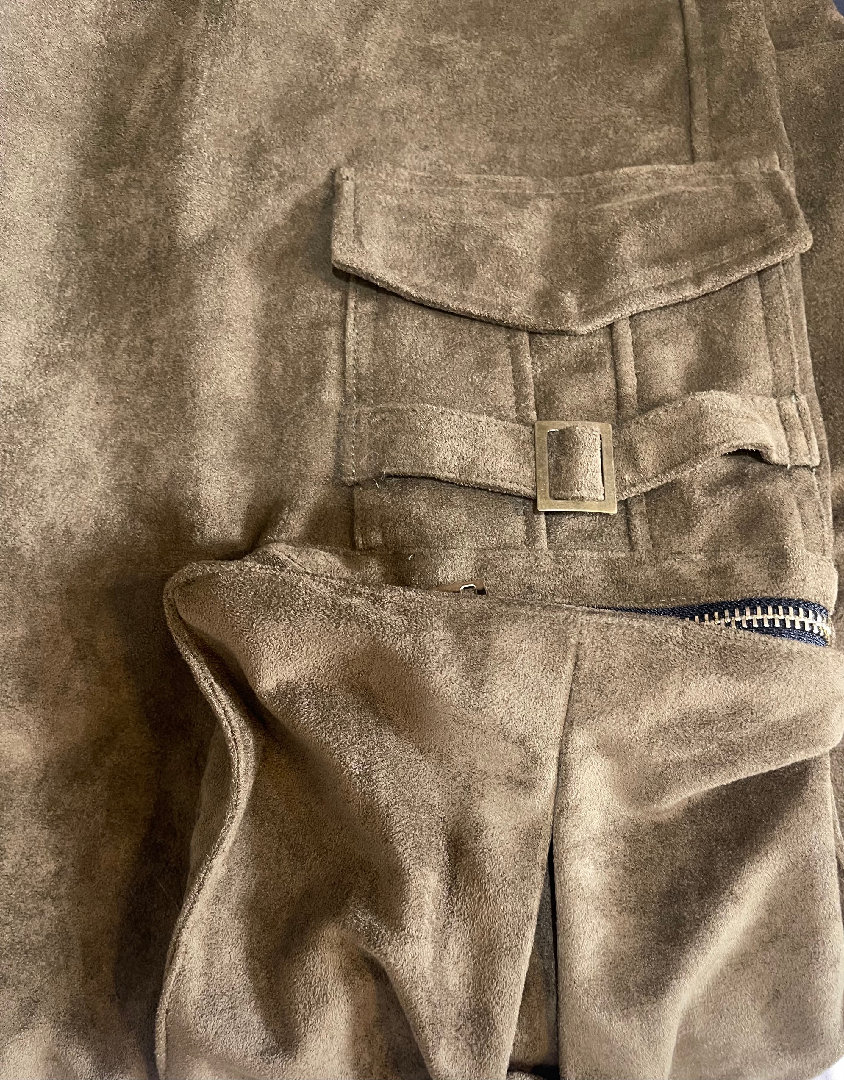 These opulent Mocha Vegan Suede Pants are a must. Impeccably crafted in soft, supple vegan suede, these wide-leg pants boast a pleated cargo pockets adorned with stylish tassels and light gold and silver tone hardware. The front zip/button closure and bottom zippers add a touch of flair to this versatile, sophisticated yet edgy silhouette.